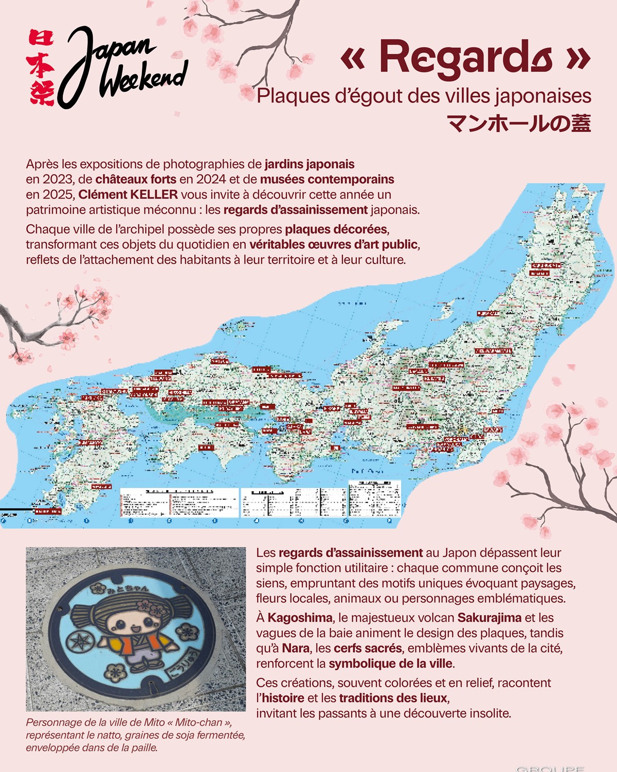 Dans le cadre de Japan Weekend 2026 à Strasbourg sont exposées des photographies des plaques d’égout de diverses villes japonaises. Ces plaques sont aussi appelées en japonais マンホールの蓋 et en anglais manhole cover.