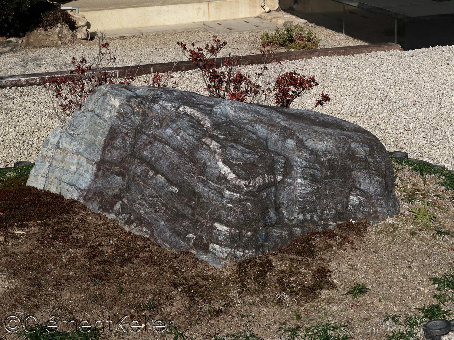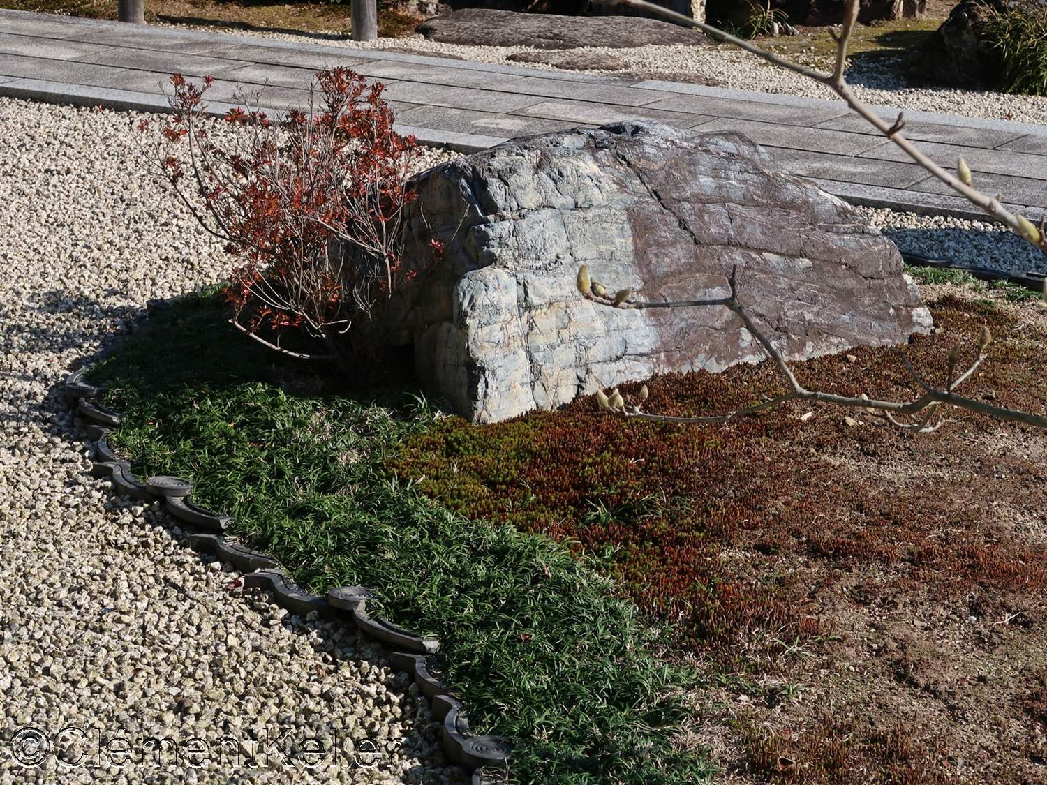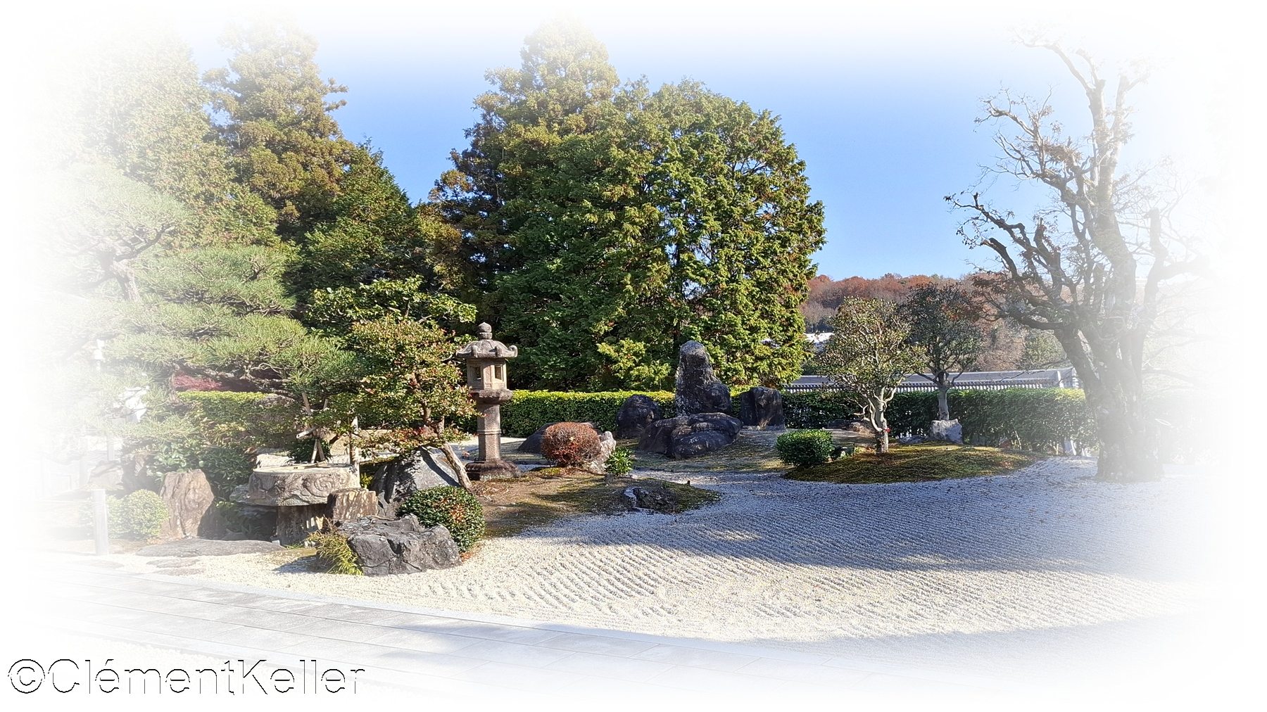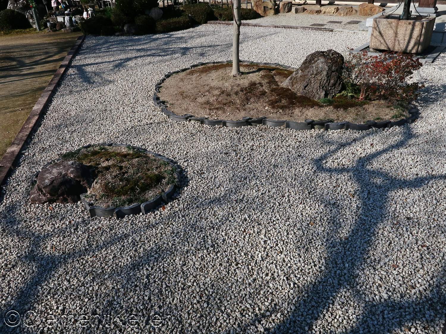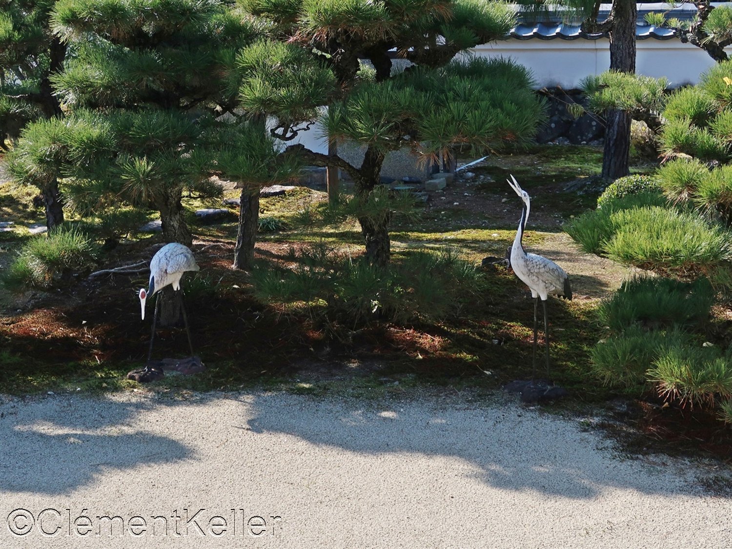 La composition articule des masses de cèdres taillés, des nappes de mousse évoquant des rivages, des lignes de sable ratissé figurant des vagues, des pins noirs structurants, pins « matsu » 松, un bassin d’ablution « chōzubachi » 手水鉢, et des lanternes de pierre, lanternes « tōrō » 灯籠.