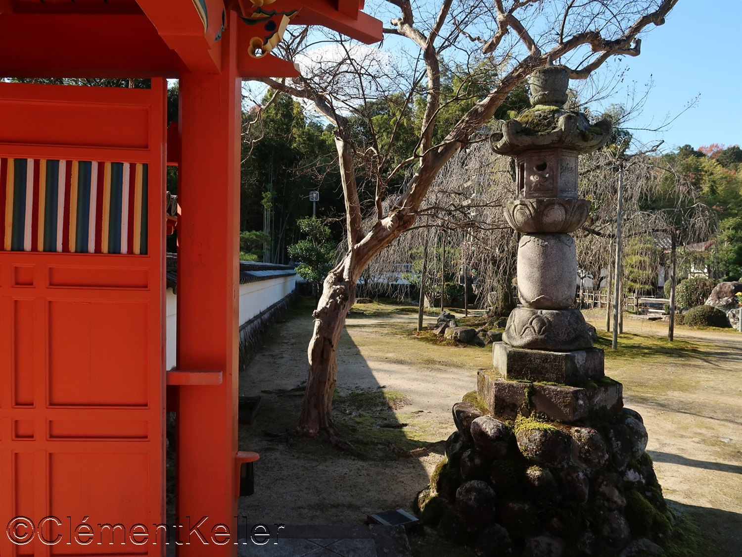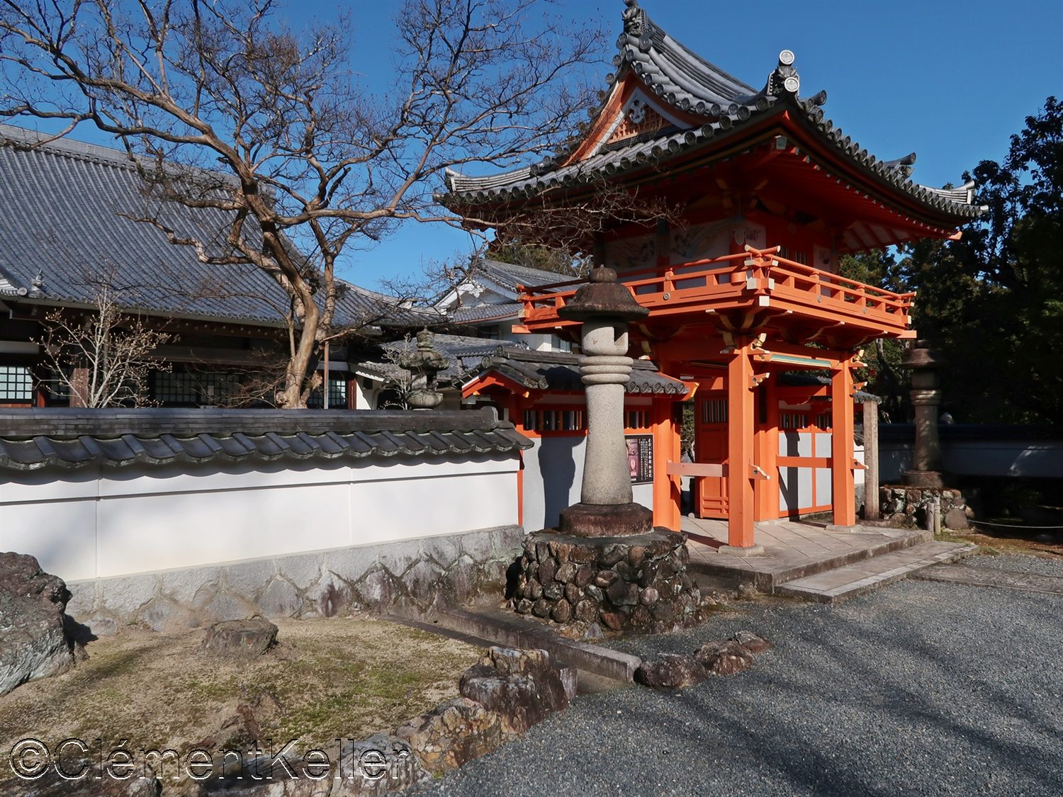 L’accès s’effectue par une porte peinte en rouge vermillon, « sanmon » 三門, une singularité régionale de la région historique du Tōnō 東濃 (territoire à l’Est de la préfecture de Gifu, à la frontière de la préfecture d’Aichi).