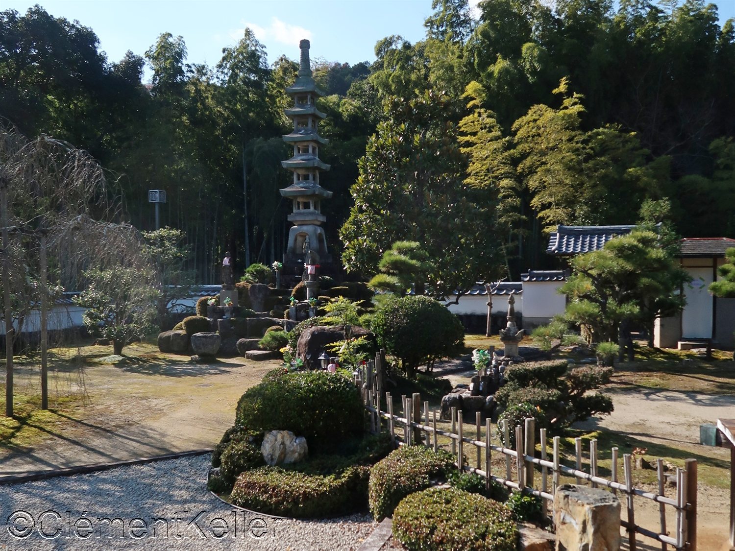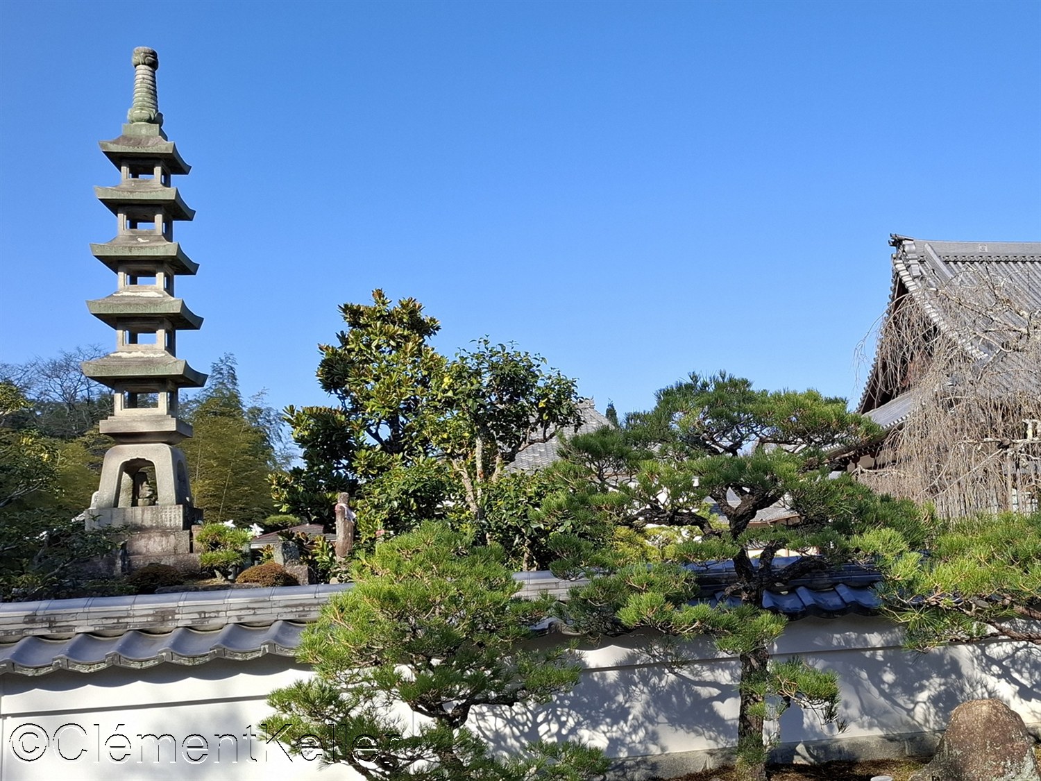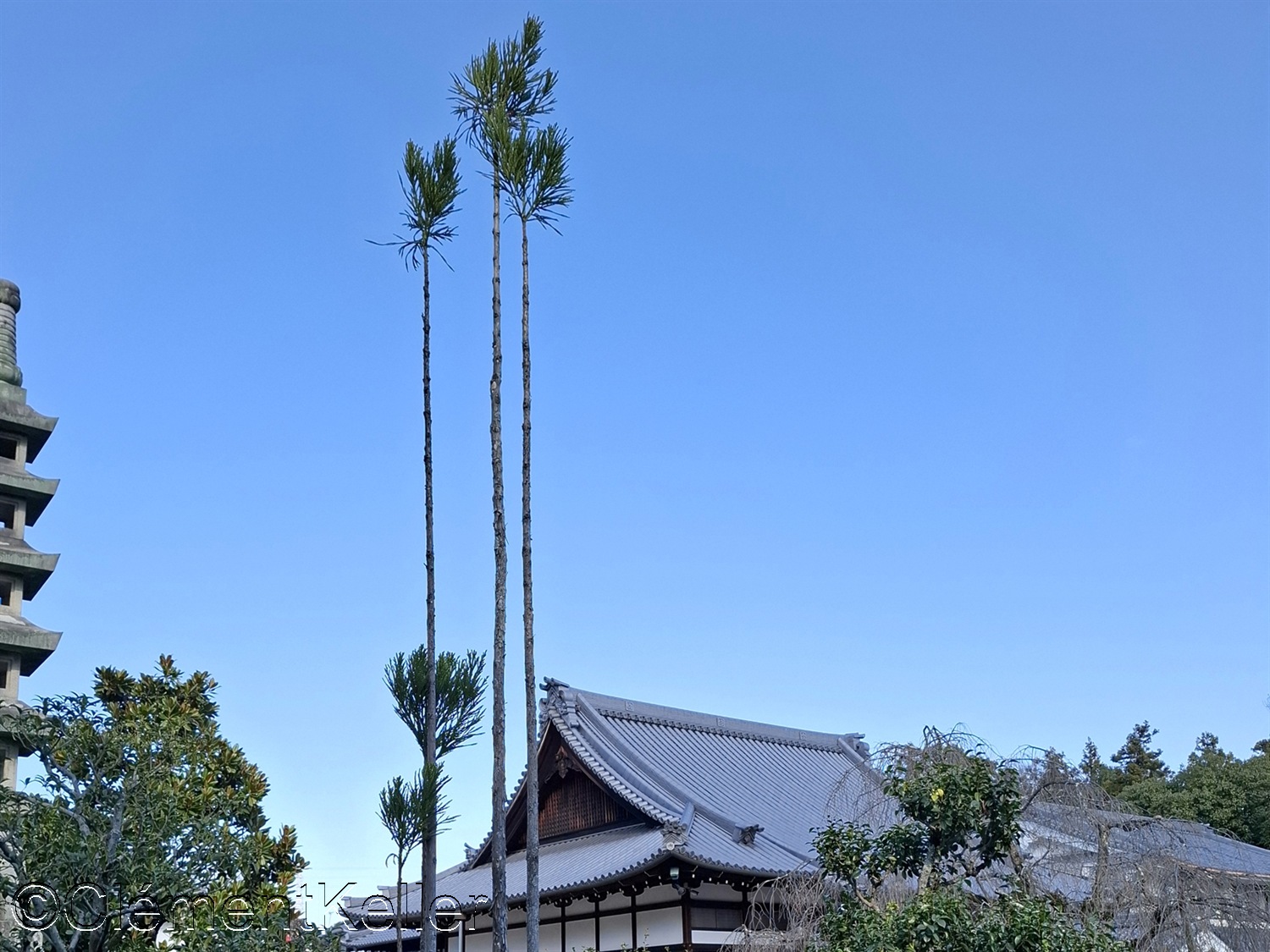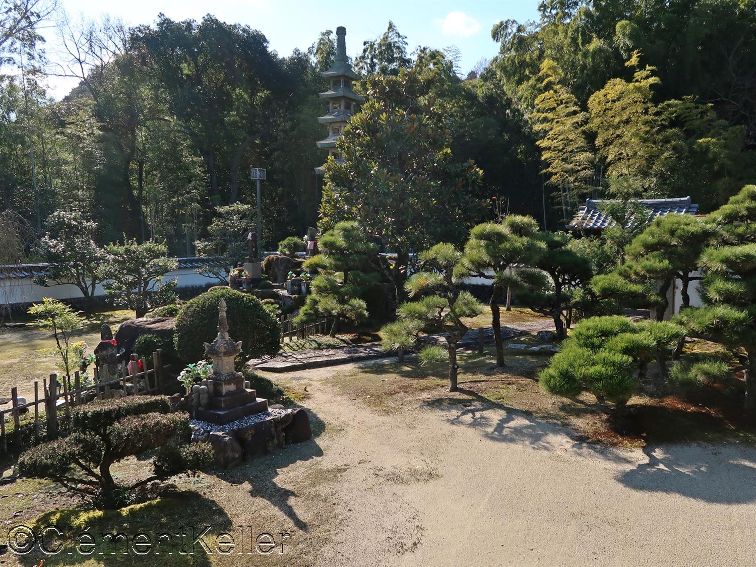 Vues de la pagode Senrei-tō et des pins taillés en « daizuki ».
