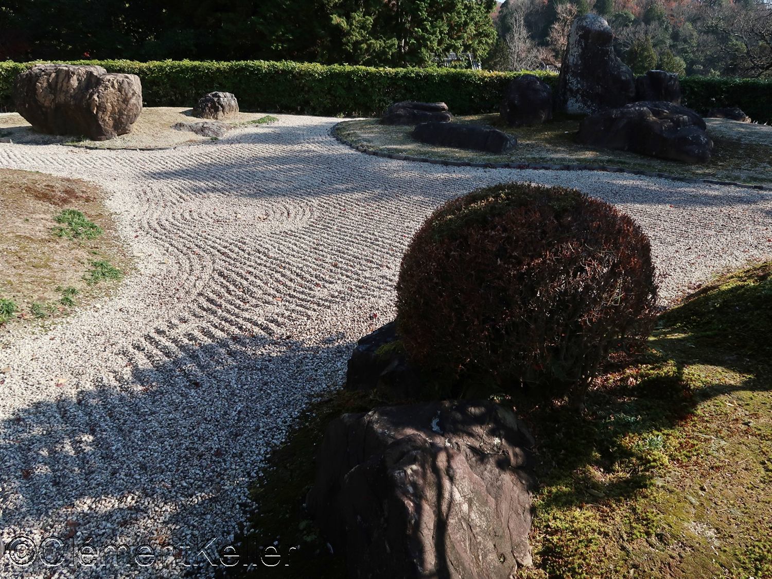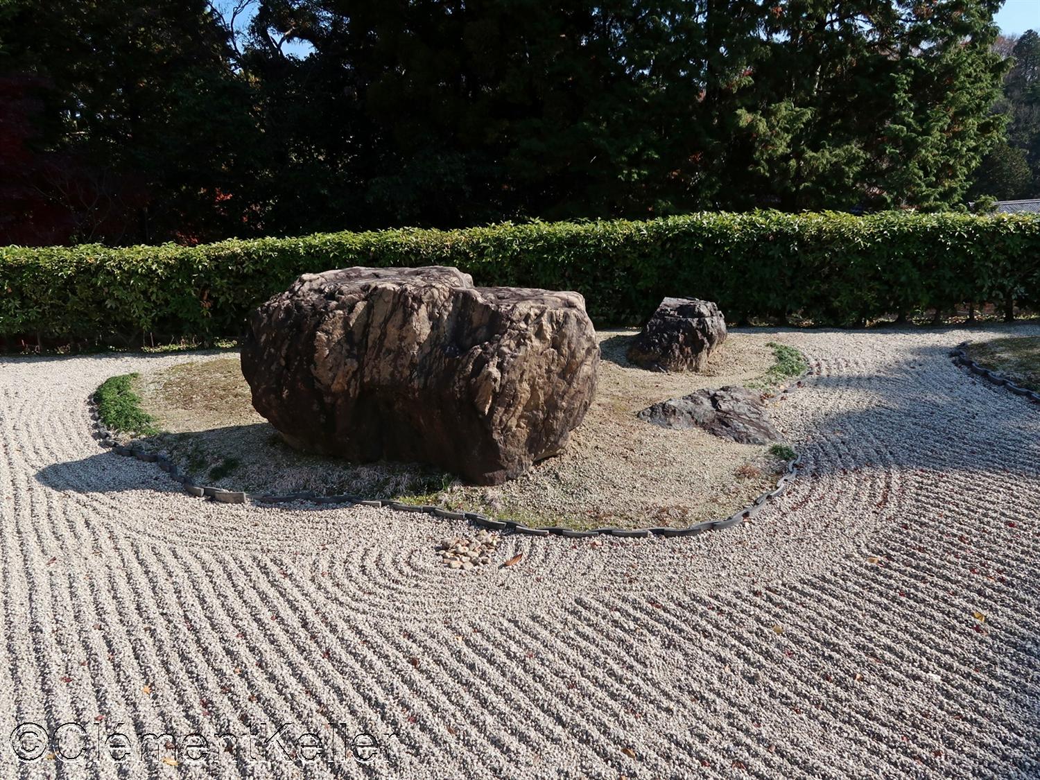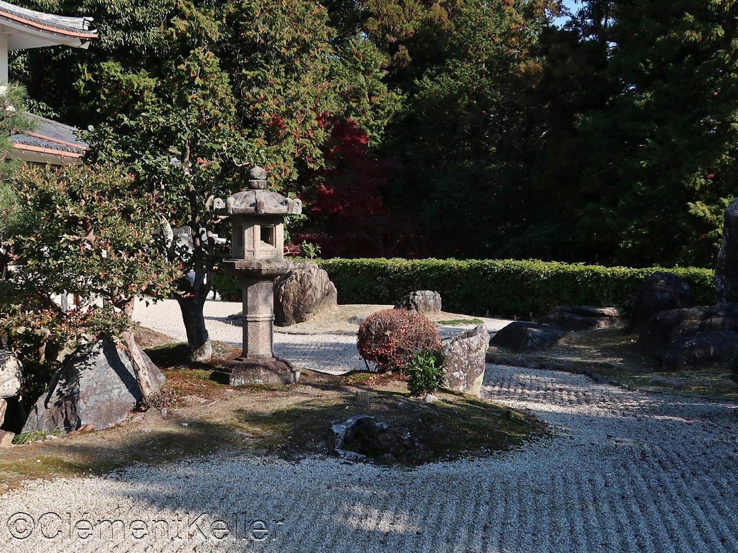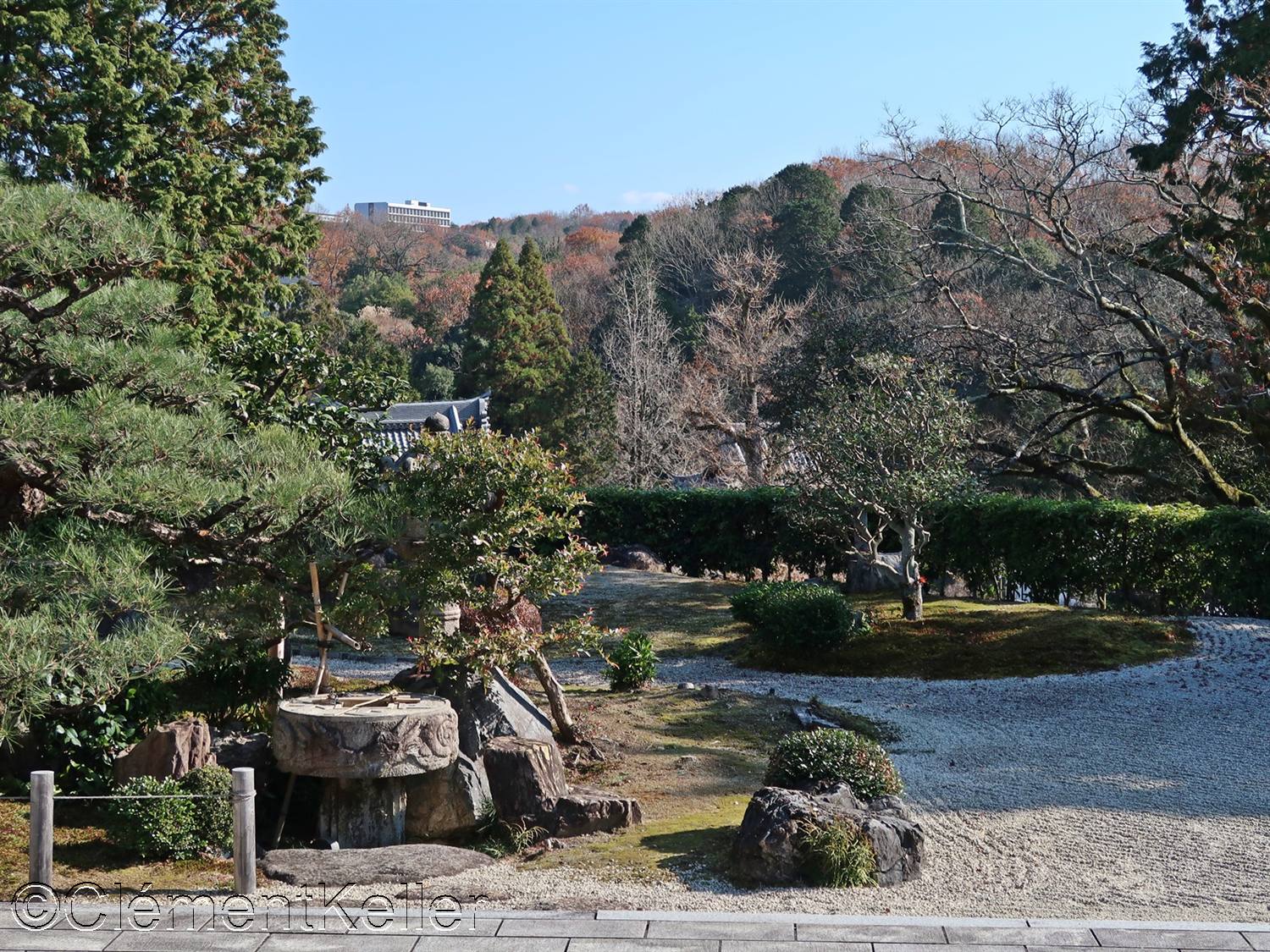 Le jardin principal fut aménagé vers 1933 sous la direction de Matsuo Sōshō 松尾宗松 (1898-1975), maître de la lignée de l’école paysagère Matsuo-ryū 松尾流. Il s’agit d’un jardin sec de contemplation, « karesansui » 枯山水, combiné à des zones de mousse et à un emprunt de paysage, « shakkei » 借景, intégrant les reliefs boisés du mont des Immortels Hōraizan 蓬莱山.