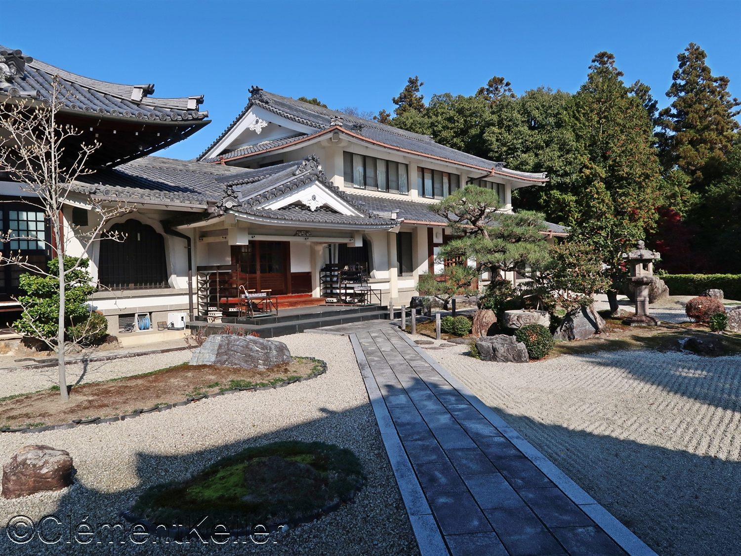 Le temple est composé du pavillon principal, « hondō » 本堂, à droite, d’un pavillon secondaire, à l’arrière, de la salle du fondateur, « kaisan-dō » 開山堂 et plus à gauche, de la salle des tablettes commémoratives, « ihai-dō » 位牌堂. Le bâtiment résidentiel des moines, « kuri » 庫裏, fut reconstruit dans les années 1930. À l’arrière se trouvent le pavillon d’étude, « shoin » 書院 et un pavillon de thé « chashitsu » 茶室 intégrés à la composition paysagère moderne.