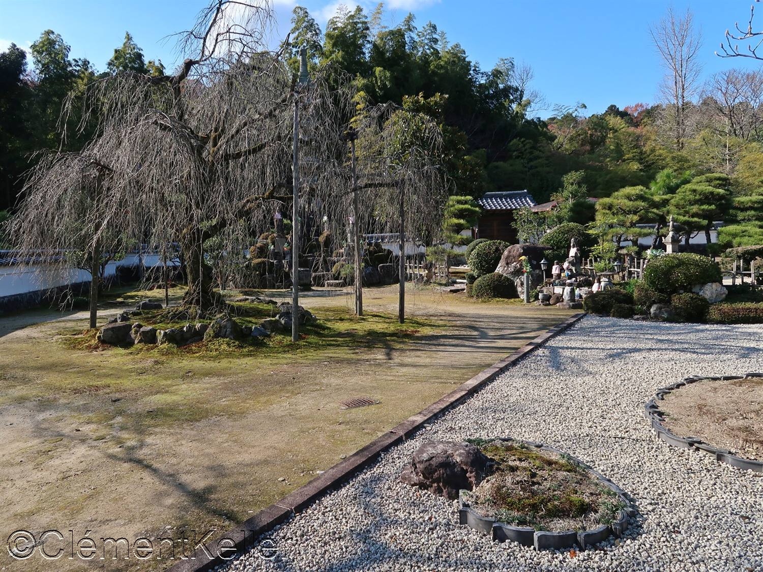 Au printemps, un cerisier pleureur, « shidare-zakura » 枝垂桜, attire le regard et en été, les mousses et l’ombre des pins apportent de la fraicheur.L’ensemble conjugue l’héritage médiéval et sa réinterprétation du XXème siècle, inscrivant le temple Hōju-in dans une continuité spirituelle et paysagère.