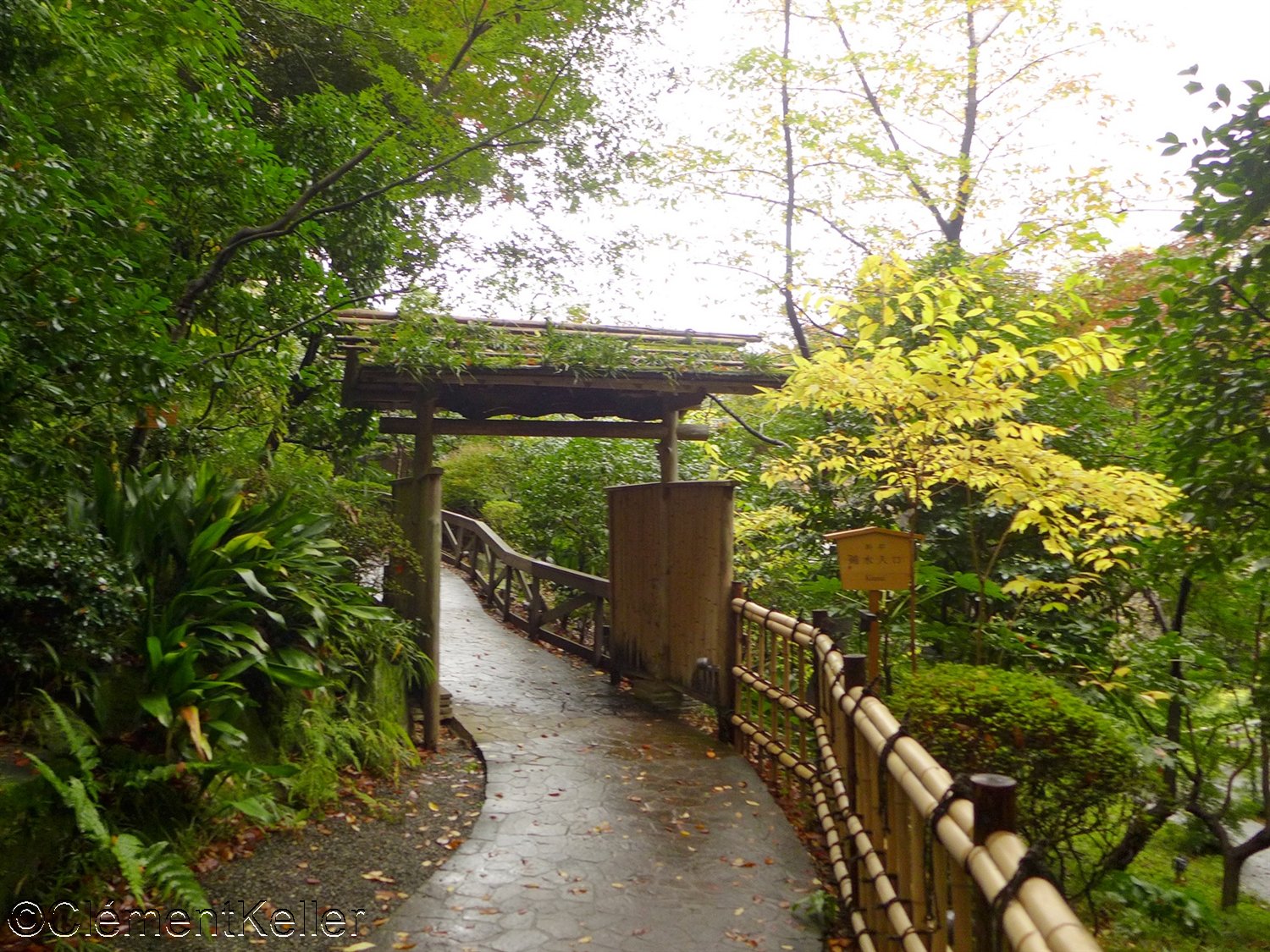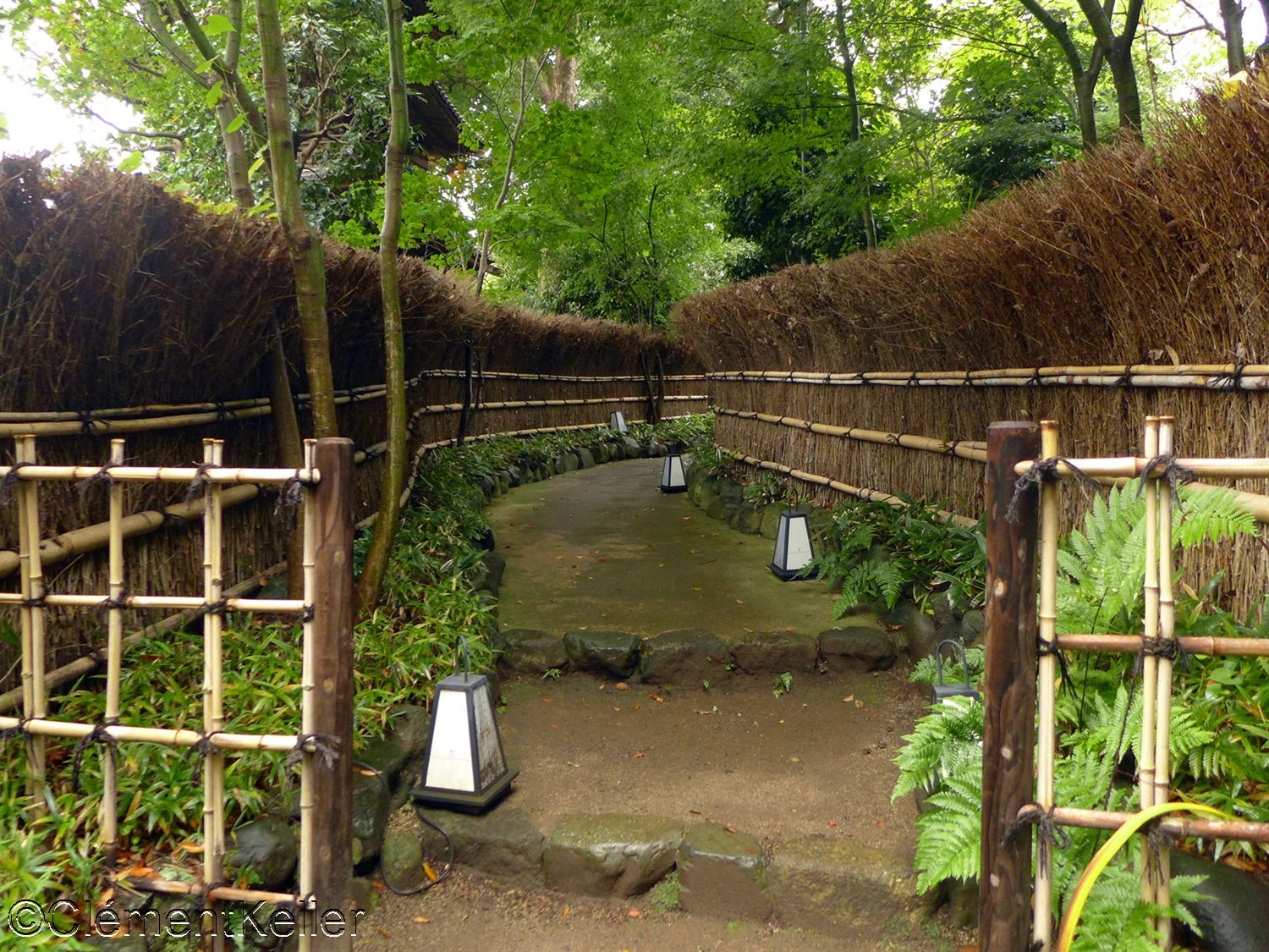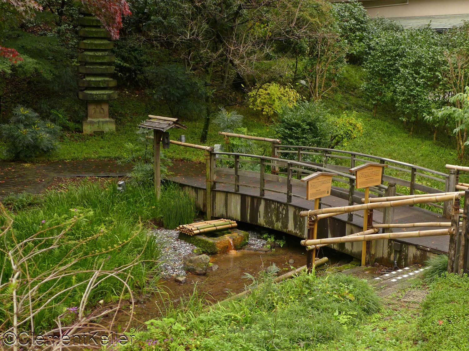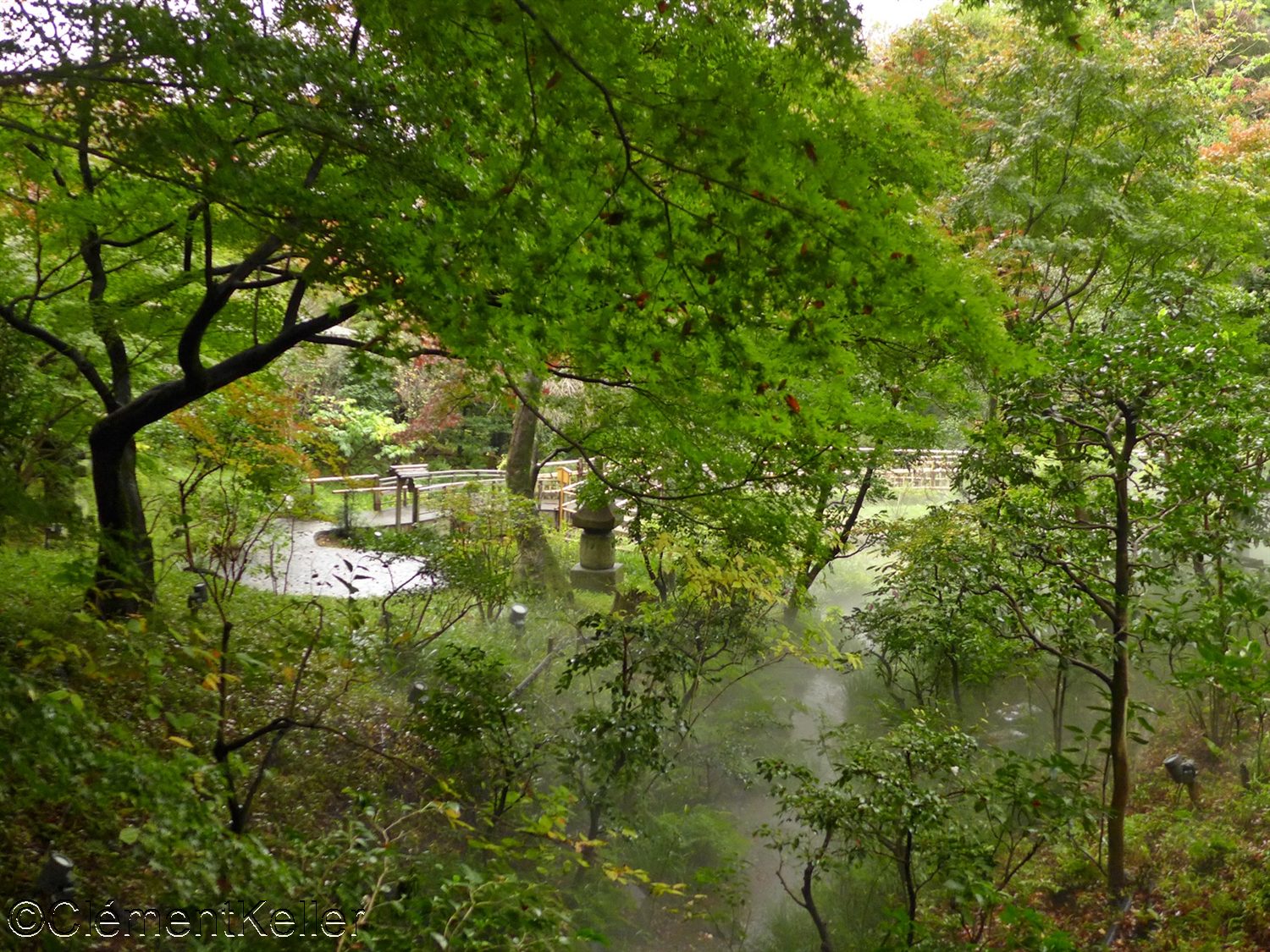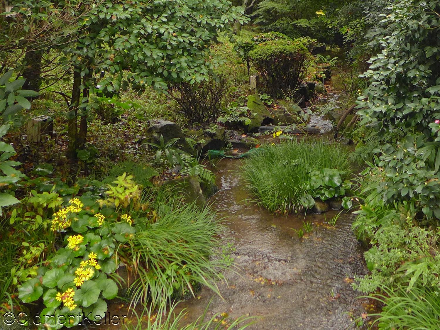 Les nombreux cheminements, pont et ruisseaux et les constructions et artefacts implantés dans le jardin.