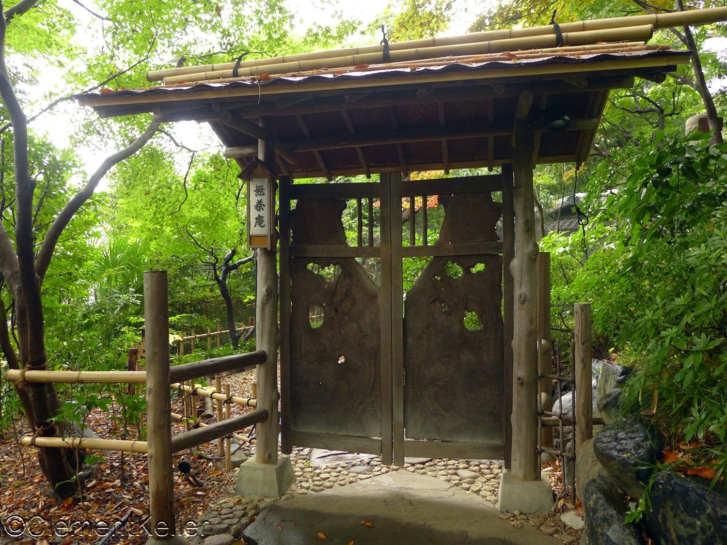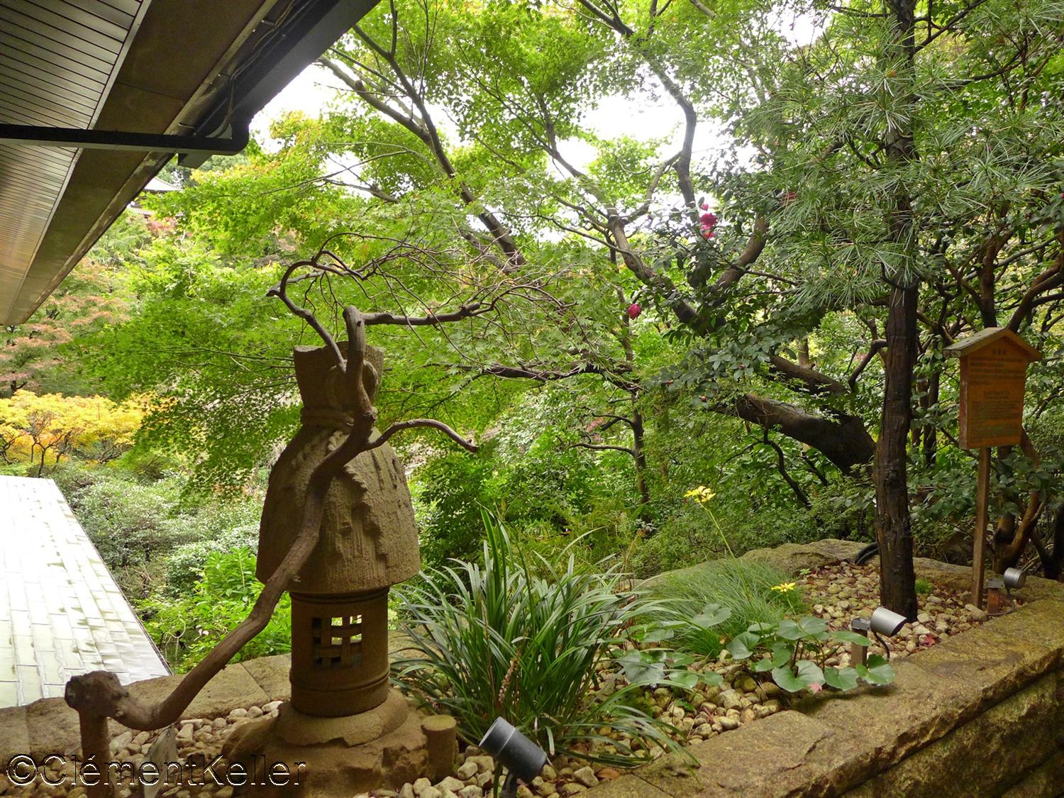 Dans le jardin, ont été installés la maison de thé Zangetsu 残月, déplacée en 1947, un petit sanctuaire Shiratama Inari Jinja 白玉稲荷神社, de nombreuses lanternes de pierre dont certaines remontent à l’époque Kamakura (1192-1333) et différentes stèles et statues bouddhiques.