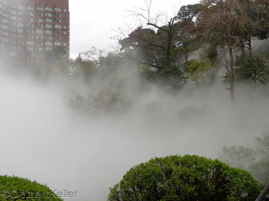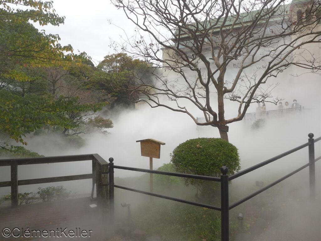 Les forts reliefs créent des scènes différenciées et la vaporisation artificielle provoquée sur le bassin entouré des petites cascades Gojo 五丈滝 formant un cirque à l’extrémité nord du jardin apporte une atmosphère mystérieuse.