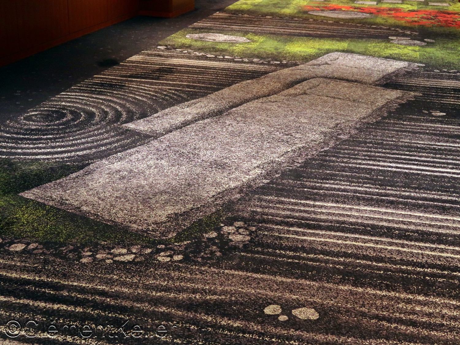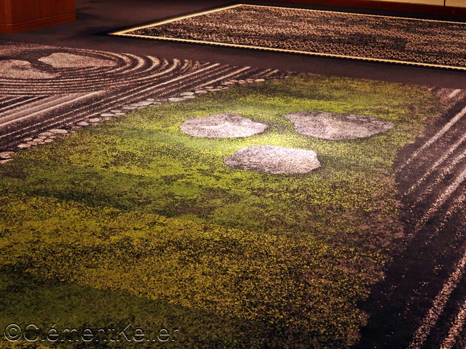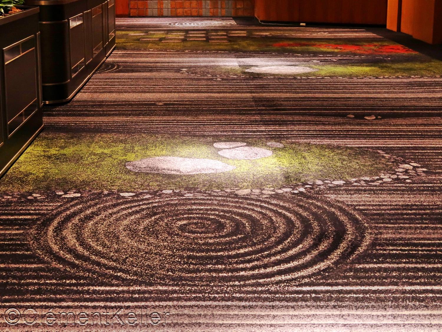 Les couloirs du complexe sont couverts d’une moquette aux motifs de jardins japonais.