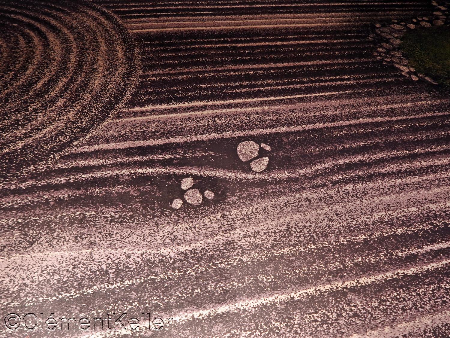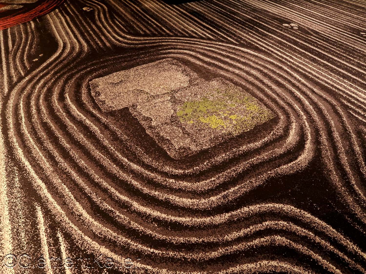 Dans le jardin de New Otani, cette influence apparaît clairement dans la combinaison du gravier blanc, «shirasuna» 白砂, et de larges surfaces engazonnées, qui créent un contraste subtil entre textures minérales et végétales.
