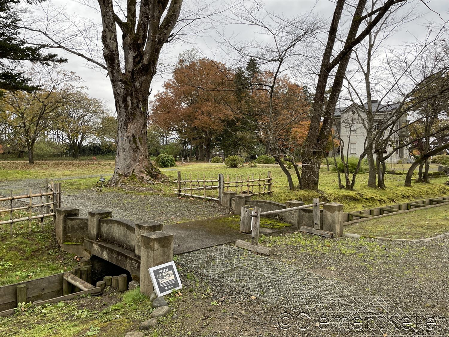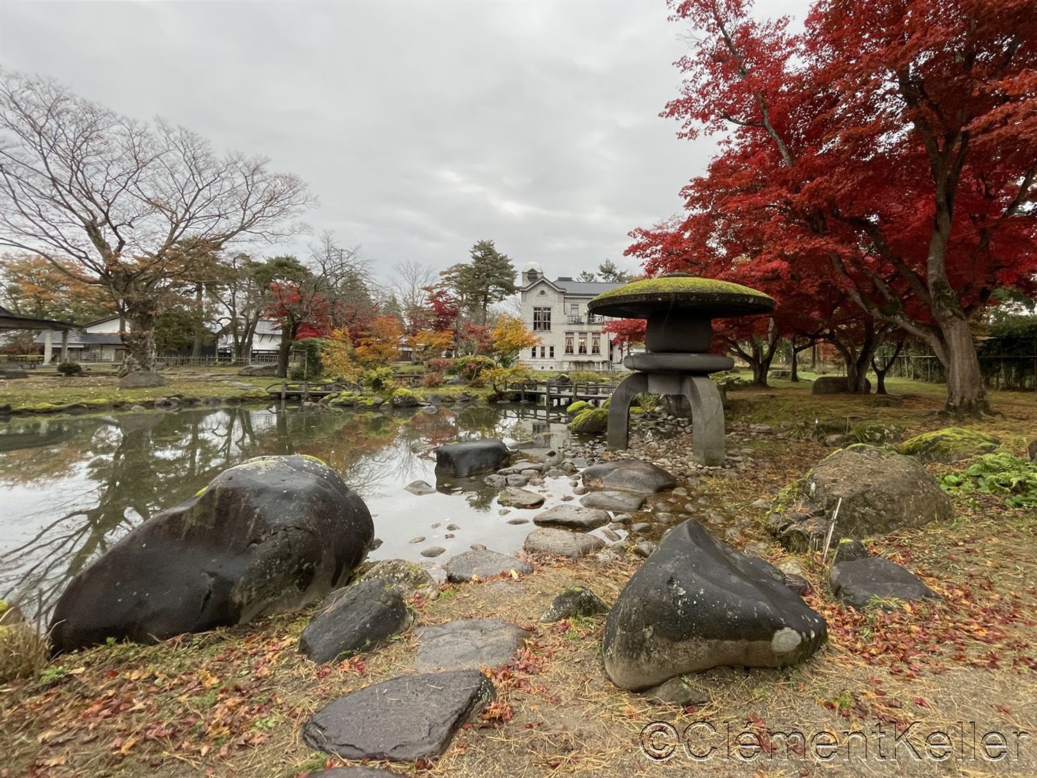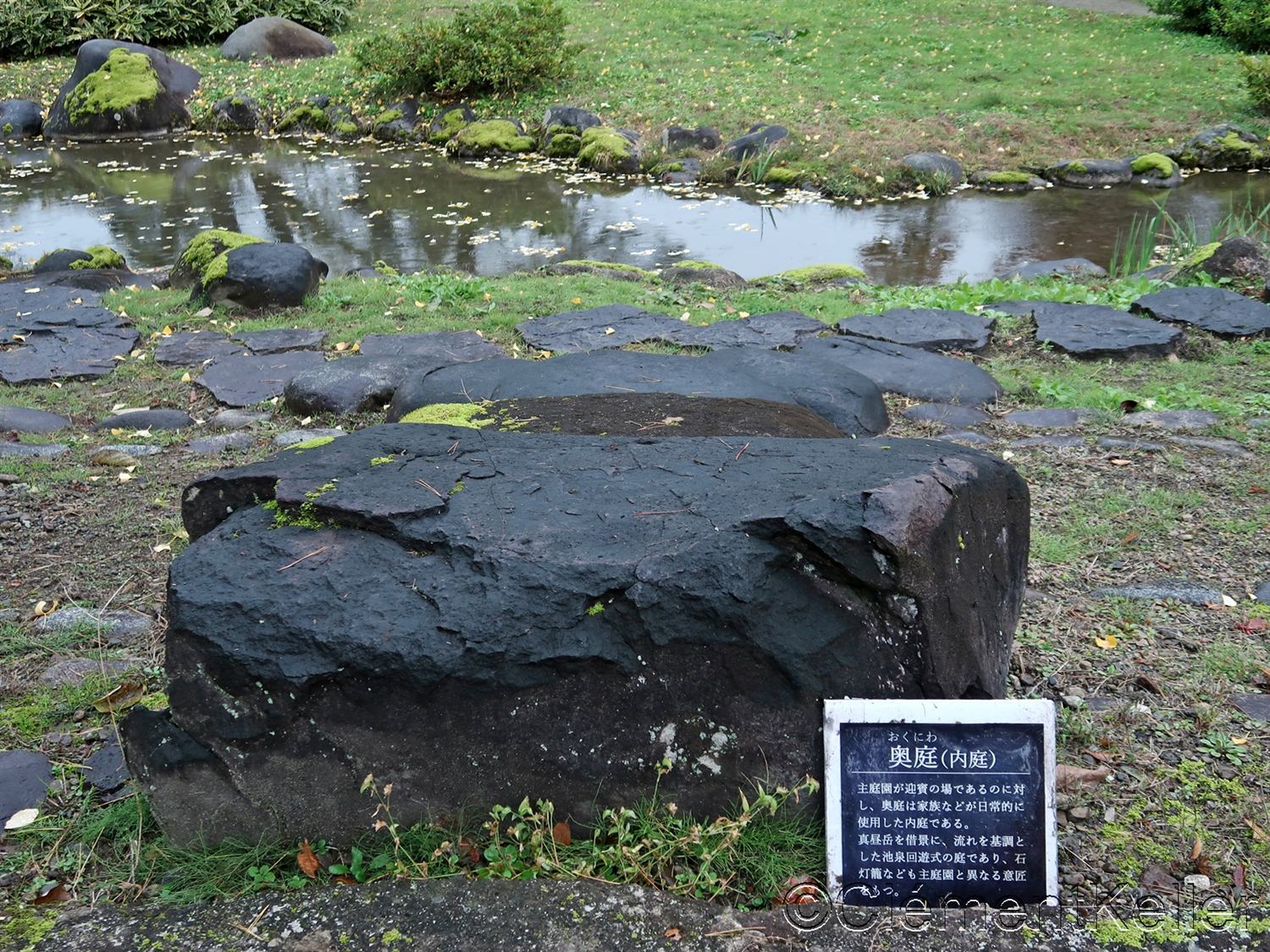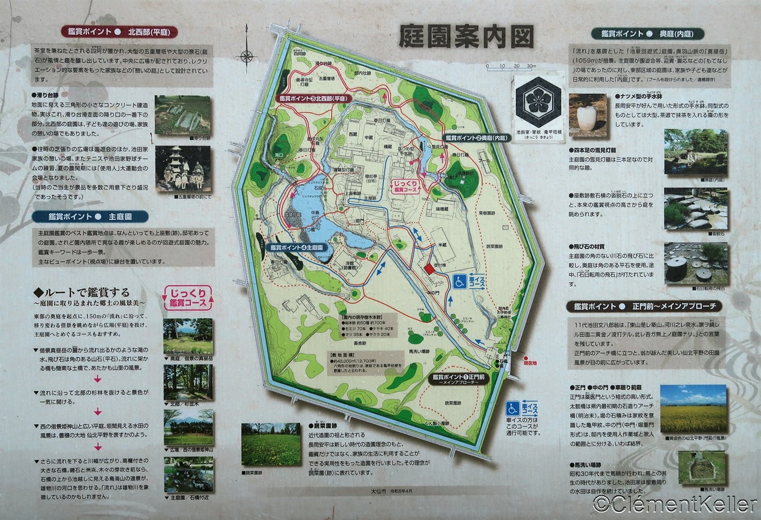 Le jardin du clan Ikeda 池田氏庭園 est un vaste jardin de promenade, « chisen-kaiyū-shiki teien », aménagé à la fin de l’ère d’Edo et complété au début de l’ère de Meiji. La famille, qui était à l’origine une famille de samouraïs de la province de Settsu, s’était installée dans la province de Dewa au début de la période Edo, devenant propriétaires fonciers et agriculteurs. Les membres du clan firent fortune au moment de la restauration de Meiji, se classant parmi les trois plus grands propriétaires fonciers de la région de Tōhoku et s’engagèrent dans des oeuvres de bienfaisance et de mécénat dans les arts.