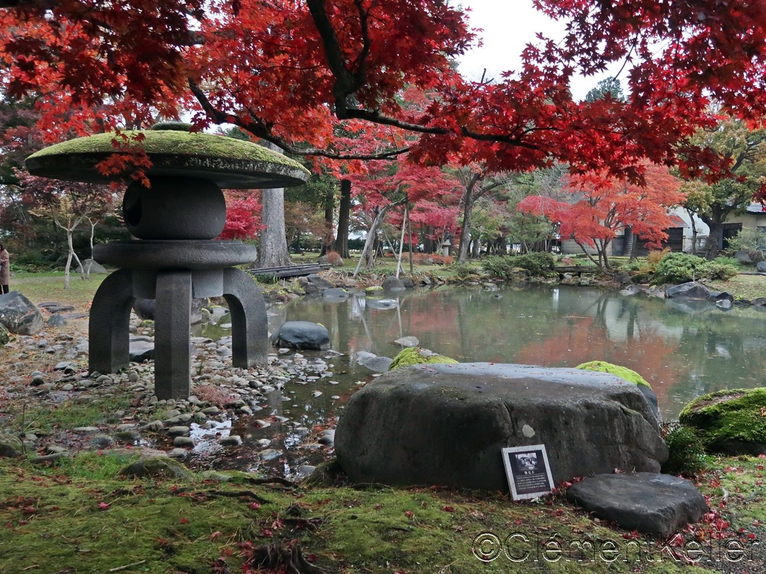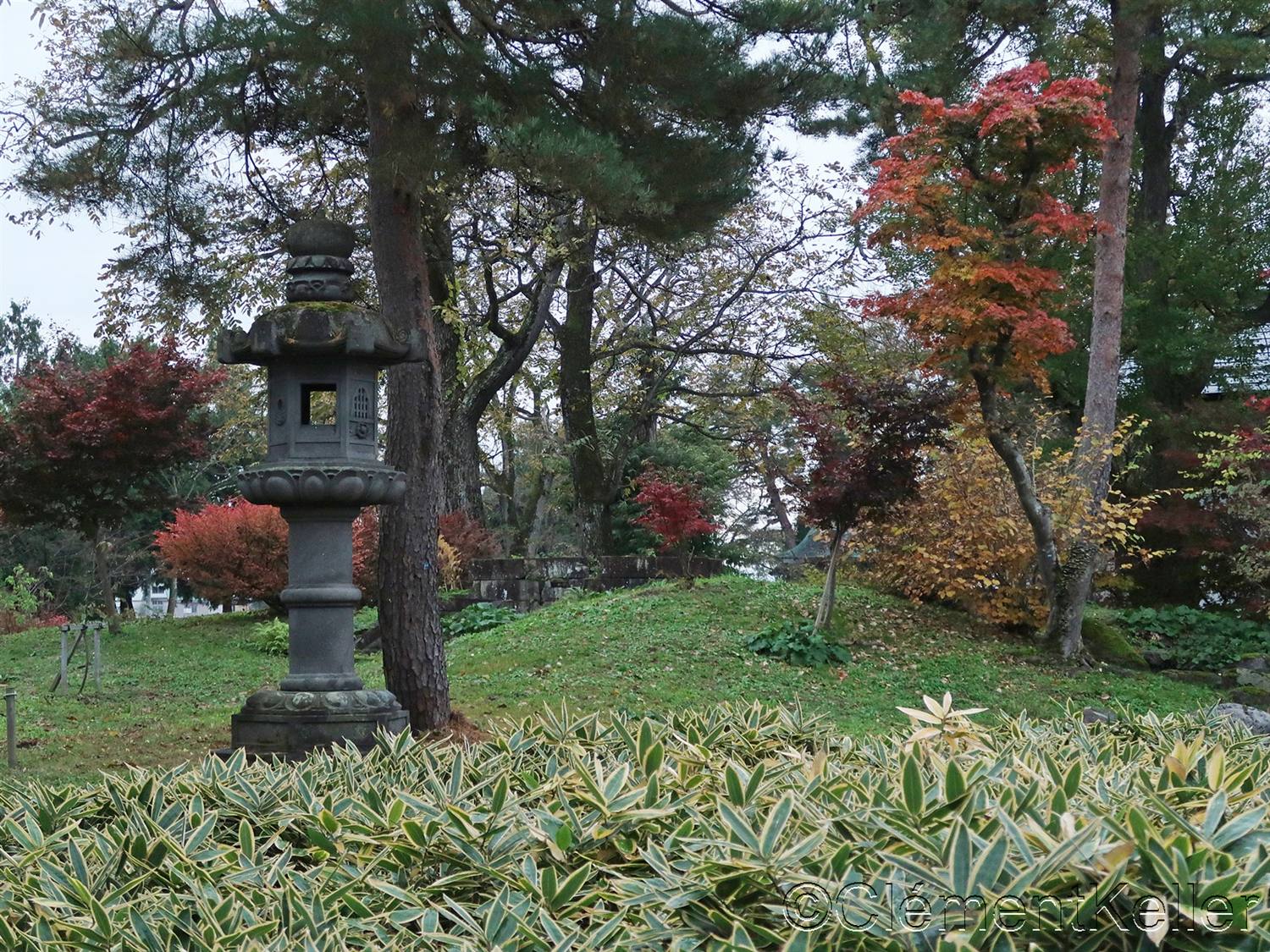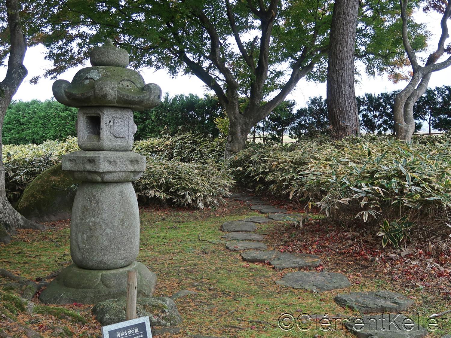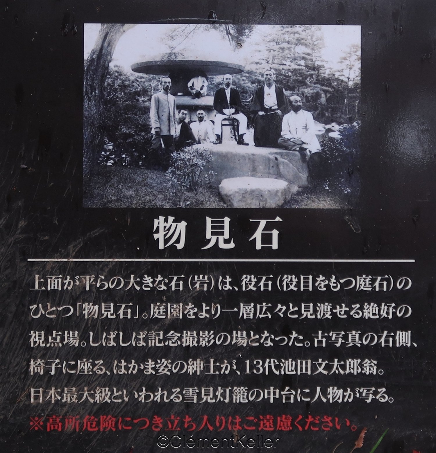 La zone située à côté de la maison occidentale, « yōkan » est organisée autour d’un large étang, « chisen ». On y trouve plusieurs lanternes, « yukimi-dōrō », en granit, de faible hauteur, placées autour de l’étang. Leur large chapeau circulaire, soutenu par un fût court, favorise les reflets sur la surface de l’étang. Certaines présentent un pied en forme de jambe arquée, « koma-ashi », typique des lanternes de rivage de la fin de l’époque d’Edo. En arrière de cette zone se dresse l’imposante lanterne en pierre « yukimi-dōrō » provenant de la péninsule d’Oga. Il s’agit d’un des éléments les plus remarquables du jardin. Le terme yukimi-dōrō 雪見灯籠 signifie littéralement : 雪 (yuki) : neige 見 (mi) : regarder, admirer 灯籠 (dōrō) : lanterne, et par conséquent lanterne pour admirer la neige. Elle dispose d’un toit très large et débordant, pensé pour accueillir la neige tombée et en souligner visuellement l’épaisseur. Lorsque la neige s’accumule sur le chapeau de la lanterne, celle-ci devient un élément central du paysage hivernal. Cette lanterne fut mise en place en 1896 à l’initiative du chef du clan Ikeda de l’époque, Ikeda Yasuyuki 池田保之 (1856–1920), afin de manifester le prestige familial et la modernisation de la propriété à l’ère de Meiji. Taillée dans un granit massif, elle atteint environ 4,5 mètres de hauteur et 4 mètres de diamètre pour un poids estimé à plusieurs dizaines de tonnes, ce qui en fait l’une des plus grandes lanternes de jardin du Japon. Son transport et son assemblage représentèrent un véritable exploit technique, mobilisant artisans et ouvriers locaux pendant plusieurs mois. Par sa taille et sa verticalité, elle constitue un point focal visible depuis plusieurs zones du jardin.