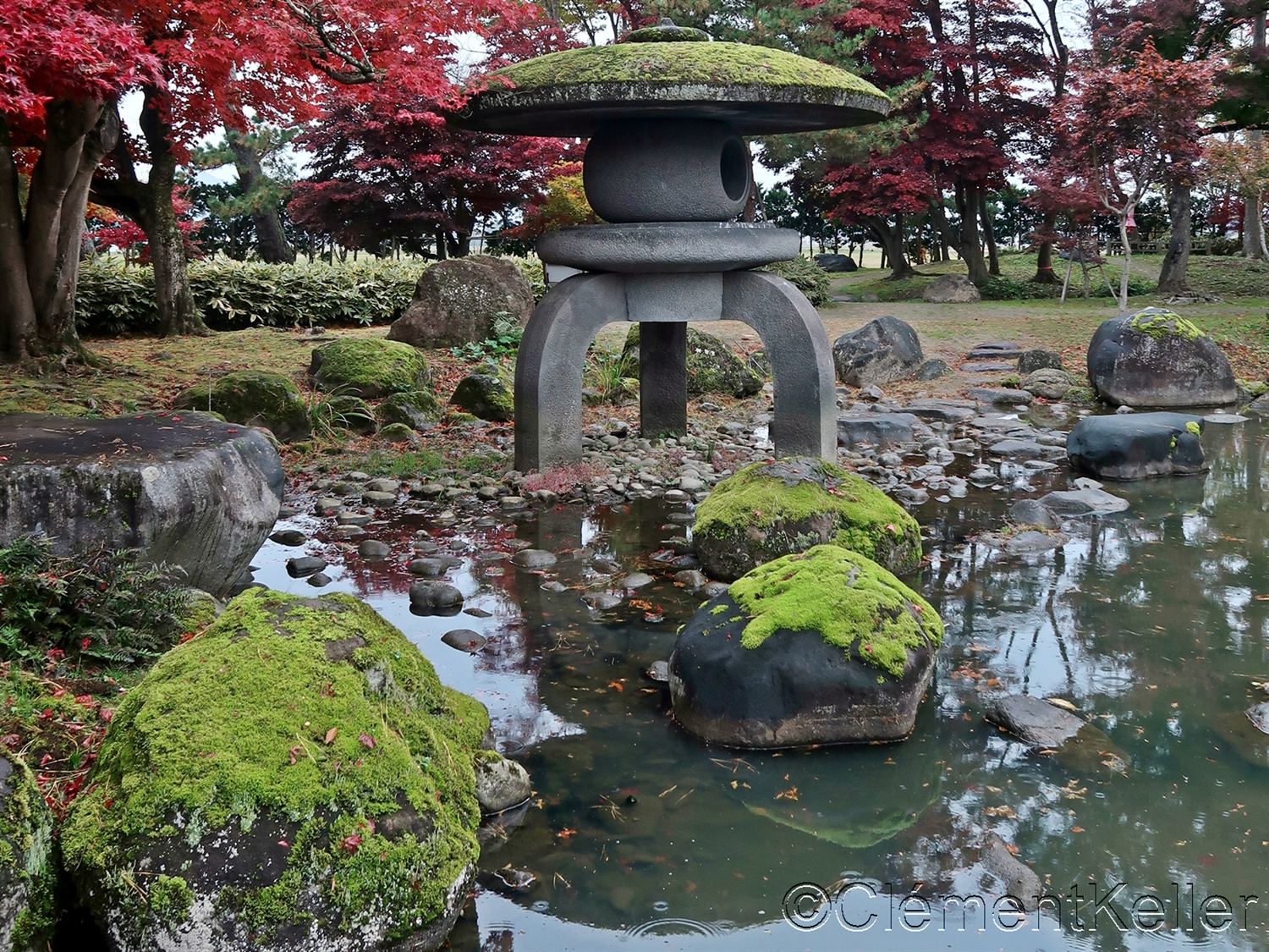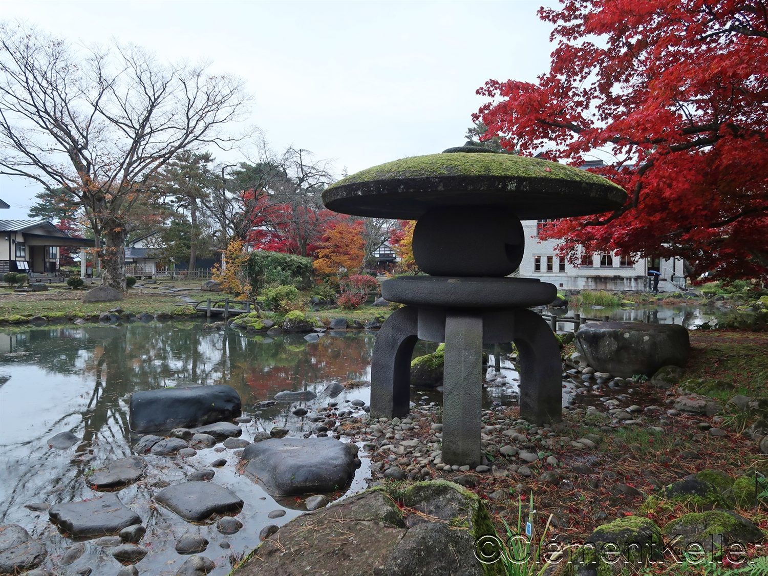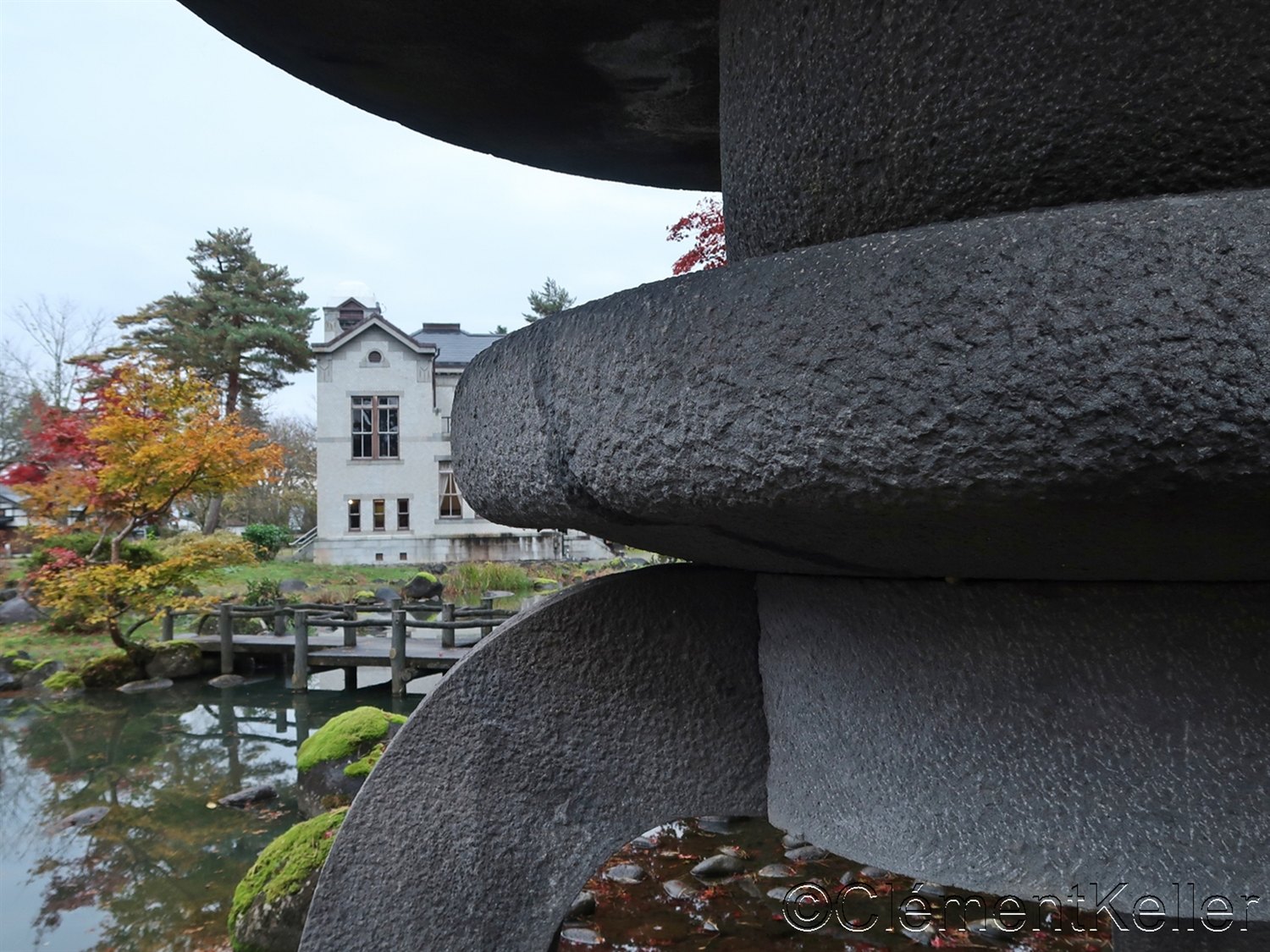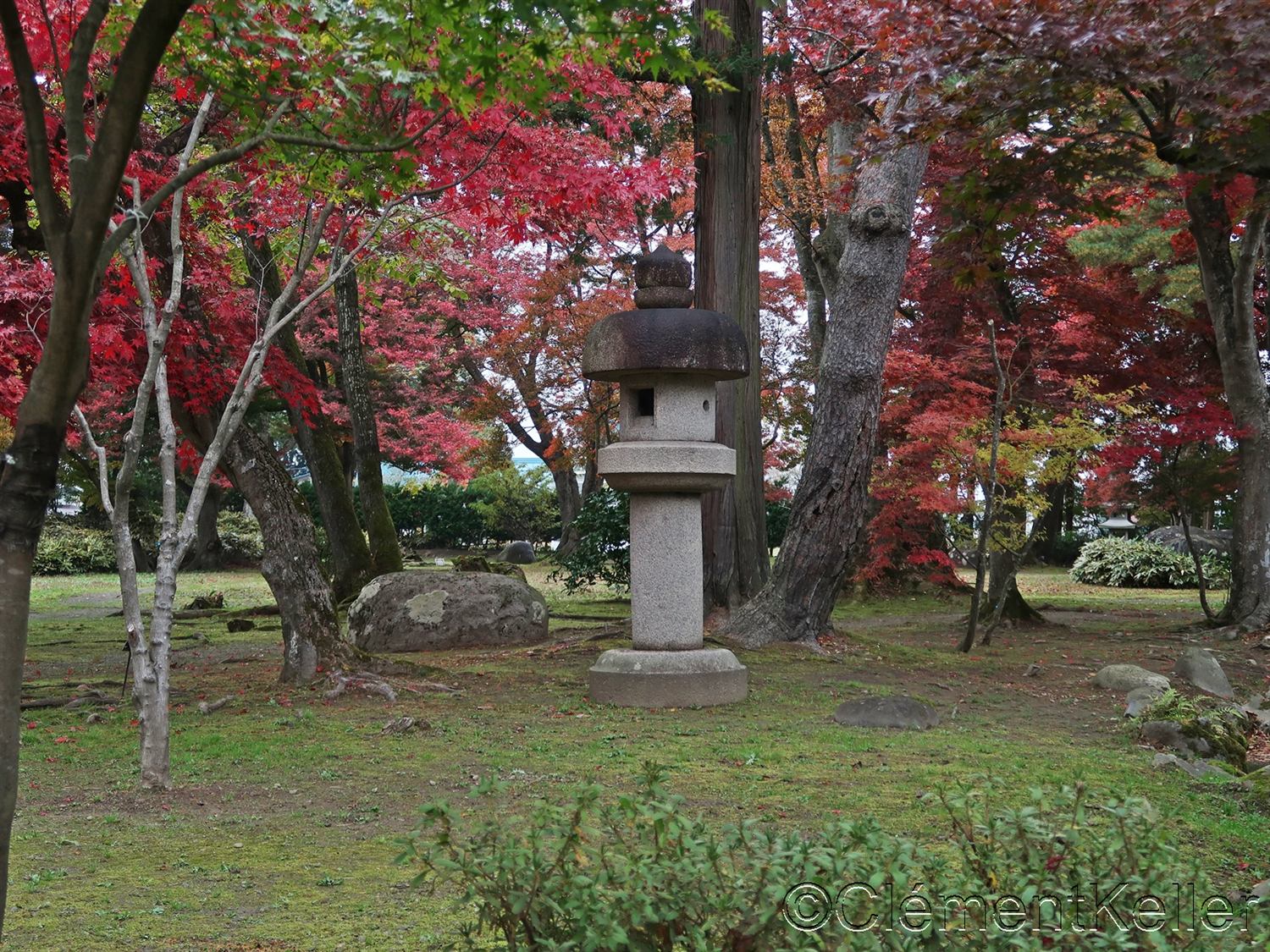 La zone située à côté de la maison occidentale, « yōkan » est organisée autour d’un large étang, « chisen ». On y trouve plusieurs lanternes, « yukimi-dōrō », en granit, de faible hauteur, placées autour de l’étang. Leur large chapeau circulaire, soutenu par un fût court, favorise les reflets sur la surface de l’étang. Certaines présentent un pied en forme de jambe arquée, « koma-ashi », typique des lanternes de rivage de la fin de l’époque d’Edo. En arrière de cette zone se dresse l’imposante lanterne en pierre « yukimi-dōrō » provenant de la péninsule d’Oga. Il s’agit d’un des éléments les plus remarquables du jardin. Le terme yukimi-dōrō 雪見灯籠 signifie littéralement : 雪 (yuki) : neige 見 (mi) : regarder, admirer 灯籠 (dōrō) : lanterne, et par conséquent lanterne pour admirer la neige. Elle dispose d’un toit très large et débordant, pensé pour accueillir la neige tombée et en souligner visuellement l’épaisseur. Lorsque la neige s’accumule sur le chapeau de la lanterne, celle-ci devient un élément central du paysage hivernal. Cette lanterne fut mise en place en 1896 à l’initiative du chef du clan Ikeda de l’époque, Ikeda Yasuyuki 池田保之 (1856–1920), afin de manifester le prestige familial et la modernisation de la propriété à l’ère de Meiji. Taillée dans un granit massif, elle atteint environ 4,5 mètres de hauteur et 4 mètres de diamètre pour un poids estimé à plusieurs dizaines de tonnes, ce qui en fait l’une des plus grandes lanternes de jardin du Japon. Son transport et son assemblage représentèrent un véritable exploit technique, mobilisant artisans et ouvriers locaux pendant plusieurs mois. Par sa taille et sa verticalité, elle constitue un point focal visible depuis plusieurs zones du jardin.