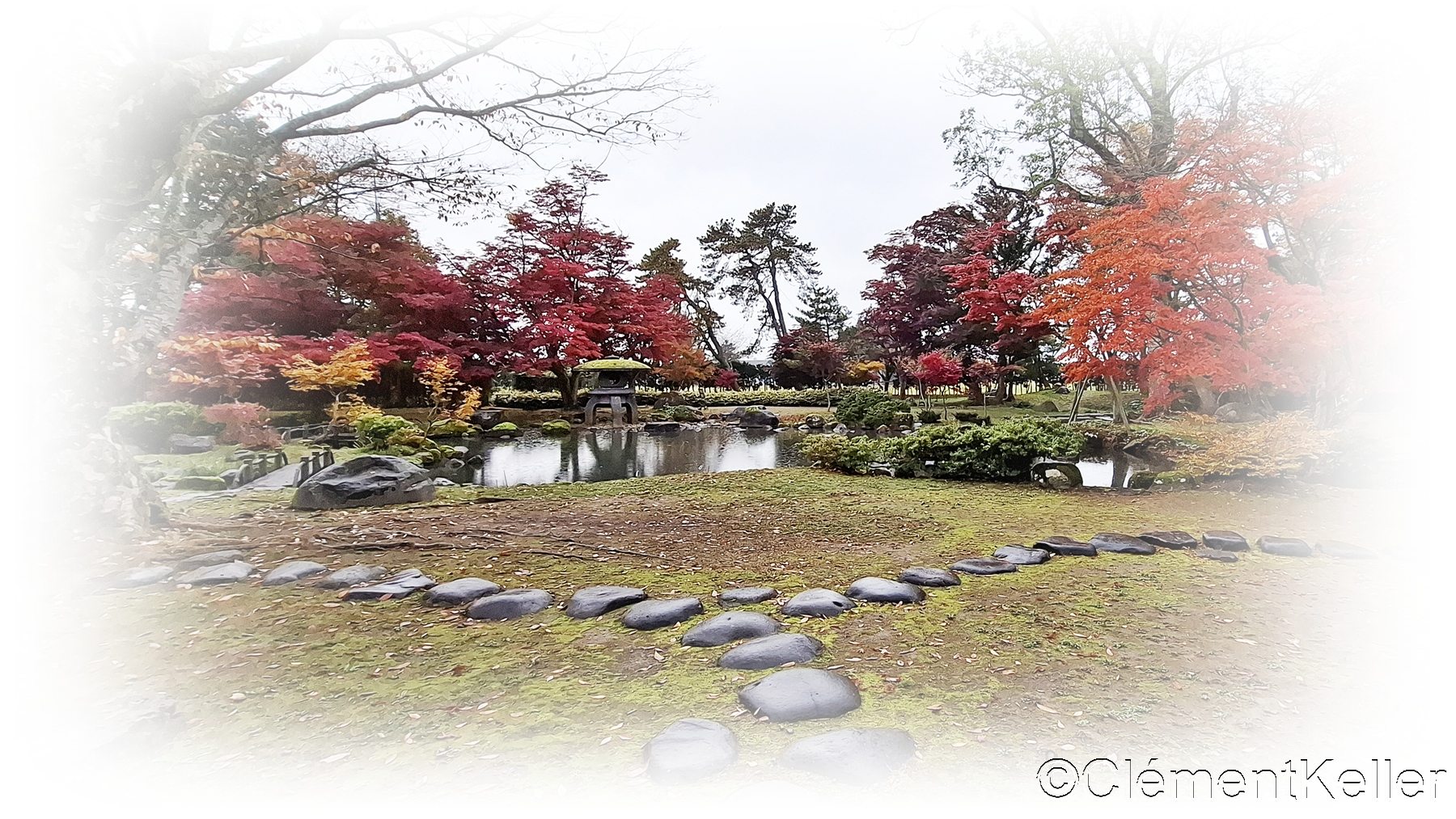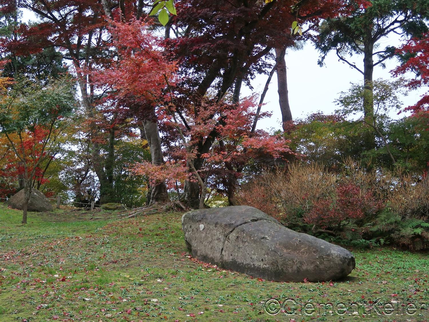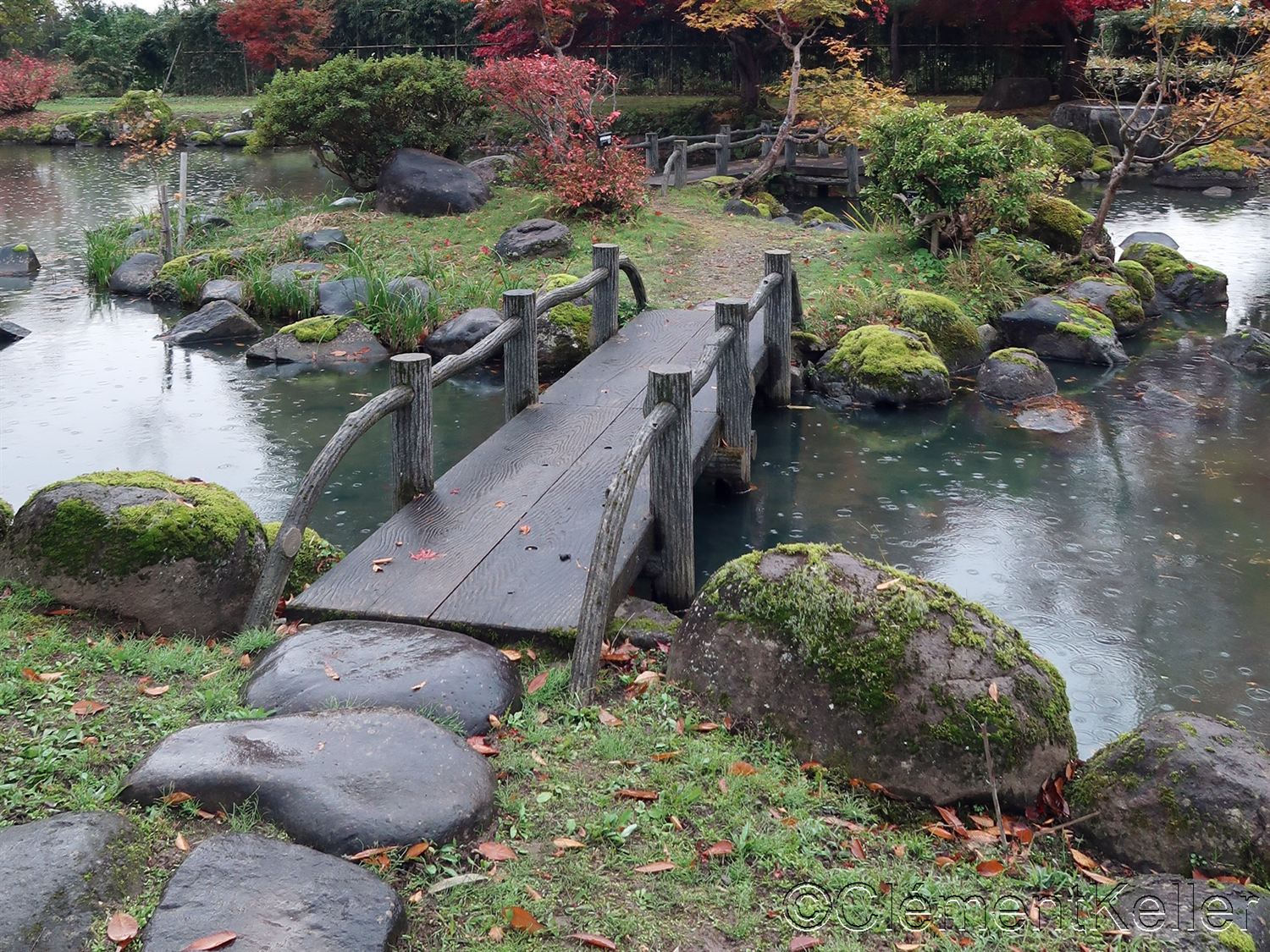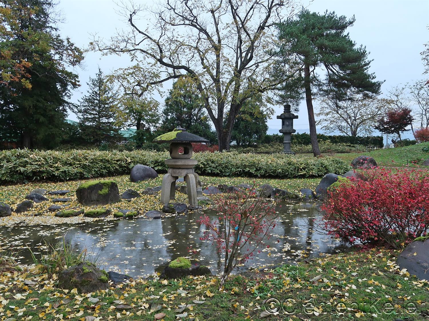 La zone située à côté de la maison occidentale, « yōkan » est organisée autour d’un large étang, « chisen ». On y trouve plusieurs lanternes, « yukimi-dōrō », en granit, de faible hauteur, placées autour de l’étang. Leur large chapeau circulaire, soutenu par un fût court, favorise les reflets sur la surface de l’étang. Certaines présentent un pied en forme de jambe arquée, « koma-ashi », typique des lanternes de rivage de la fin de l’époque d’Edo. En arrière de cette zone se dresse l’imposante lanterne en pierre « yukimi-dōrō » provenant de la péninsule d’Oga. Il s’agit d’un des éléments les plus remarquables du jardin. Le terme yukimi-dōrō 雪見灯籠 signifie littéralement : 雪 (yuki) : neige 見 (mi) : regarder, admirer 灯籠 (dōrō) : lanterne, et par conséquent lanterne pour admirer la neige. Elle dispose d’un toit très large et débordant, pensé pour accueillir la neige tombée et en souligner visuellement l’épaisseur. Lorsque la neige s’accumule sur le chapeau de la lanterne, celle-ci devient un élément central du paysage hivernal. Cette lanterne fut mise en place en 1896 à l’initiative du chef du clan Ikeda de l’époque, Ikeda Yasuyuki 池田保之 (1856–1920), afin de manifester le prestige familial et la modernisation de la propriété à l’ère de Meiji. Taillée dans un granit massif, elle atteint environ 4,5 mètres de hauteur et 4 mètres de diamètre pour un poids estimé à plusieurs dizaines de tonnes, ce qui en fait l’une des plus grandes lanternes de jardin du Japon. Son transport et son assemblage représentèrent un véritable exploit technique, mobilisant artisans et ouvriers locaux pendant plusieurs mois. Par sa taille et sa verticalité, elle constitue un point focal visible depuis plusieurs zones du jardin.
