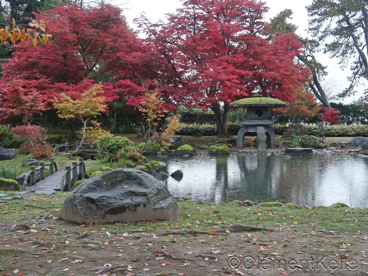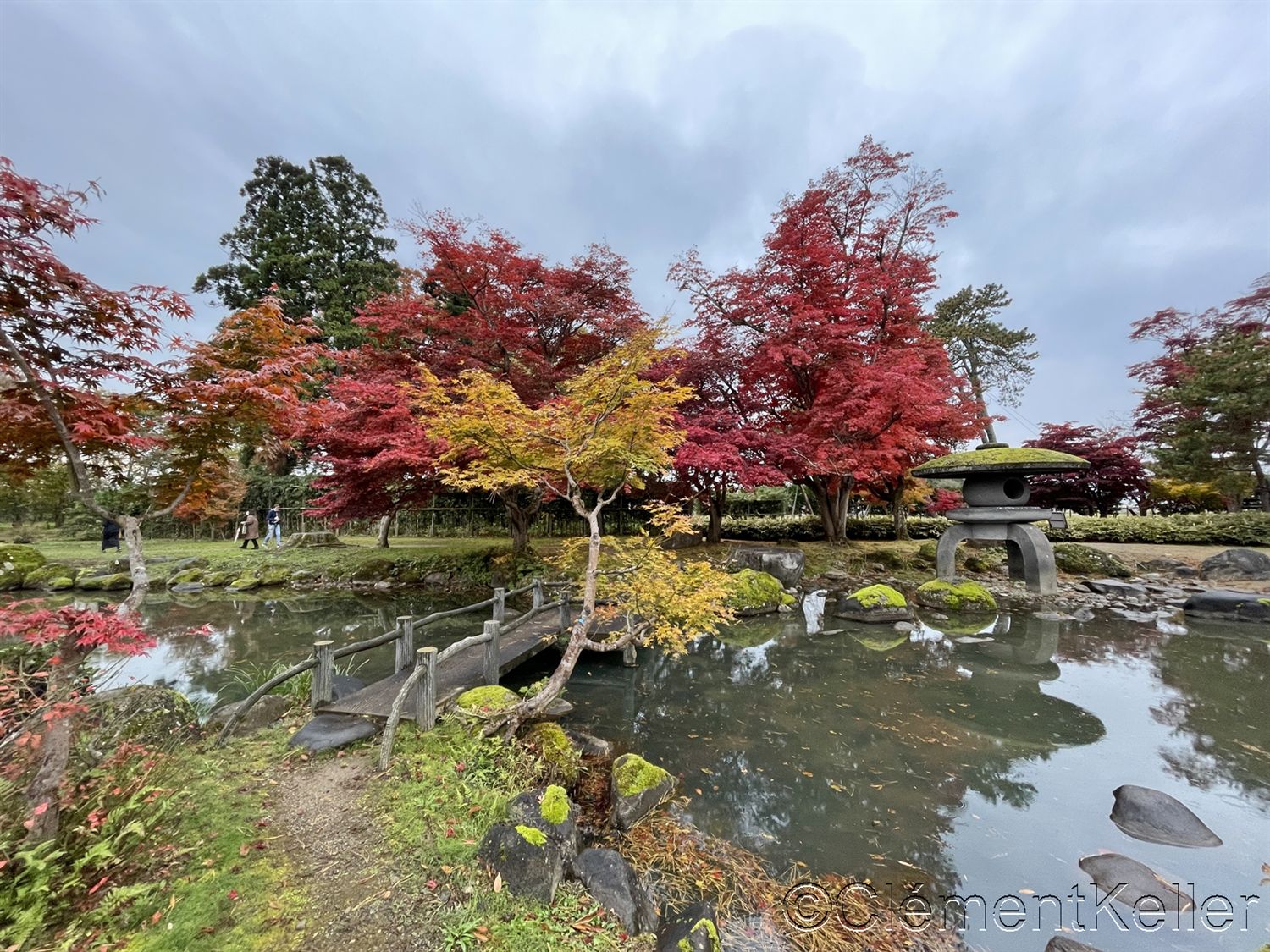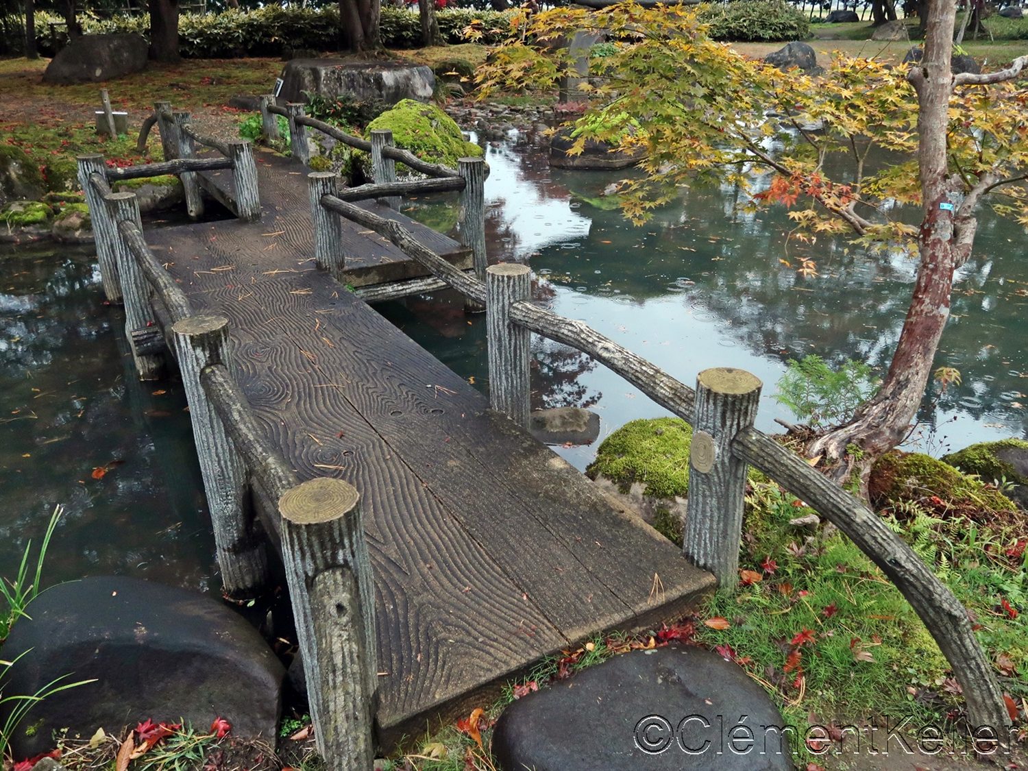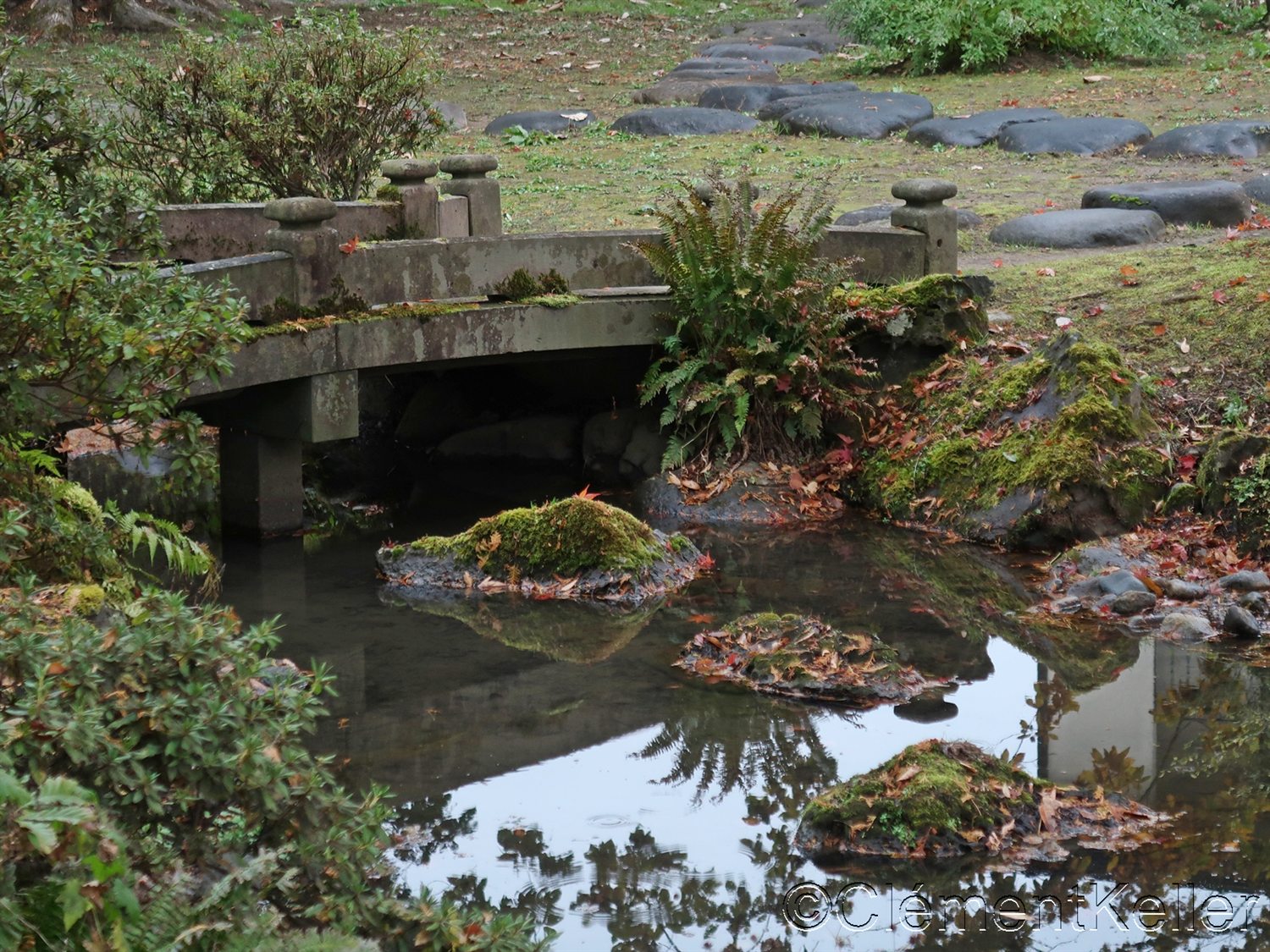 La zone située à côté de la maison occidentale, « yōkan » est organisée autour d’un large étang, « chisen ». On y trouve plusieurs lanternes, « yukimi-dōrō », en granit, de faible hauteur, placées autour de l’étang. Leur large chapeau circulaire, soutenu par un fût court, favorise les reflets sur la surface de l’étang. Certaines présentent un pied en forme de jambe arquée, « koma-ashi », typique des lanternes de rivage de la fin de l’époque d’Edo. En arrière de cette zone se dresse l’imposante lanterne en pierre « yukimi-dōrō » provenant de la péninsule d’Oga. Il s’agit d’un des éléments les plus remarquables du jardin. Le terme yukimi-dōrō 雪見灯籠 signifie littéralement : 雪 (yuki) : neige 見 (mi) : regarder, admirer 灯籠 (dōrō) : lanterne, et par conséquent lanterne pour admirer la neige. Elle dispose d’un toit très large et débordant, pensé pour accueillir la neige tombée et en souligner visuellement l’épaisseur. Lorsque la neige s’accumule sur le chapeau de la lanterne, celle-ci devient un élément central du paysage hivernal. Cette lanterne fut mise en place en 1896 à l’initiative du chef du clan Ikeda de l’époque, Ikeda Yasuyuki 池田保之 (1856–1920), afin de manifester le prestige familial et la modernisation de la propriété à l’ère de Meiji. Taillée dans un granit massif, elle atteint environ 4,5 mètres de hauteur et 4 mètres de diamètre pour un poids estimé à plusieurs dizaines de tonnes, ce qui en fait l’une des plus grandes lanternes de jardin du Japon. Son transport et son assemblage représentèrent un véritable exploit technique, mobilisant artisans et ouvriers locaux pendant plusieurs mois. Par sa taille et sa verticalité, elle constitue un point focal visible depuis plusieurs zones du jardin.
