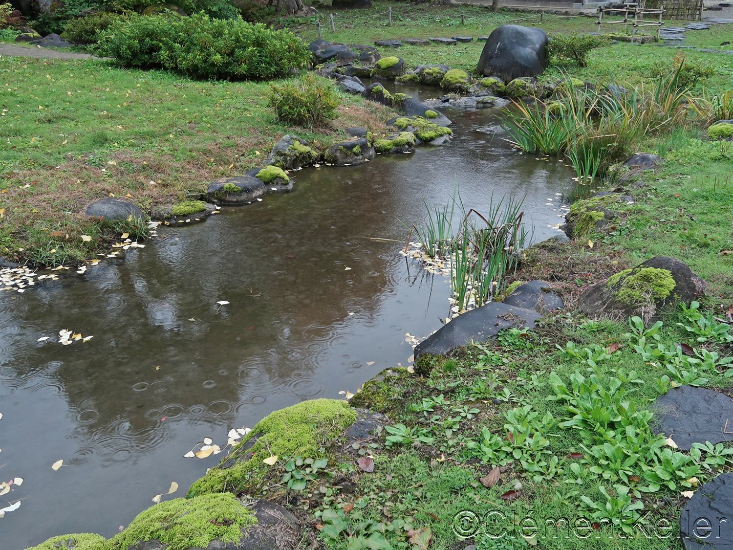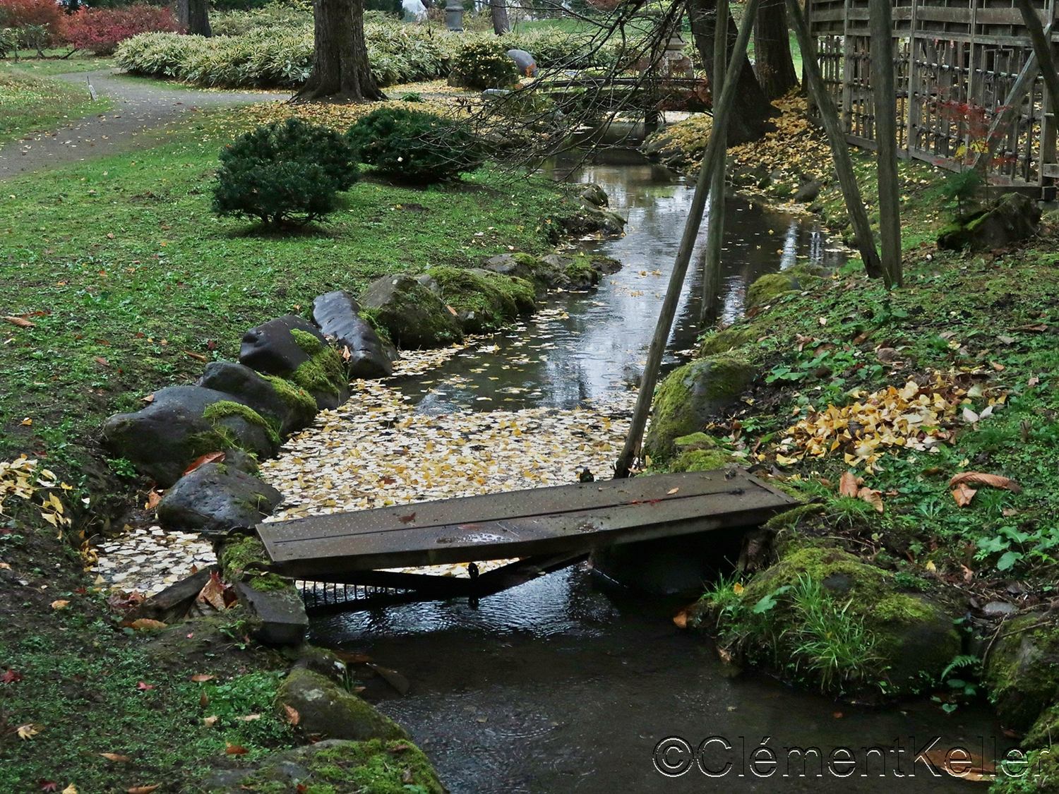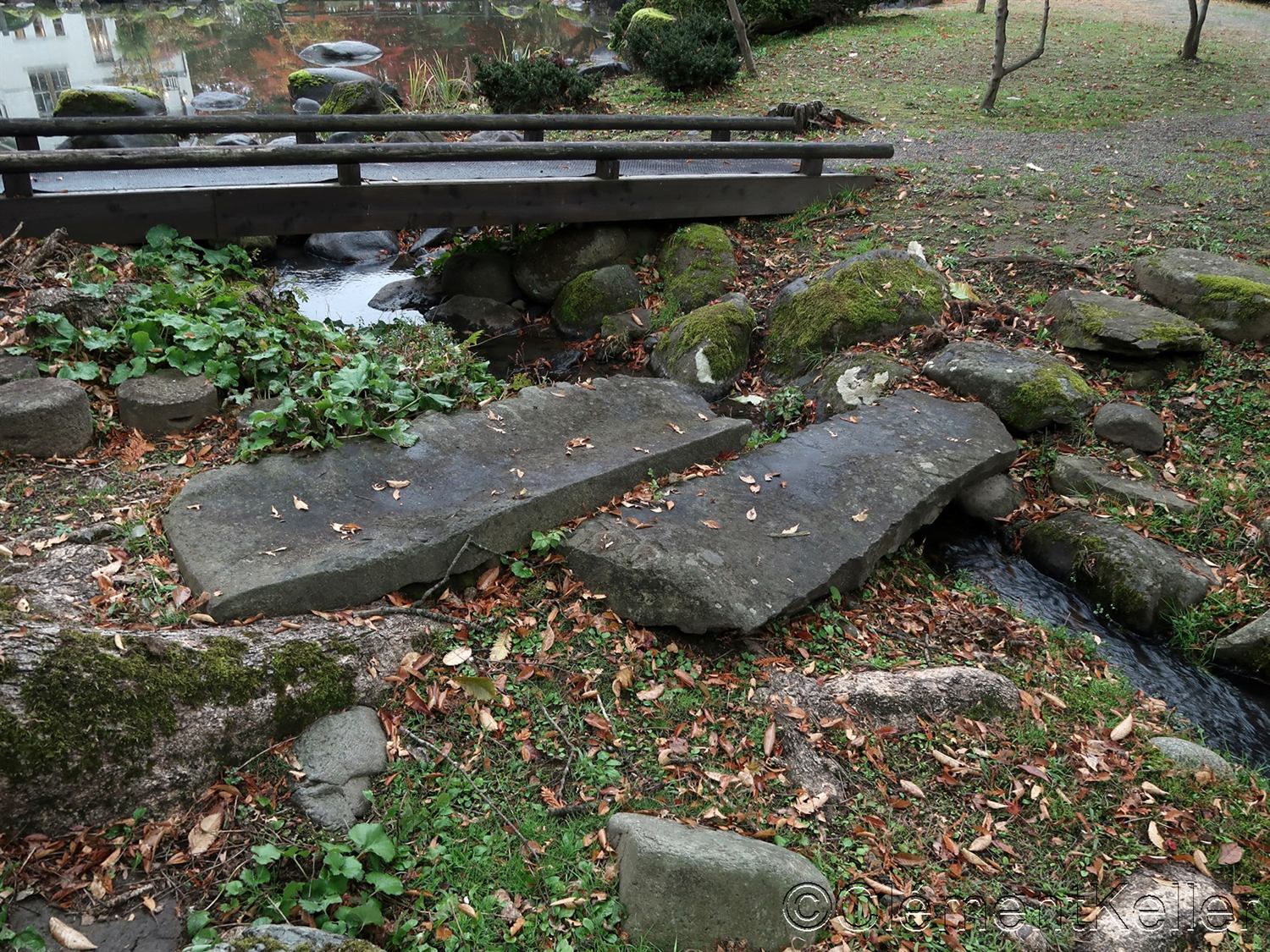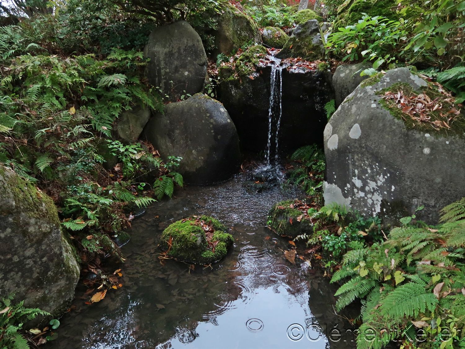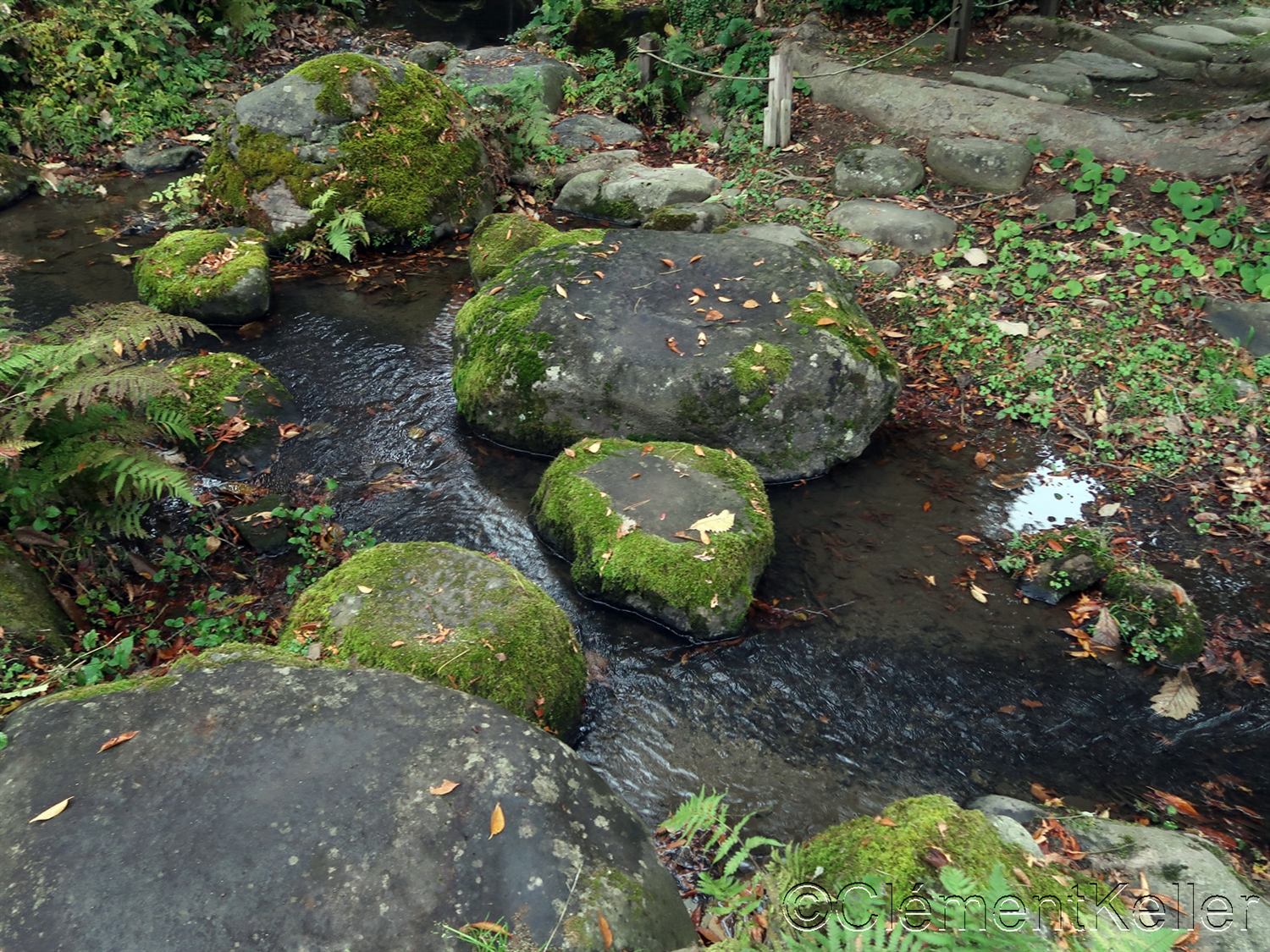 Enfin, le fond du jardin dont le ruisseau et ses élargissements constitue le fil conducteur accueille plusieurs lanternes, « oribe-dōrō », au dessin volontairement irrégulier posées près des cheminements et des bosquets.