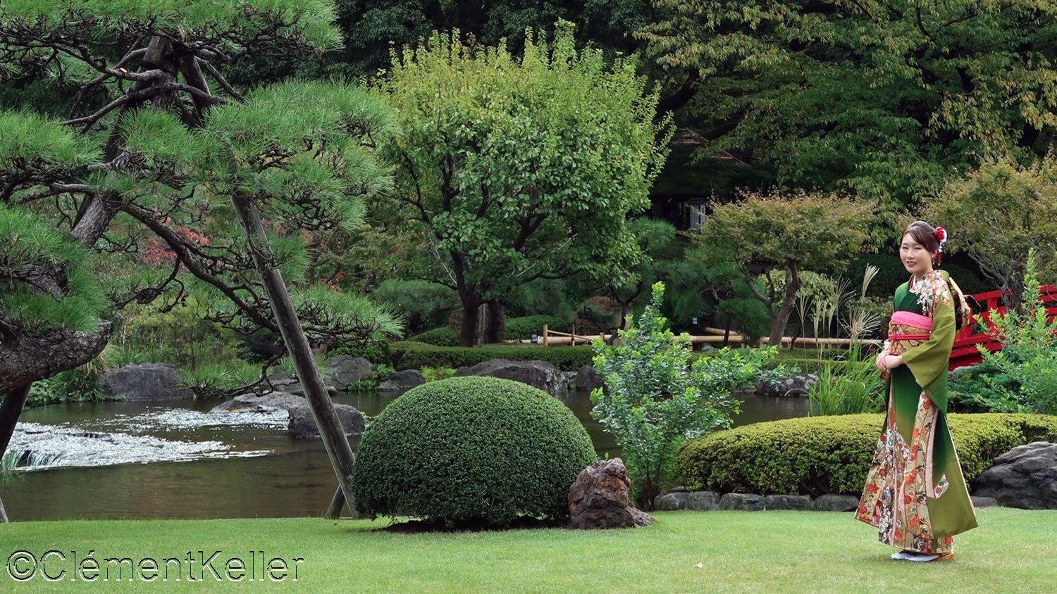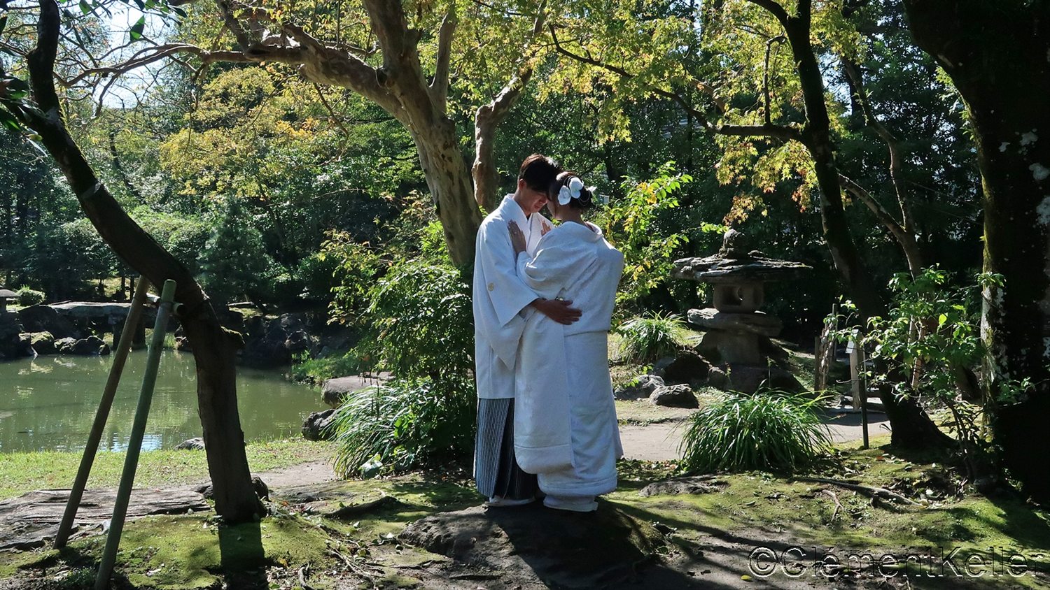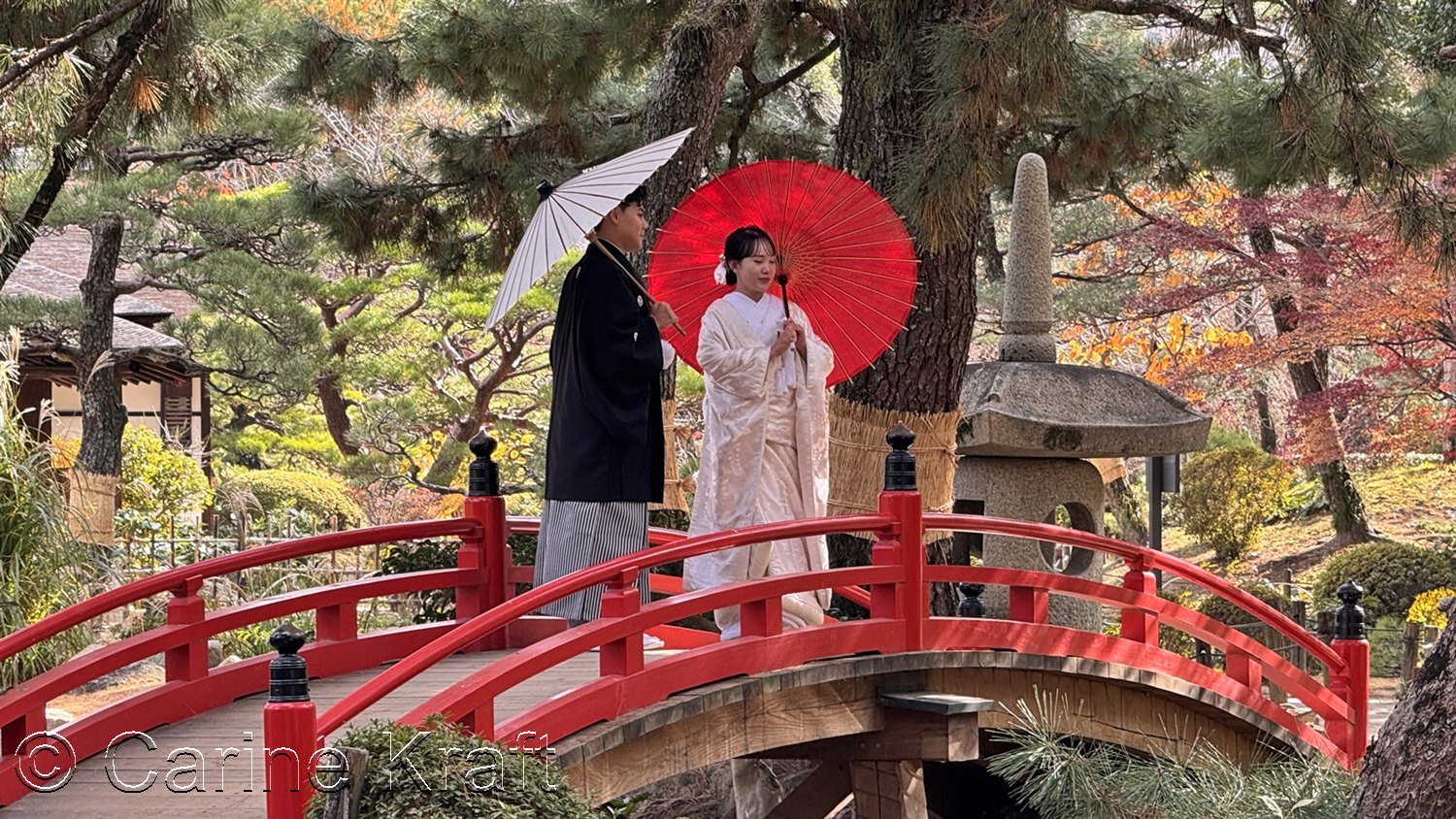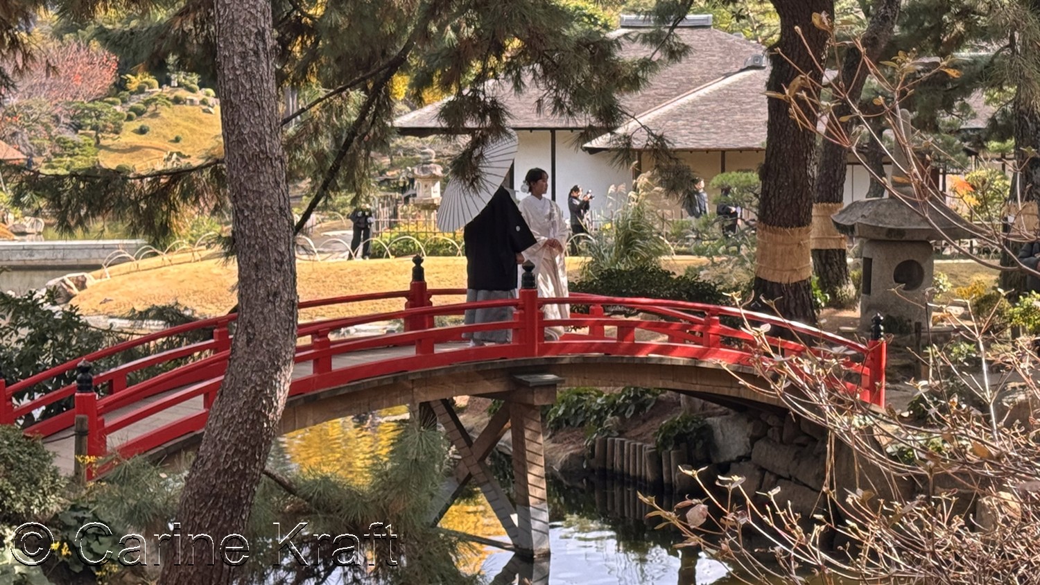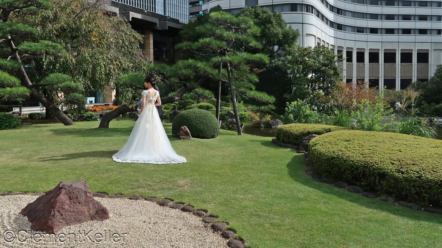 Les jardins japonais proposent un cadre exceptionnel pour les photographies de mariés. Les vêtements des mariés, qu’ils soient traditionnels ou occidentaux, apportent des touches contrastées dans les environnements de nature.