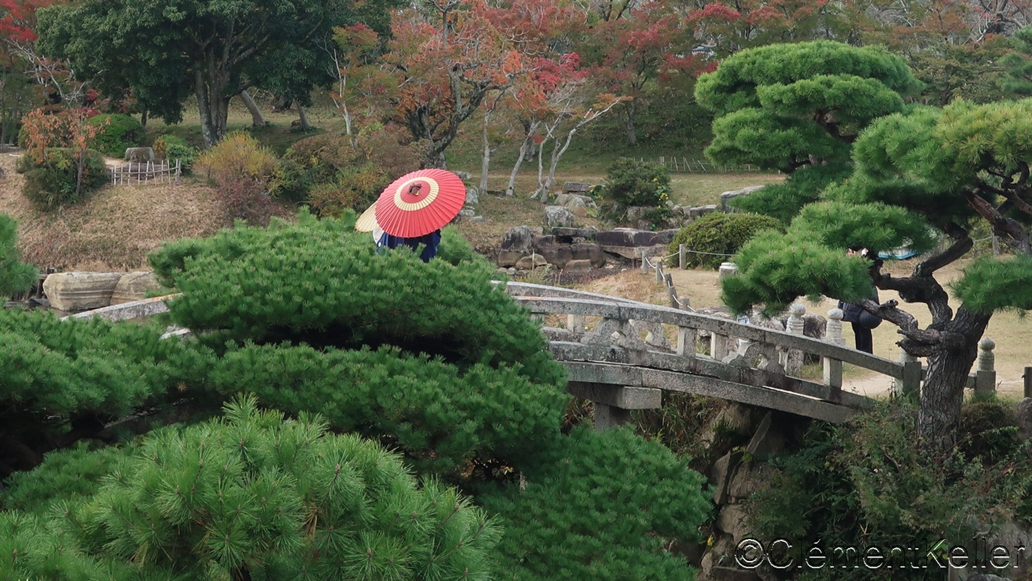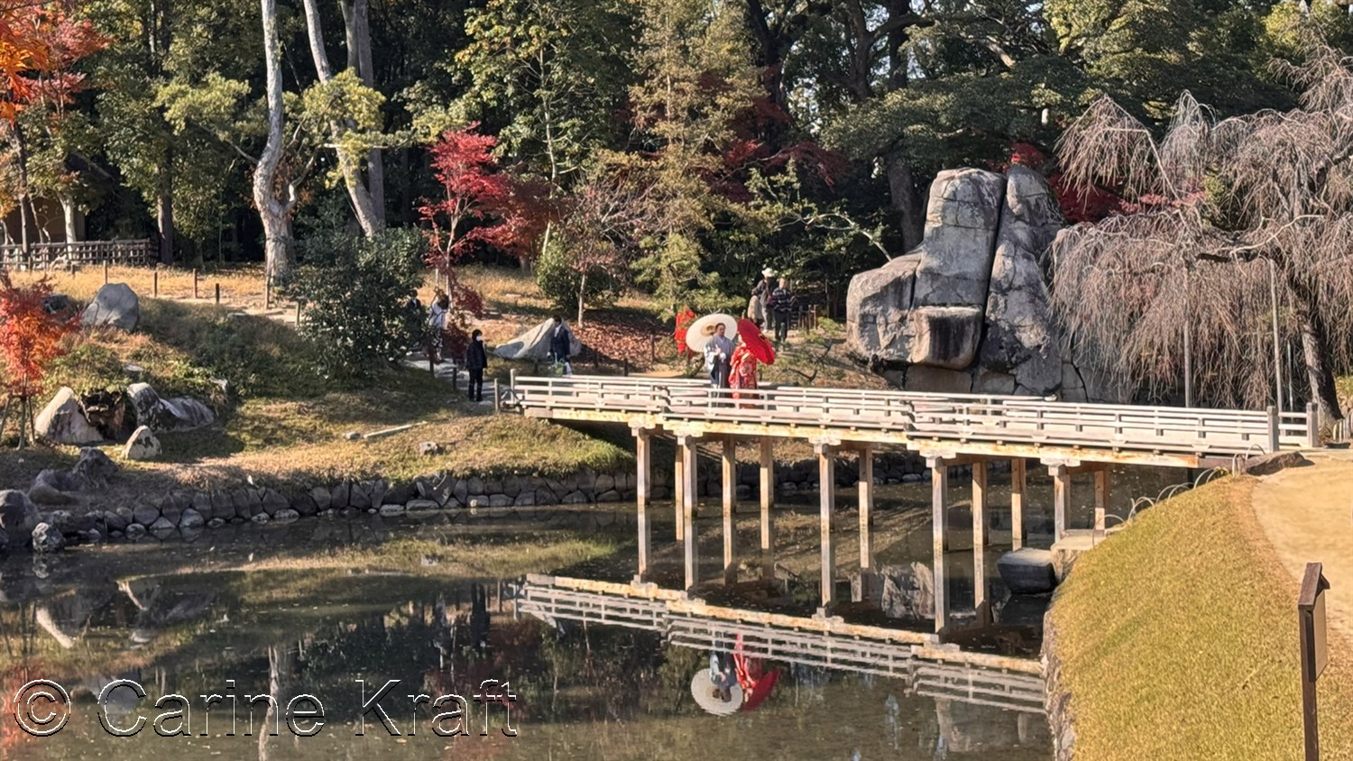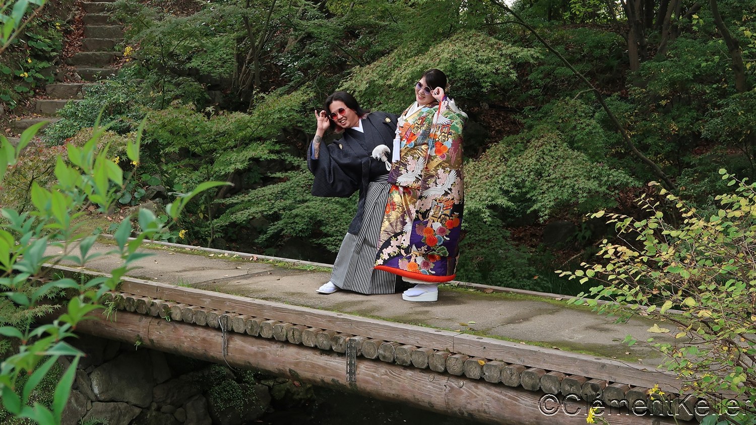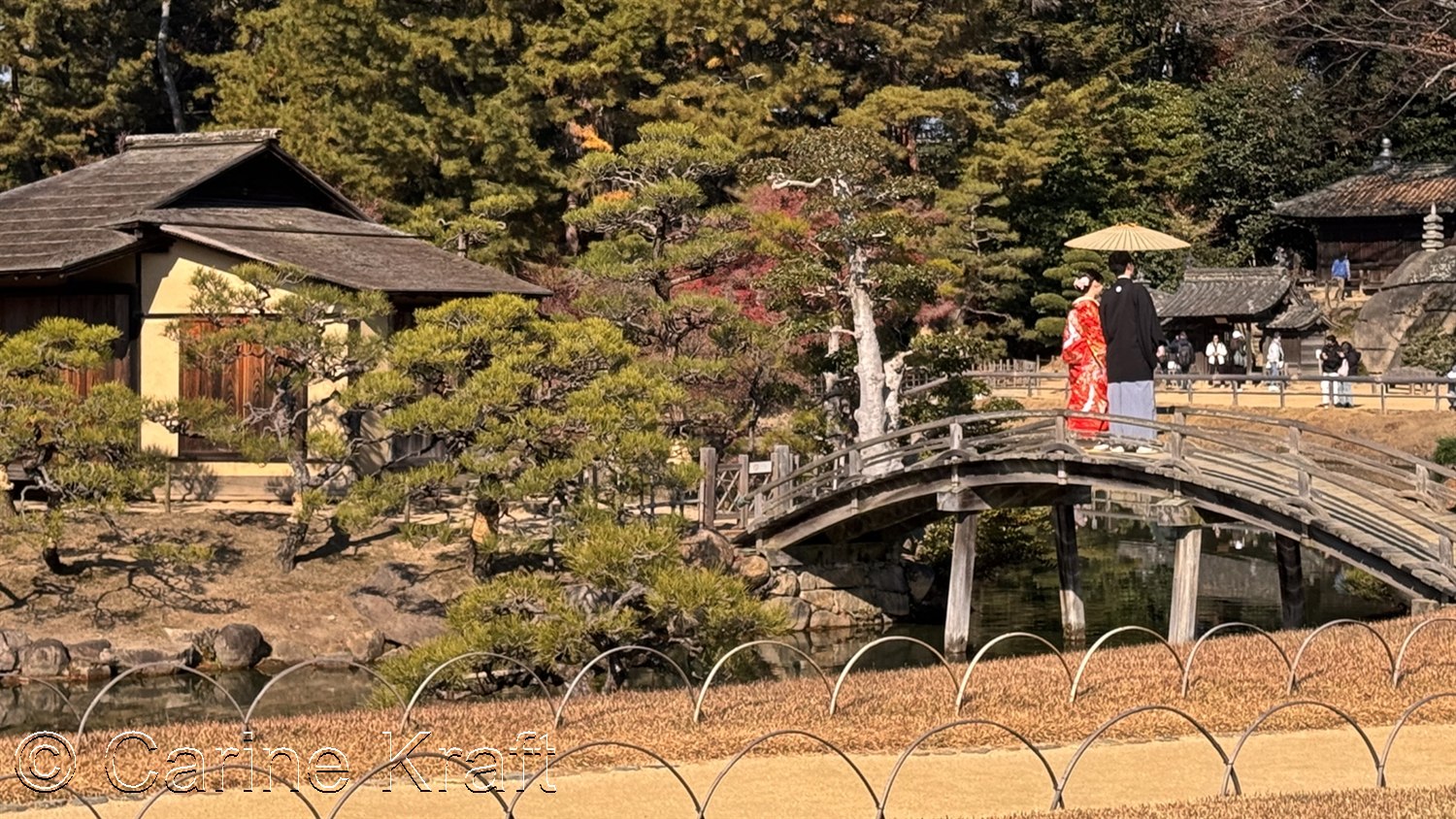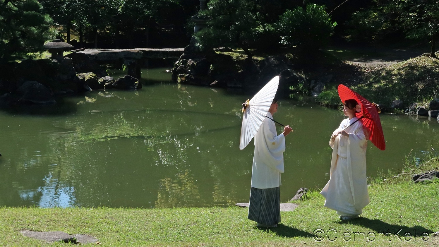 Les jardins japonais proposent un cadre exceptionnel pour les photographies de mariés. Les vêtements des mariés, qu’ils soient traditionnels ou occidentaux, apportent des touches contrastées dans les environnements de nature.