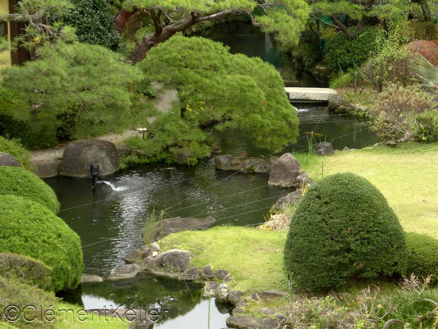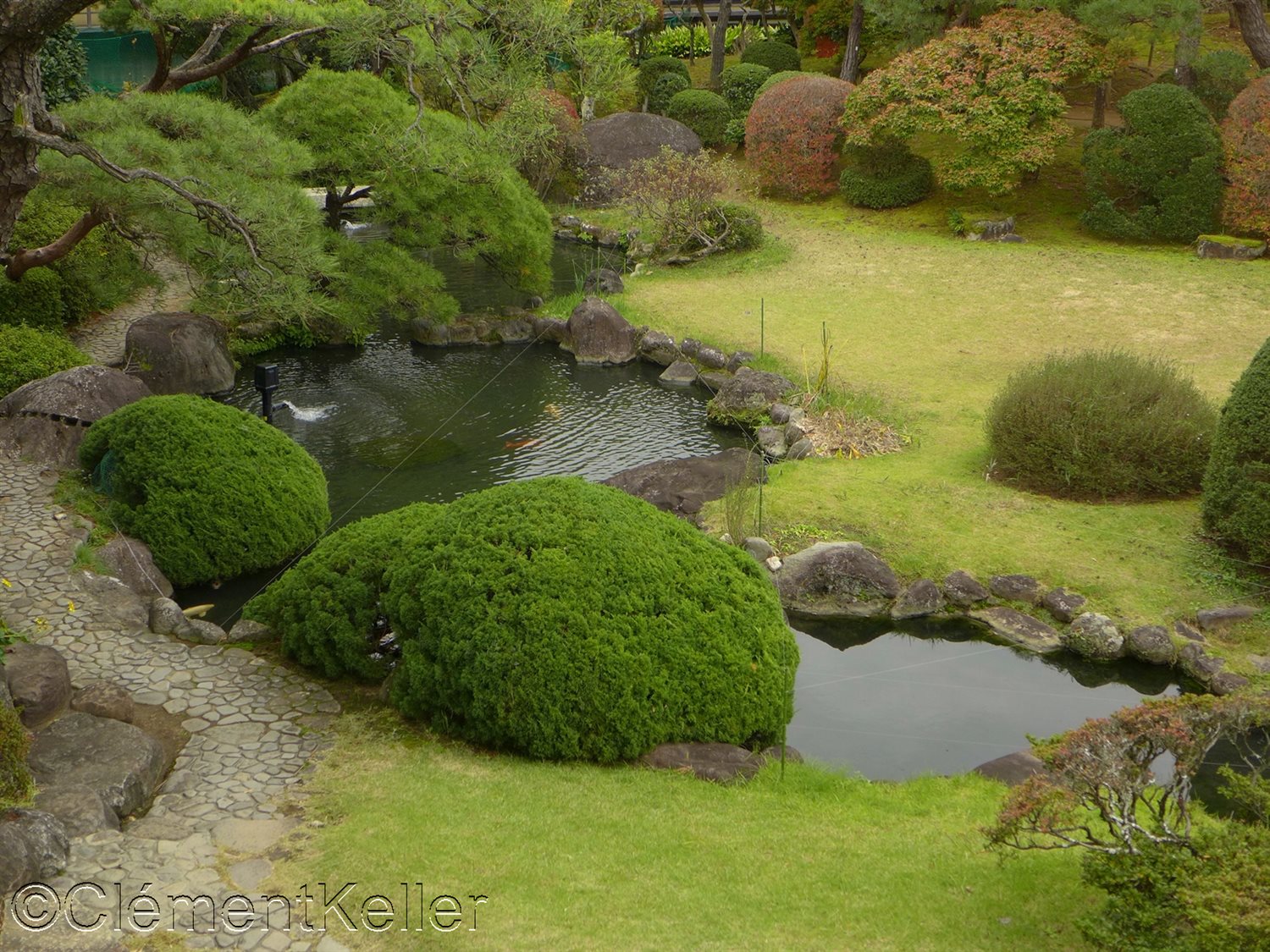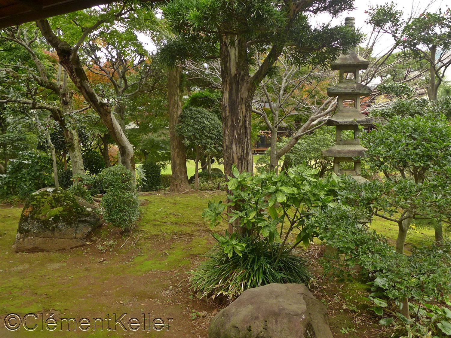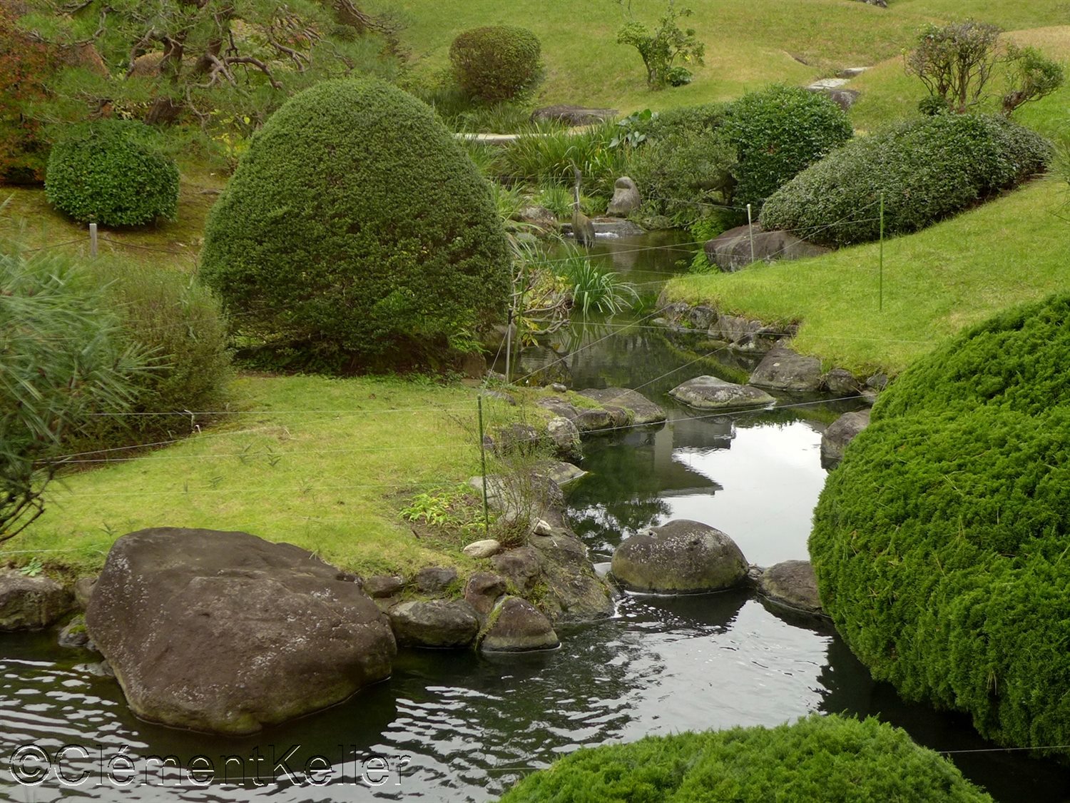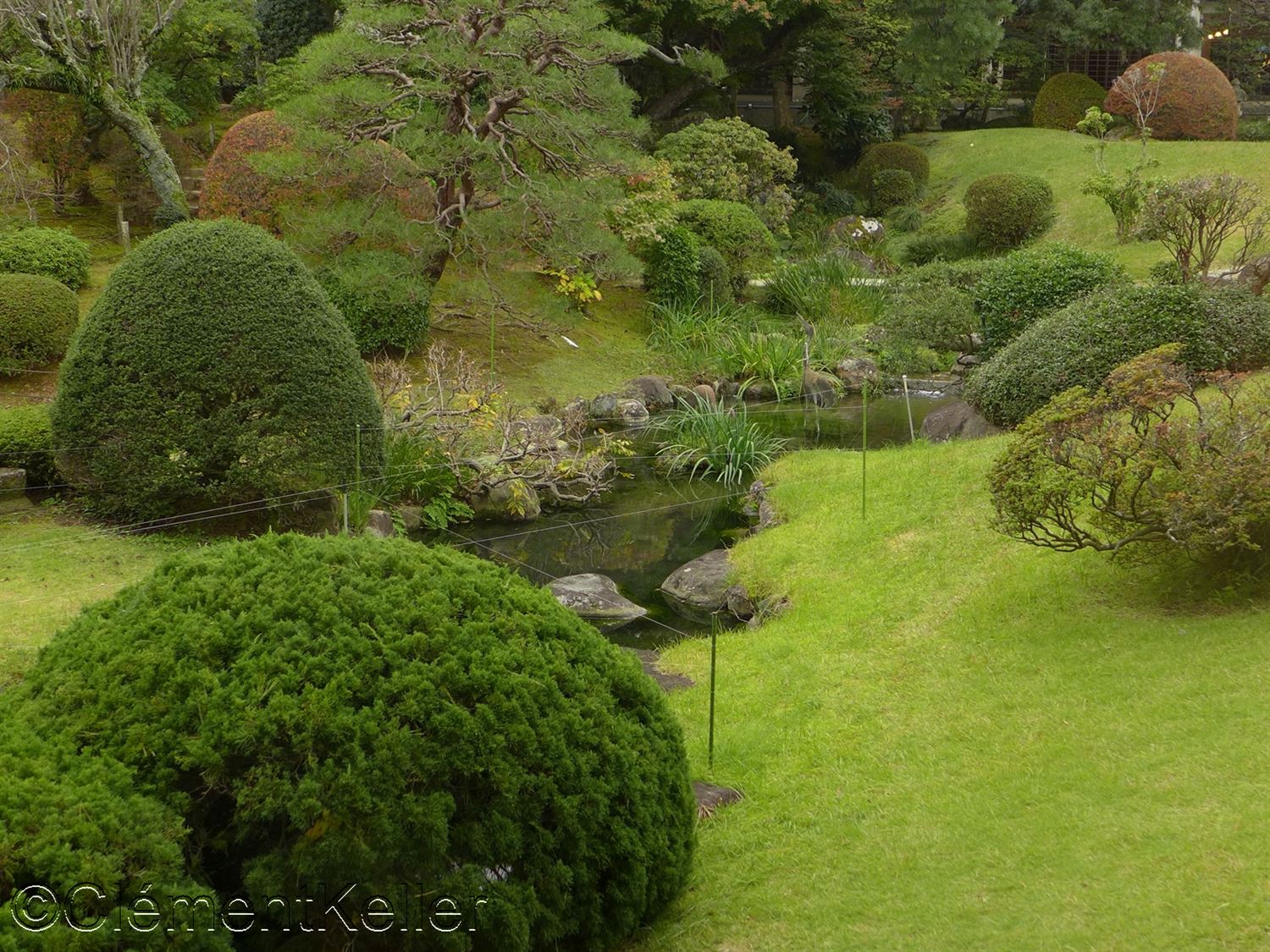 Sa composition paysagère mêle pelouses vallonnées, allées pavées sinueuses, rochers, bosquets d’azalées « tsutsji » つつじ, cognassiers du Japon « karin » かりん, glycines « fuji » ふじ, osmanthus « kinmokusei » 金木犀 et arbres persistants avec un ruisseau et une succession de bassins avec des carpes « koï », dans une atmosphère intime et raffinée.