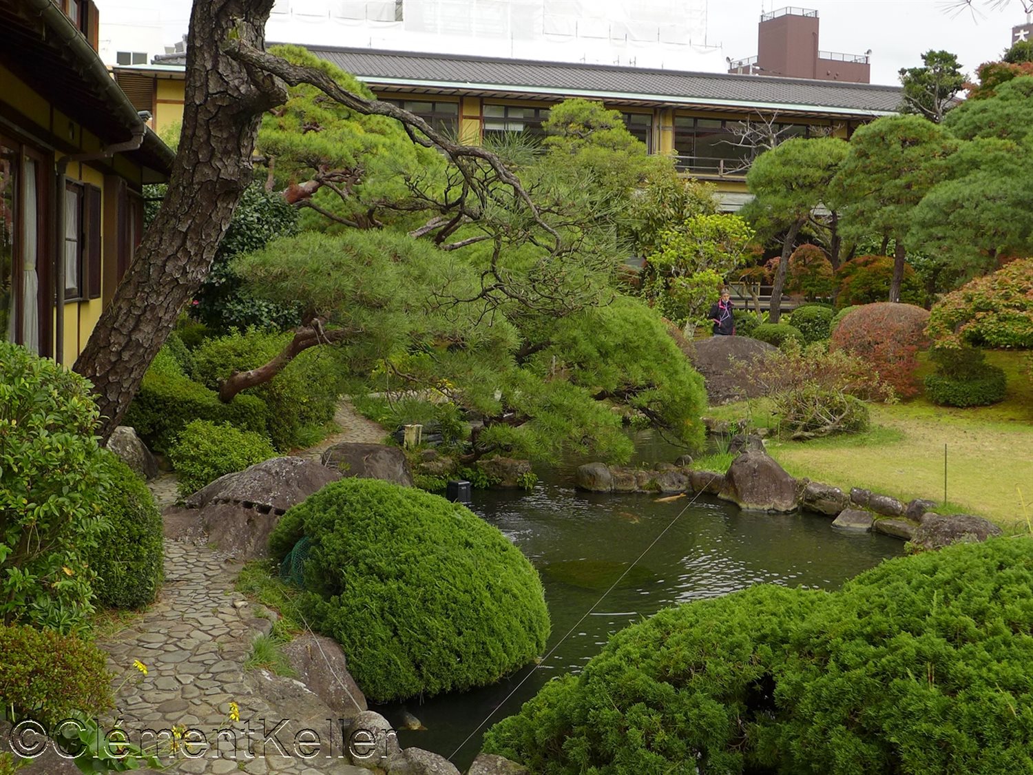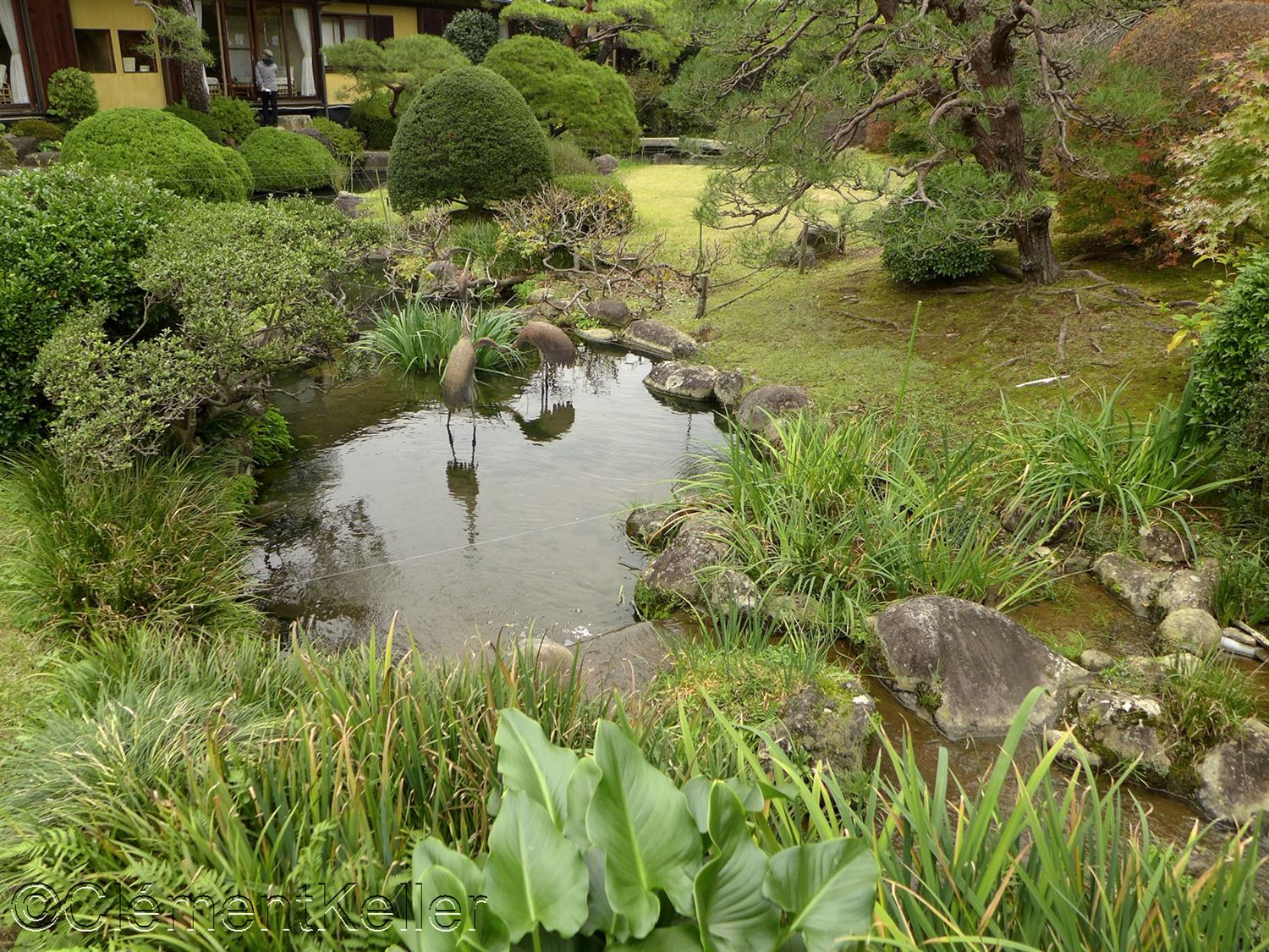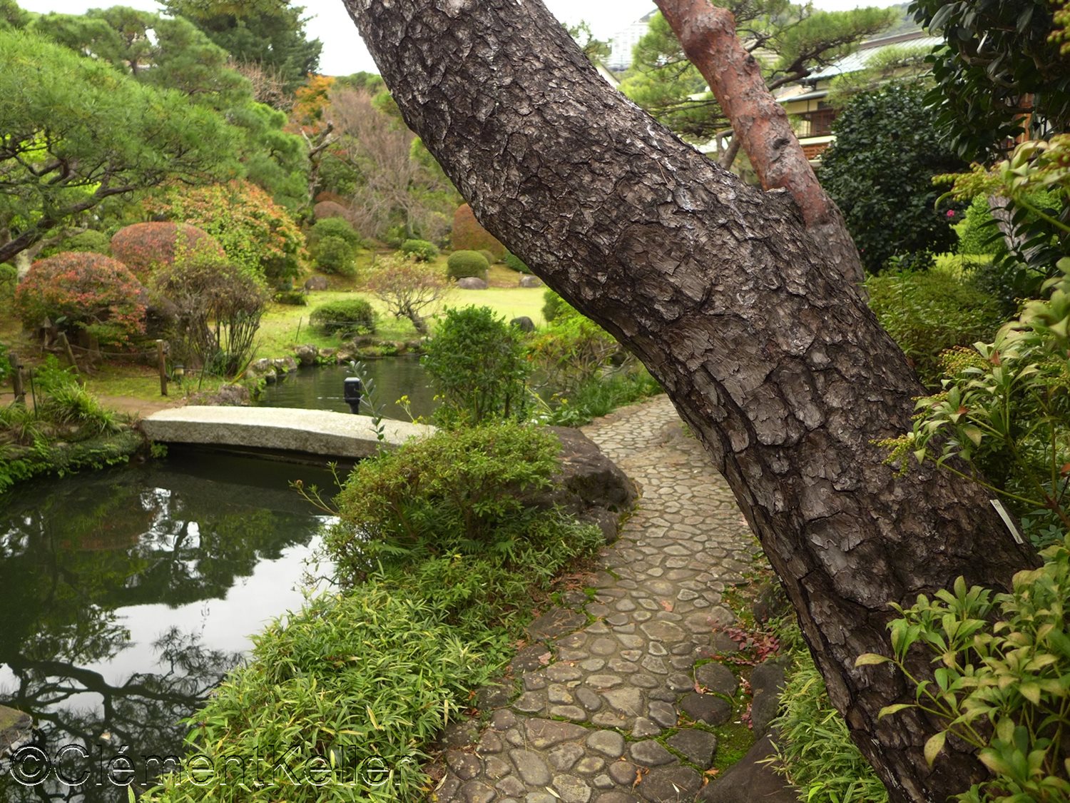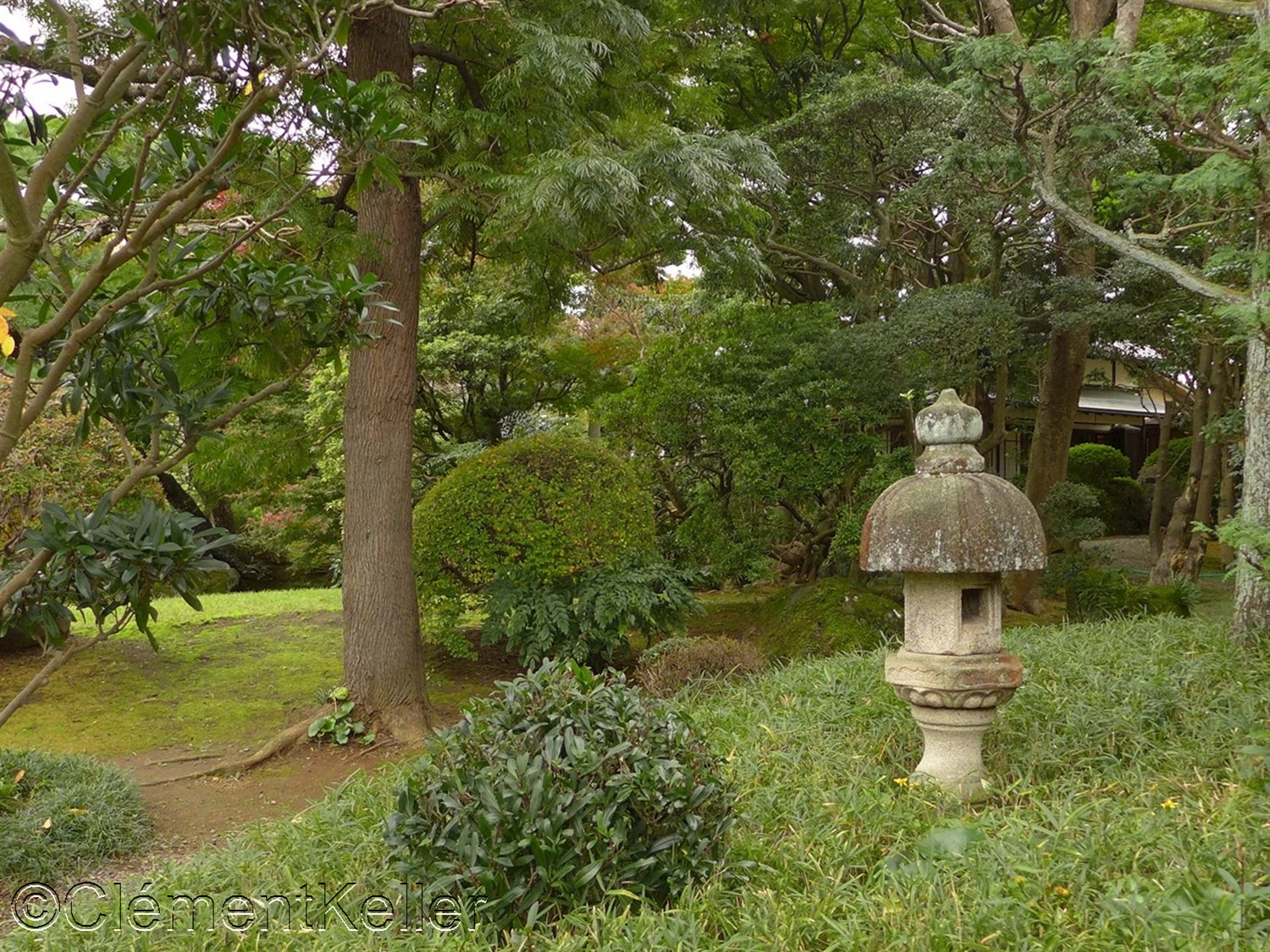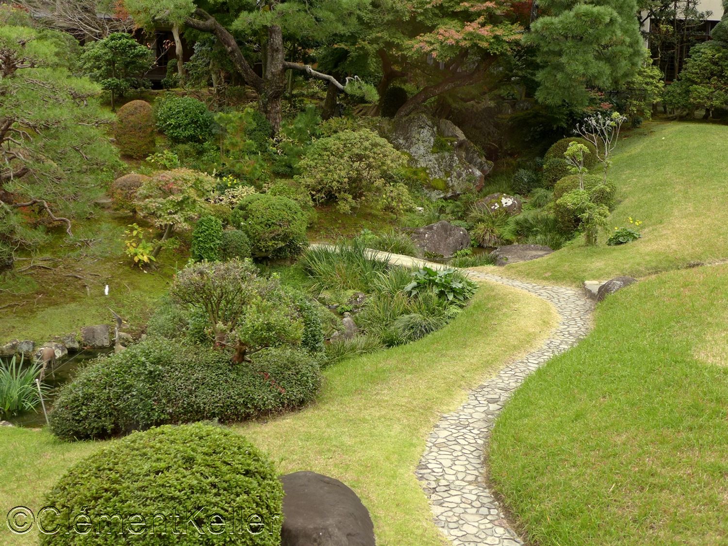 Sa composition paysagère mêle pelouses vallonnées, allées pavées sinueuses, rochers, bosquets d’azalées « tsutsji » つつじ, cognassiers du Japon « karin » かりん, glycines « fuji » ふじ, osmanthus « kinmokusei » 金木犀 et arbres persistants avec un ruisseau et une succession de bassins avec des carpes « koï », dans une atmosphère intime et raffinée.