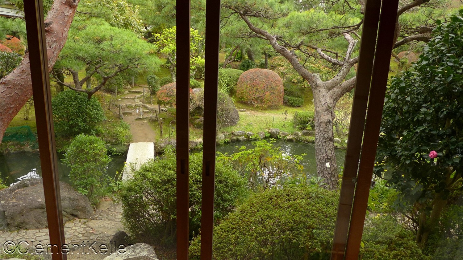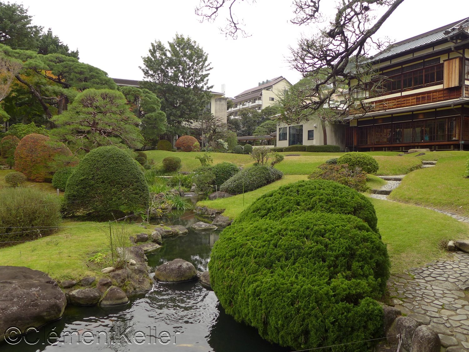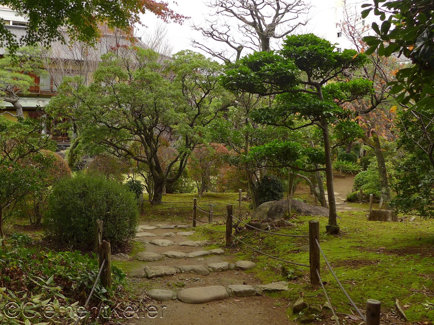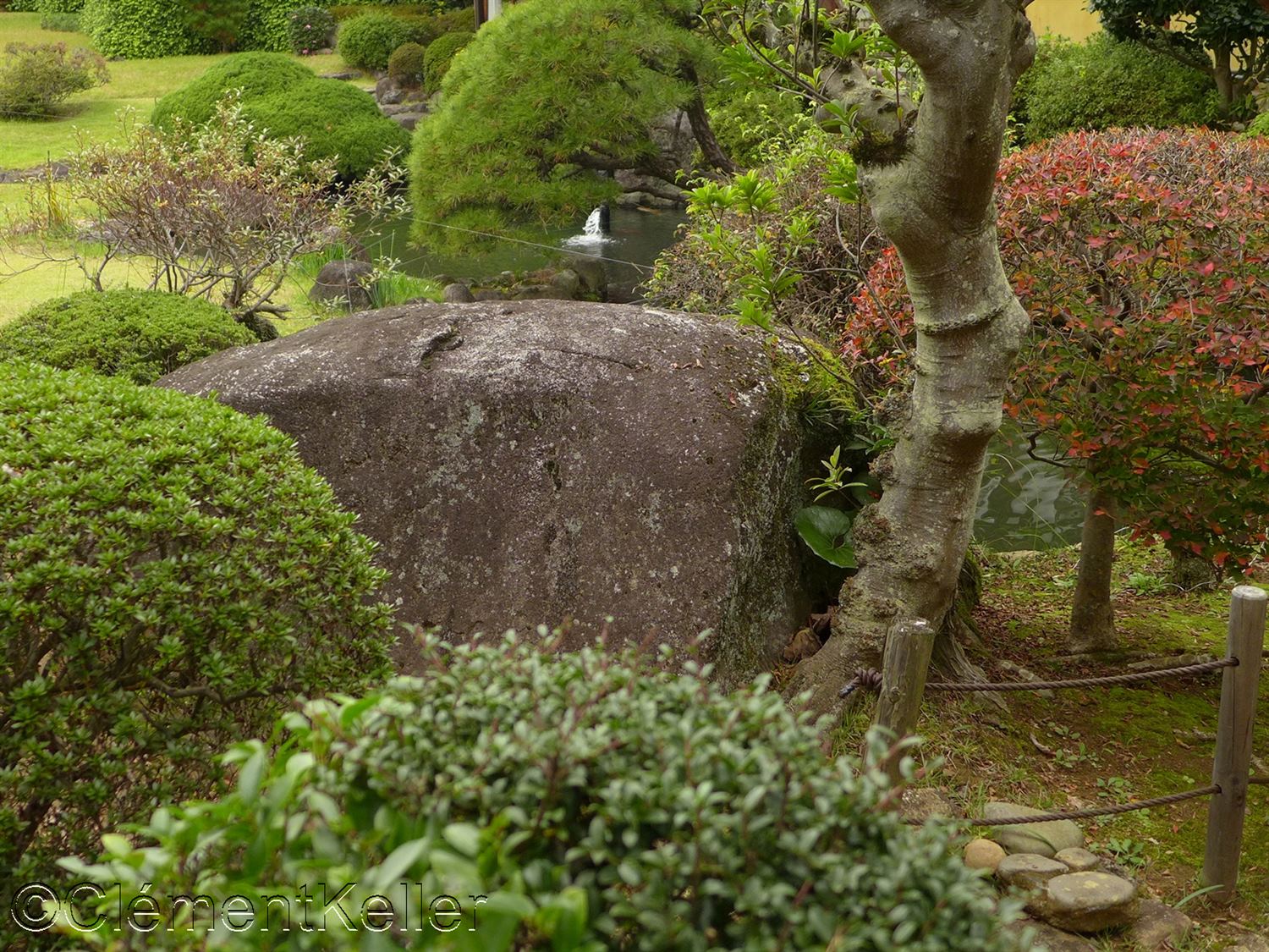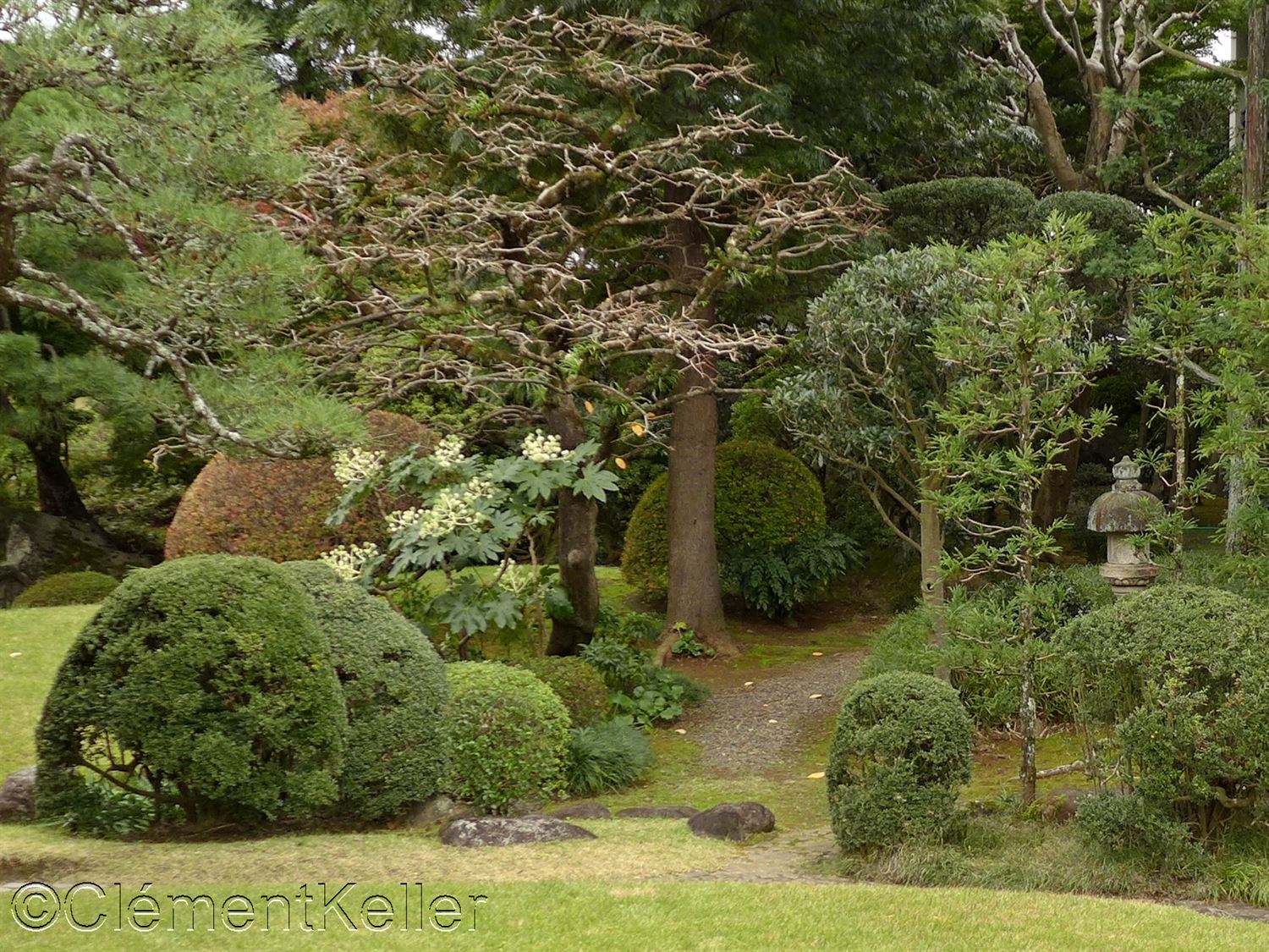Sa composition paysagère mêle pelouses vallonnées, allées pavées sinueuses, rochers, bosquets d’azalées « tsutsji » つつじ, cognassiers du Japon « karin » かりん, glycines « fuji » ふじ, osmanthus « kinmokusei » 金木犀 et arbres persistants avec un ruisseau et une succession de bassins avec des carpes « koï », dans une atmosphère intime et raffinée.