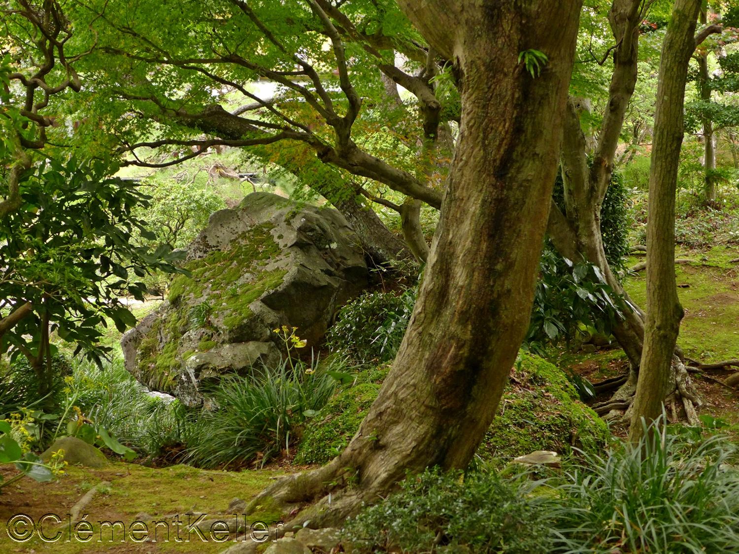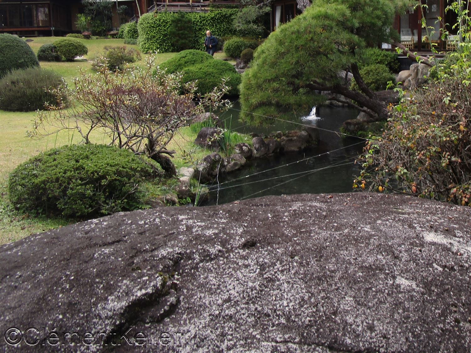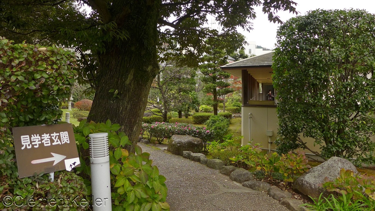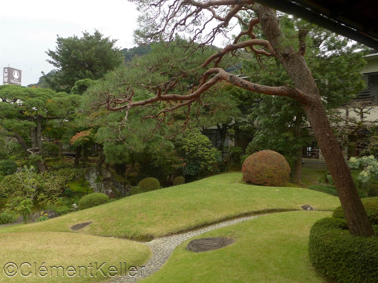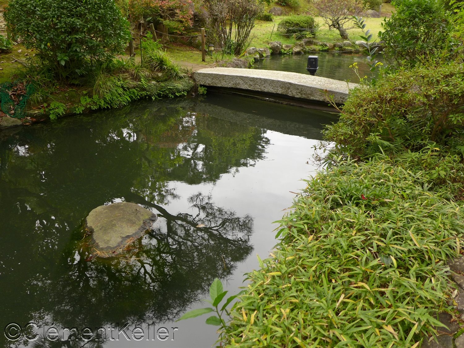 Sa composition paysagère mêle pelouses vallonnées, allées pavées sinueuses, rochers, bosquets d’azalées « tsutsji » つつじ, cognassiers du Japon « karin » かりん, glycines « fuji » ふじ, osmanthus « kinmokusei » 金木犀 et arbres persistants avec un ruisseau et une succession de bassins avec des carpes « koï », dans une atmosphère intime et raffinée.
