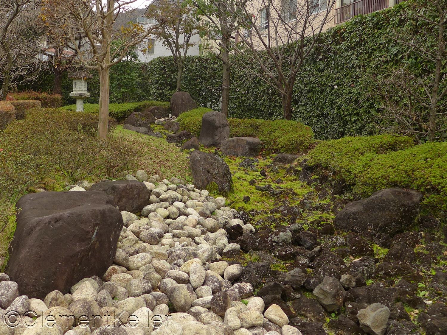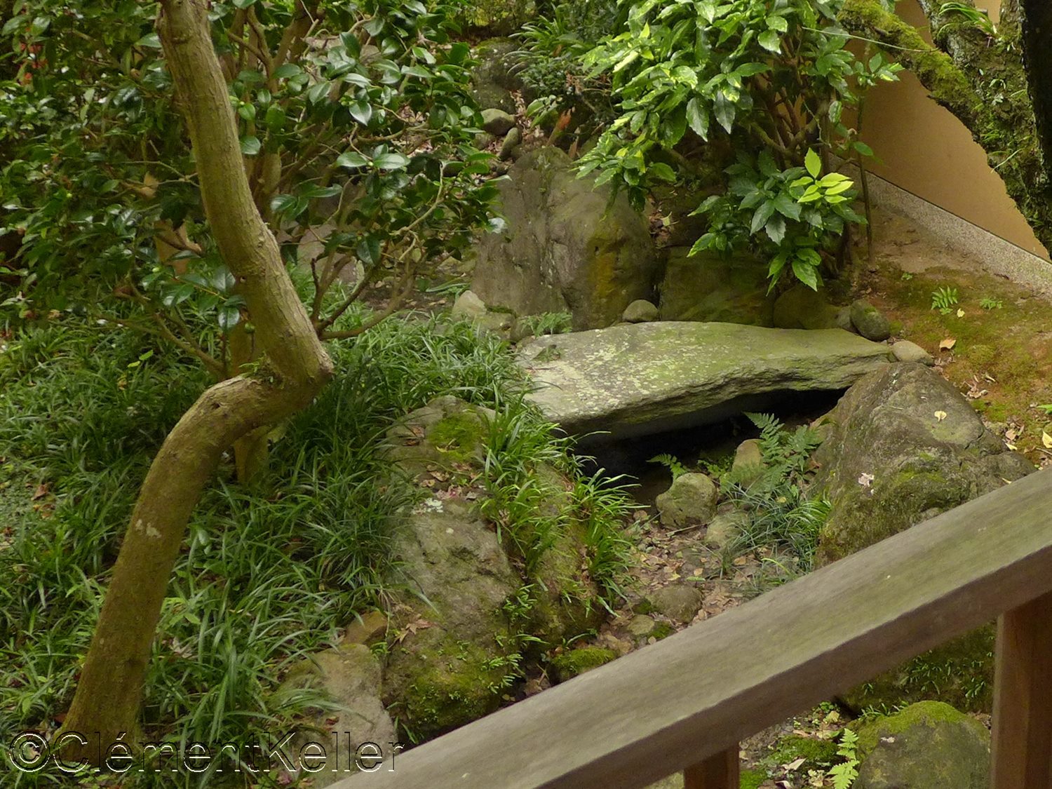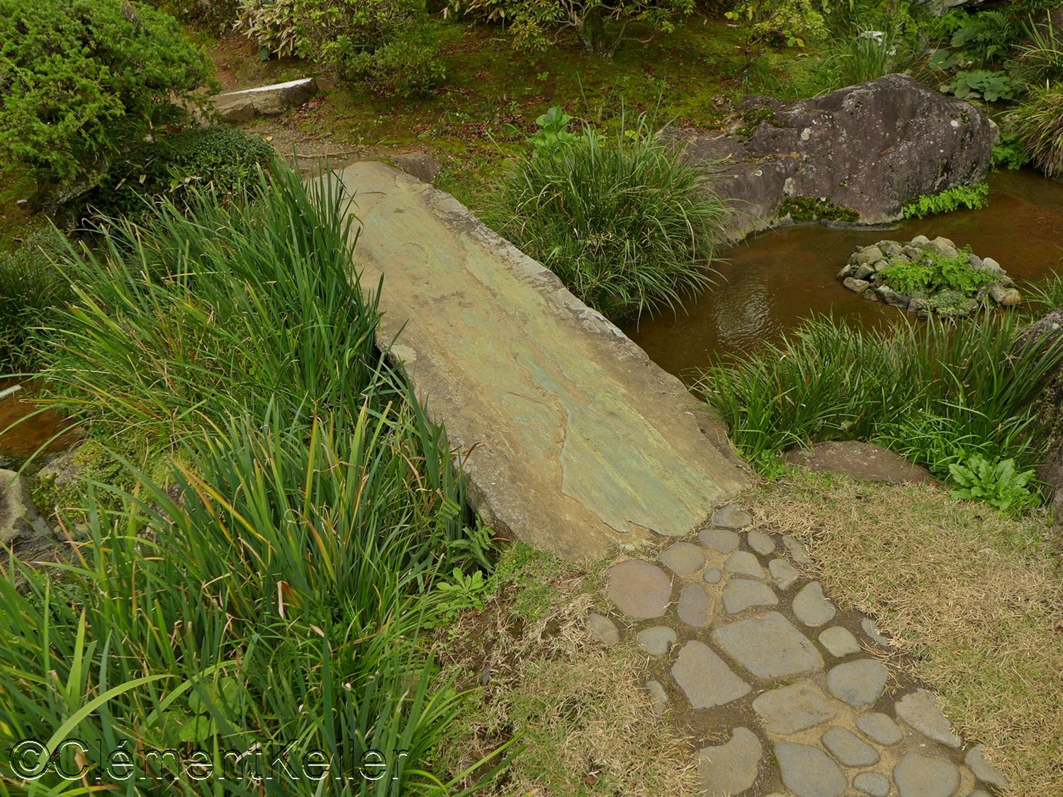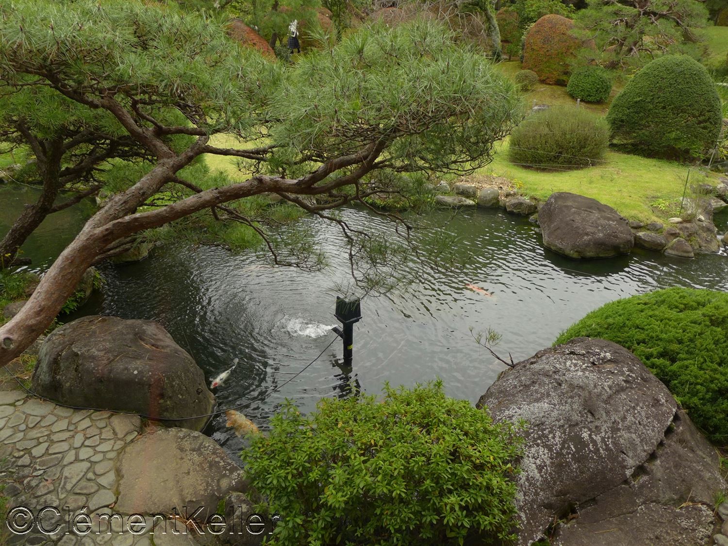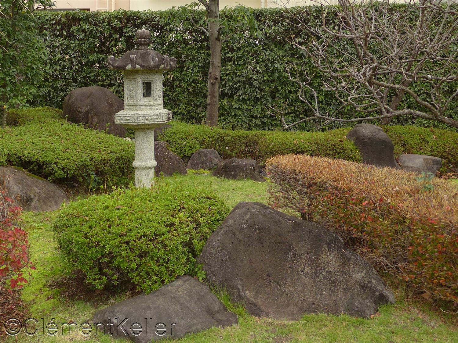 Sa composition paysagère mêle pelouses vallonnées, allées pavées sinueuses, rochers, bosquets d’azalées « tsutsji » つつじ, cognassiers du Japon « karin » かりん, glycines « fuji » ふじ, osmanthus « kinmokusei » 金木犀 et arbres persistants avec un ruisseau et une succession de bassins avec des carpes « koï », dans une atmosphère intime et raffinée.