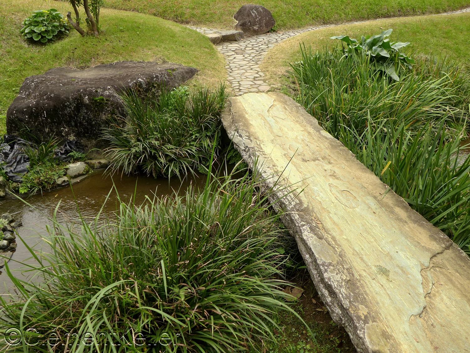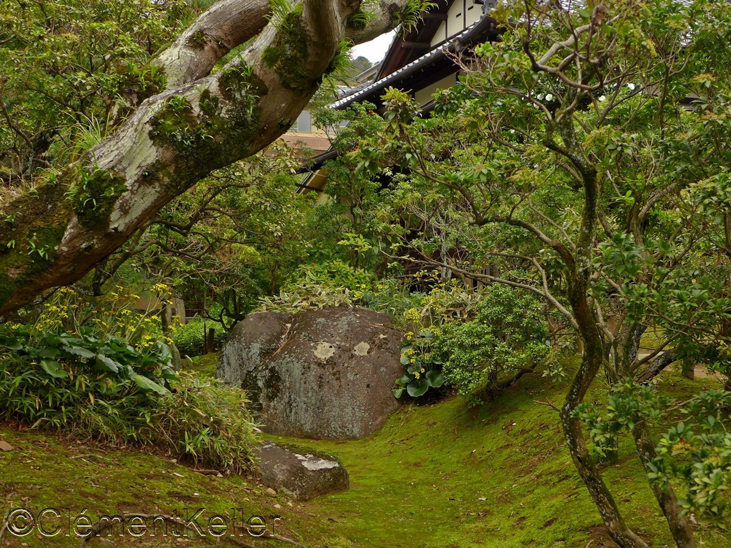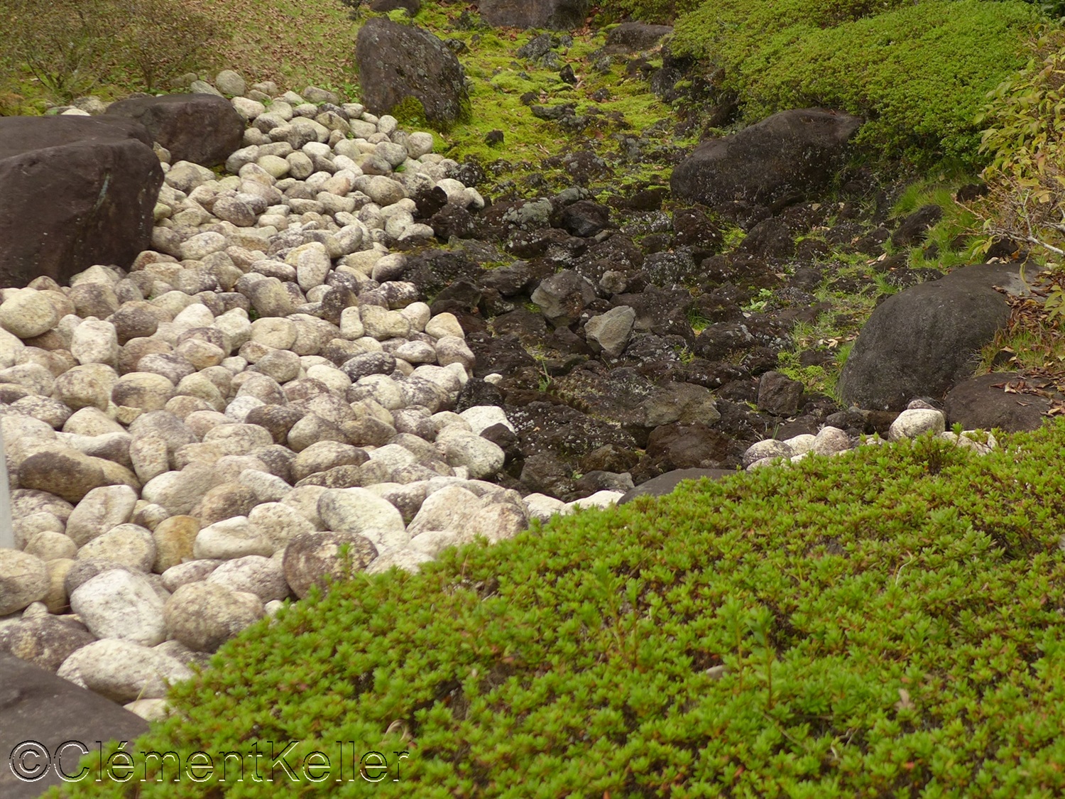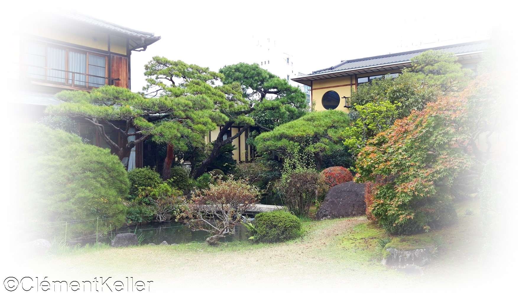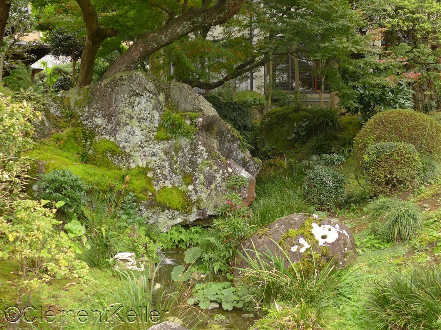 Sa composition paysagère mêle pelouses vallonnées, allées pavées sinueuses, rochers, bosquets d’azalées « tsutsji » つつじ, cognassiers du Japon « karin » かりん, glycines « fuji » ふじ, osmanthus « kinmokusei » 金木犀 et arbres persistants avec un ruisseau et une succession de bassins avec des carpes « koï », dans une atmosphère intime et raffinée.