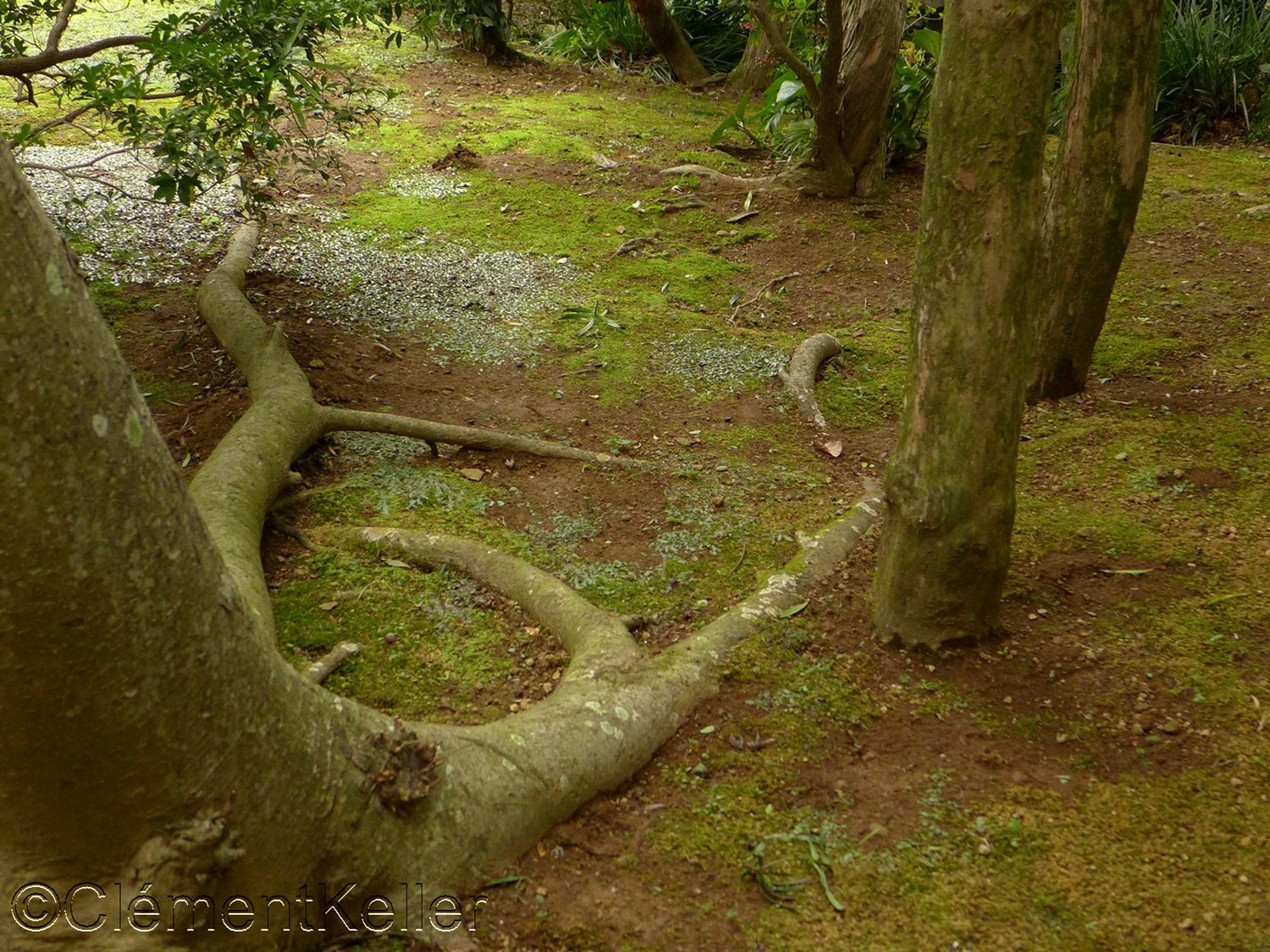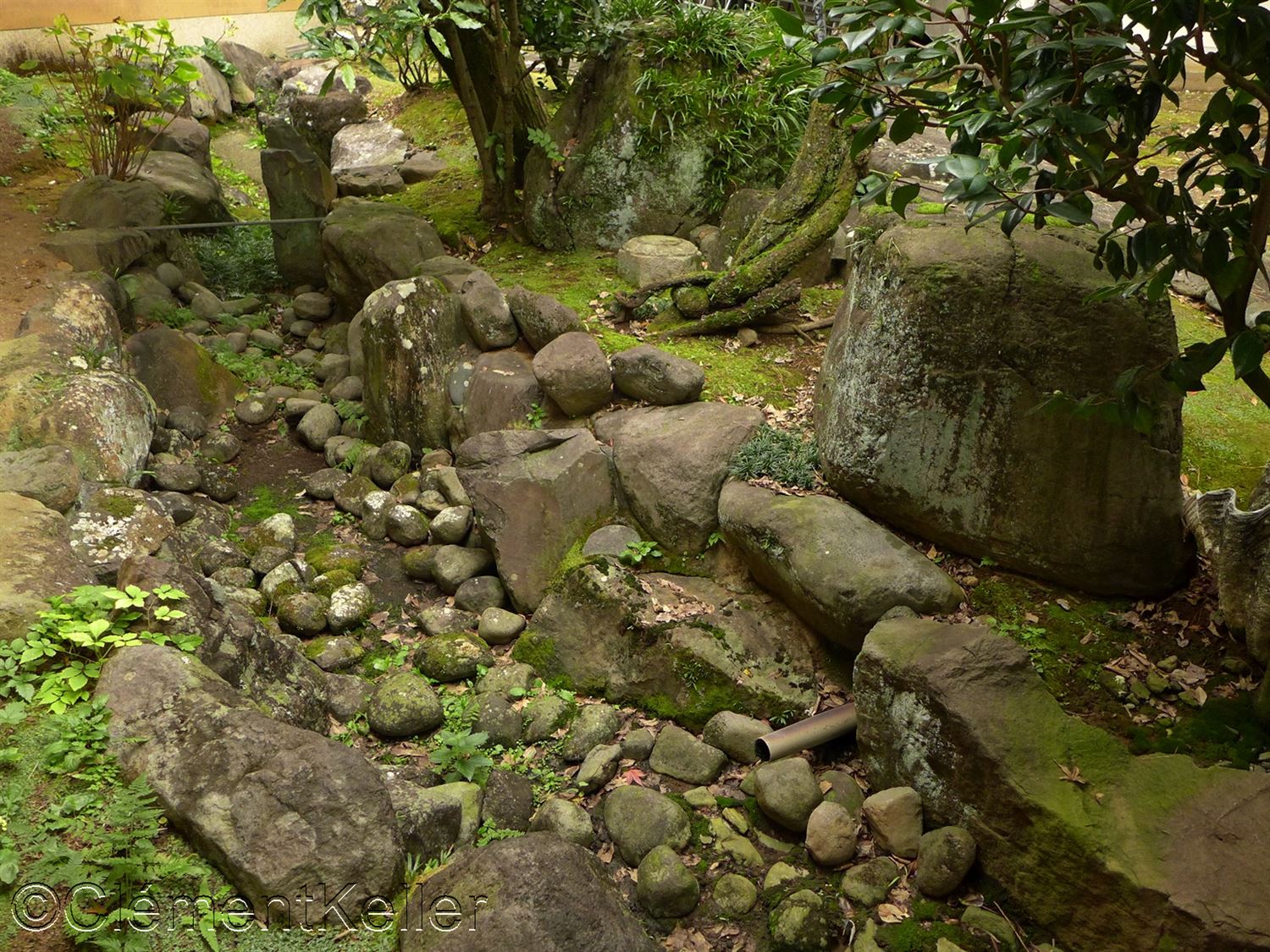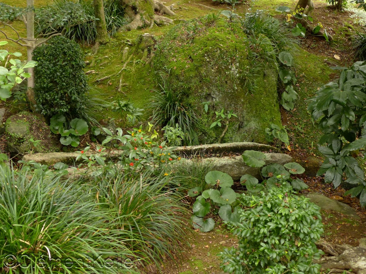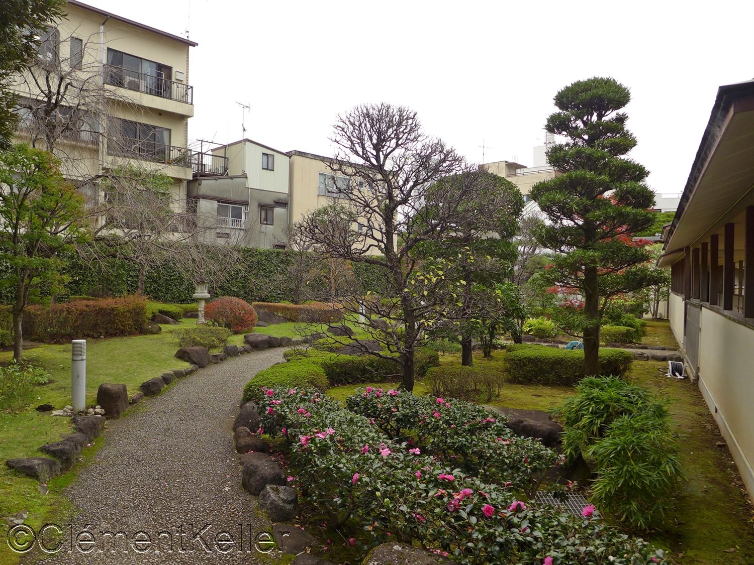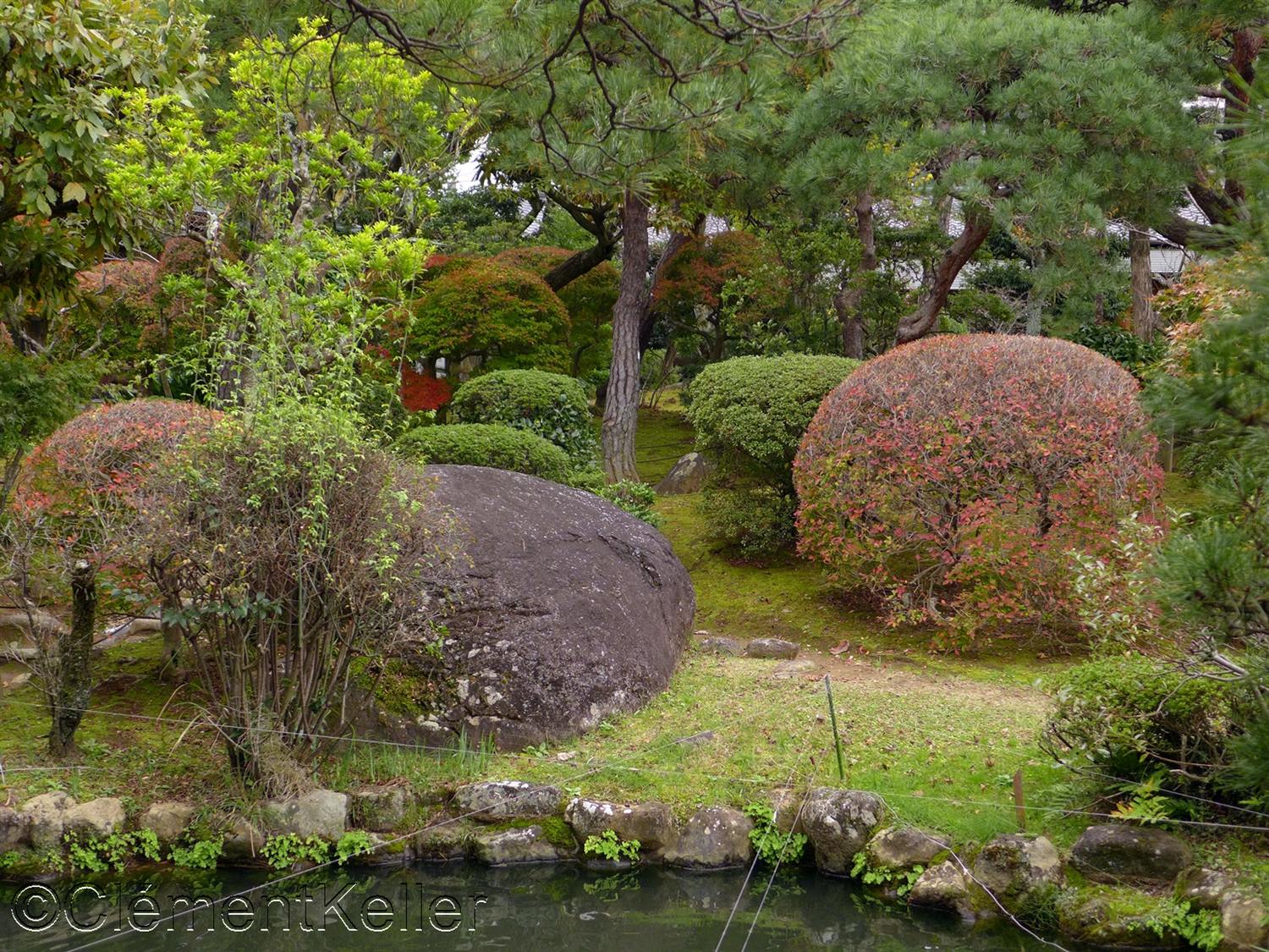 Sa composition paysagère mêle pelouses vallonnées, allées pavées sinueuses, rochers, bosquets d’azalées « tsutsji » つつじ, cognassiers du Japon « karin » かりん, glycines « fuji » ふじ, osmanthus « kinmokusei » 金木犀 et arbres persistants avec un ruisseau et une succession de bassins avec des carpes « koï », dans une atmosphère intime et raffinée.