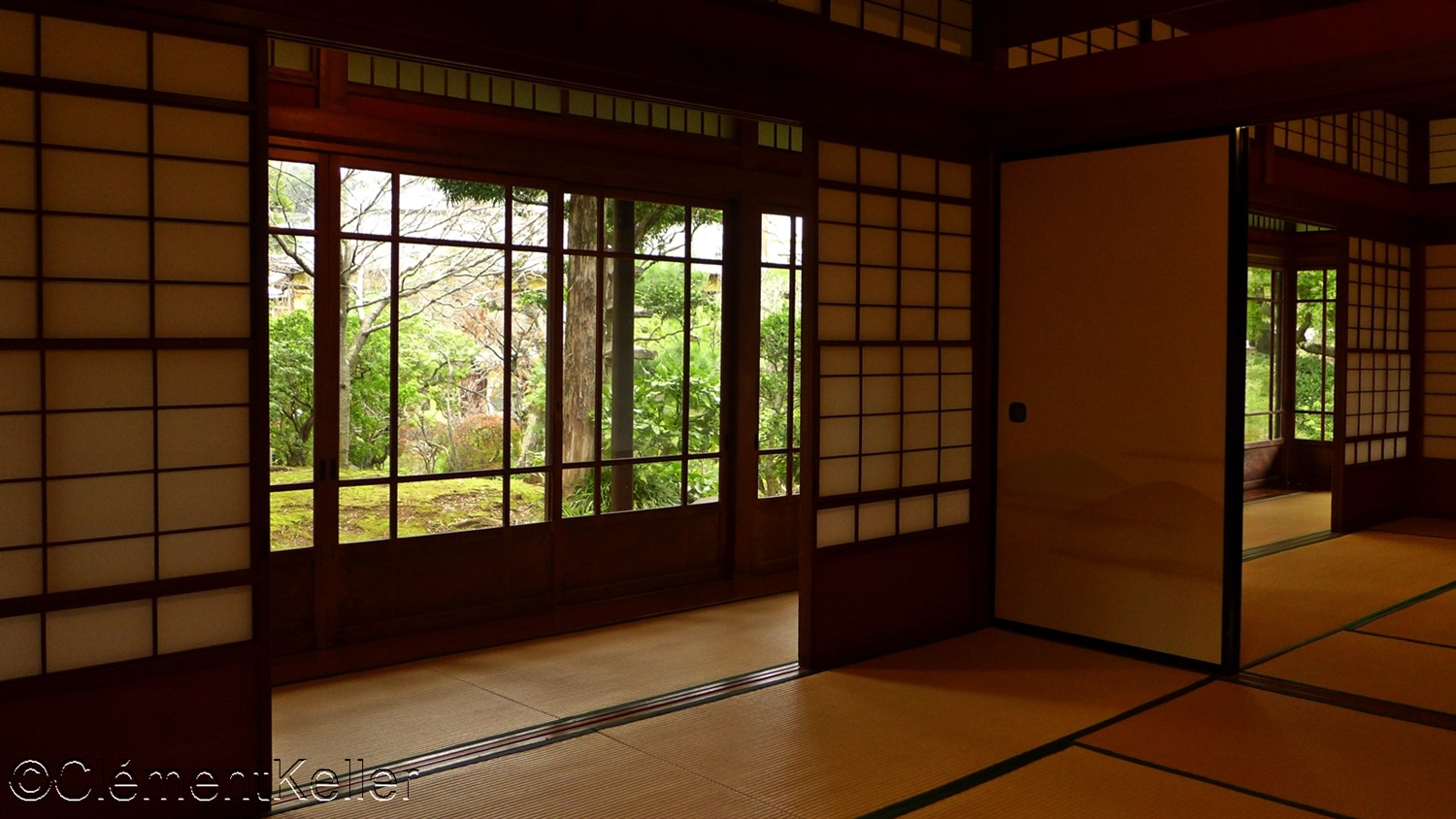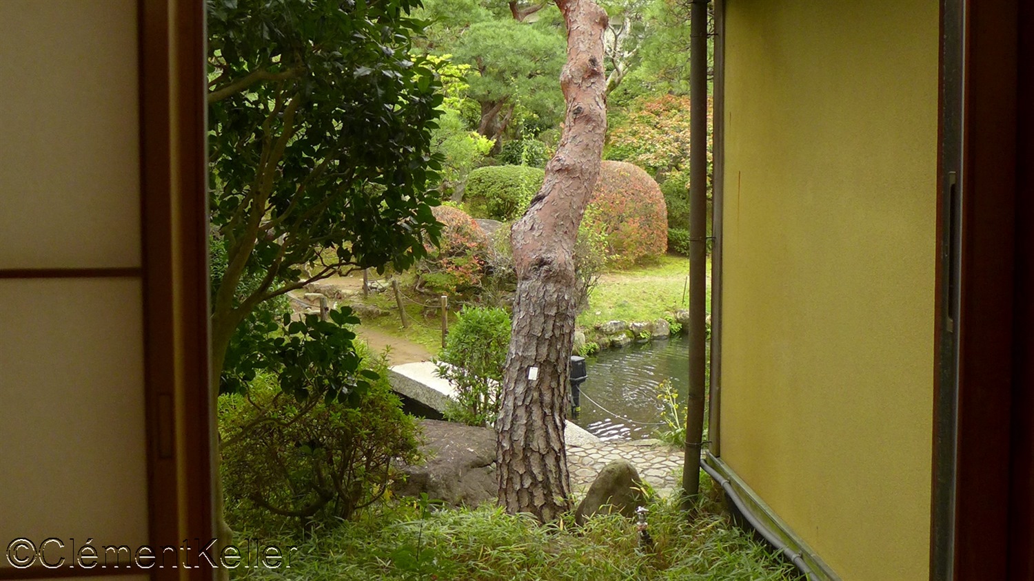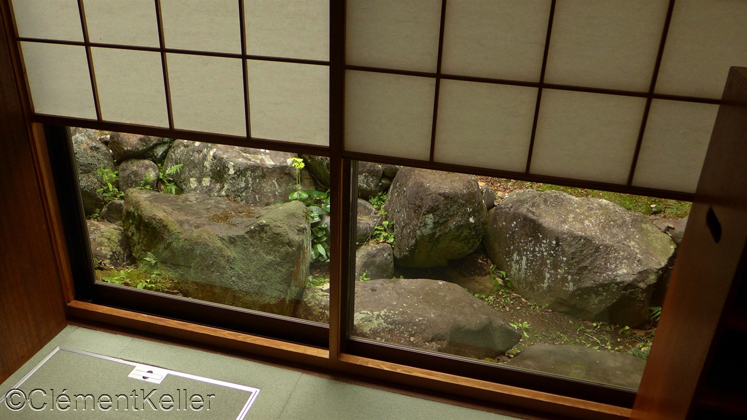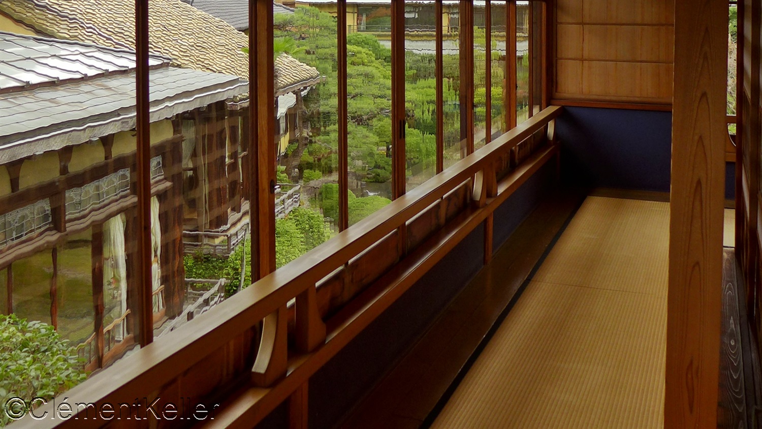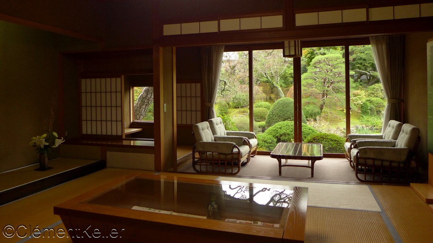 Les espaces intérieurs, mélange subtil d’architecture japonaise traditionnelle et d’éléments occidentaux de l’ère Taishō, s’ouvrent largement sur le jardin par de vastes baies vitrées et des vérandas en bois. Ainsi, depuis les salons, les pièces de réception et les chambres, le regard embrasse les jeux de lumière sur l’eau, la floraison des saisons et la composition savamment orchestrée des perspectives paysagères, offrant aux visiteurs un dialogue constant entre l’habitat et la nature.