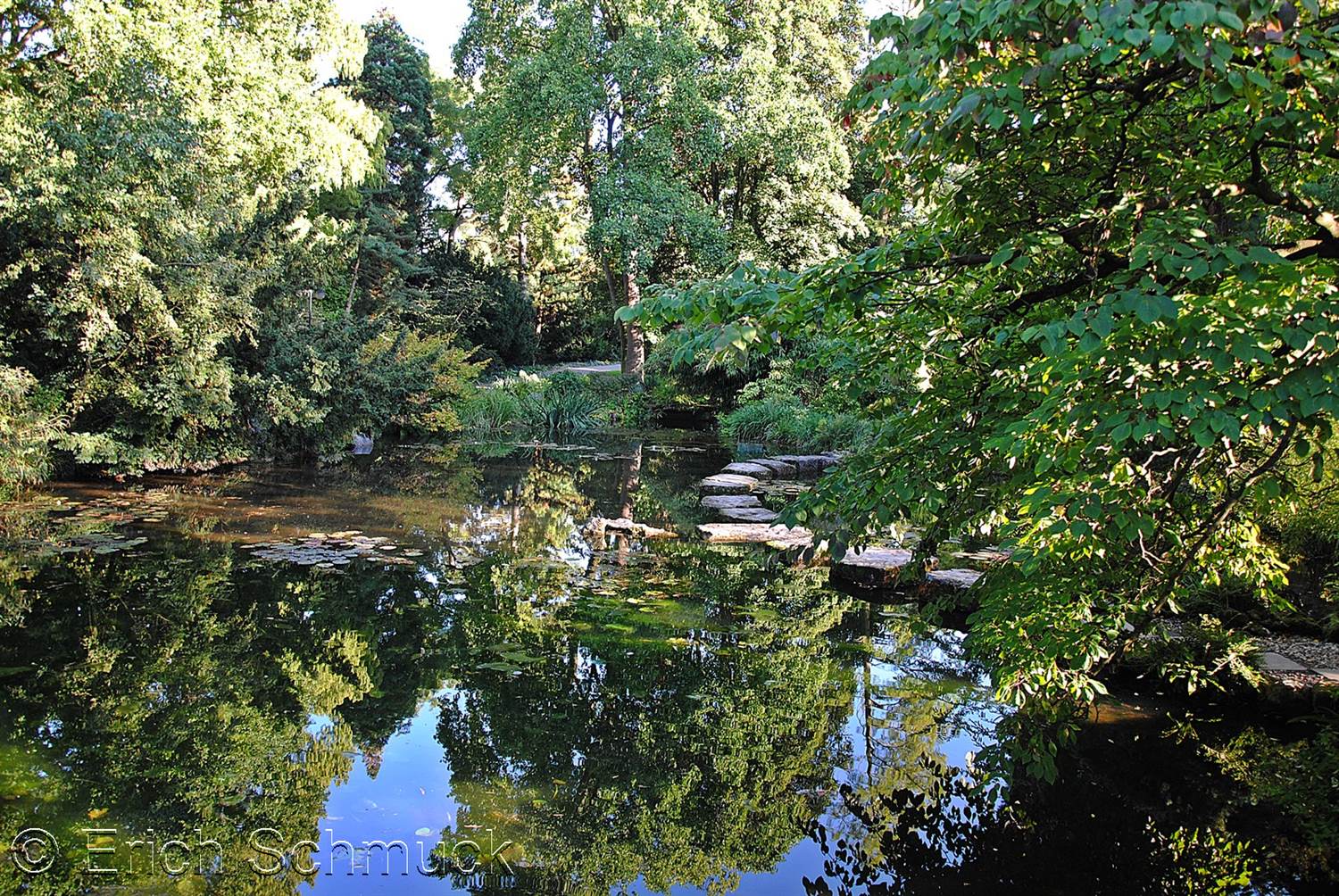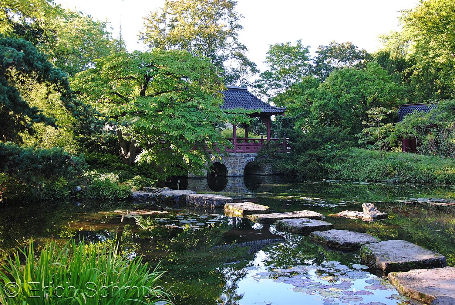 Sur une surface d’environ 15 000 m², le jardin s’organise autour d’un système de bassins et de ruisseaux alimentés artificiellement, qui structurent la promenade. Les cheminements empruntent les cinq ponts qui franchissement les méandres des cours d’eau. Le pont Mikadobrücke est le plus emblématique. Le pont Laubenbrücke est recouvert d’une treille et conduit au pavillon de thé Teehaus.