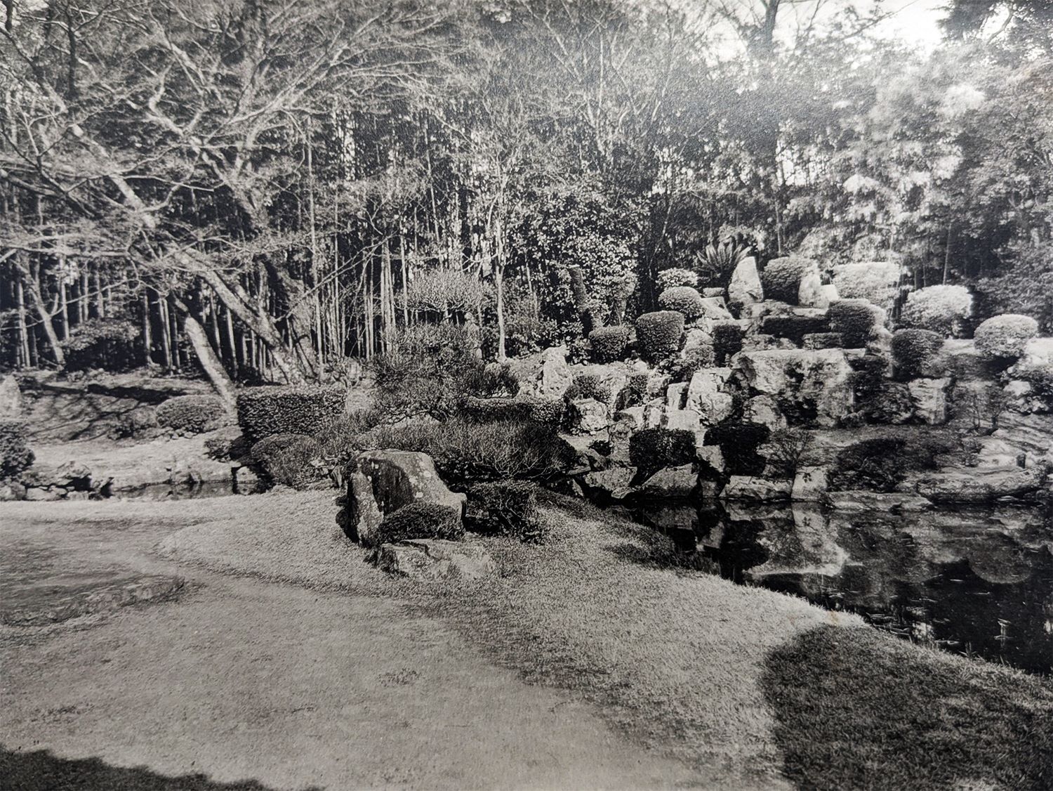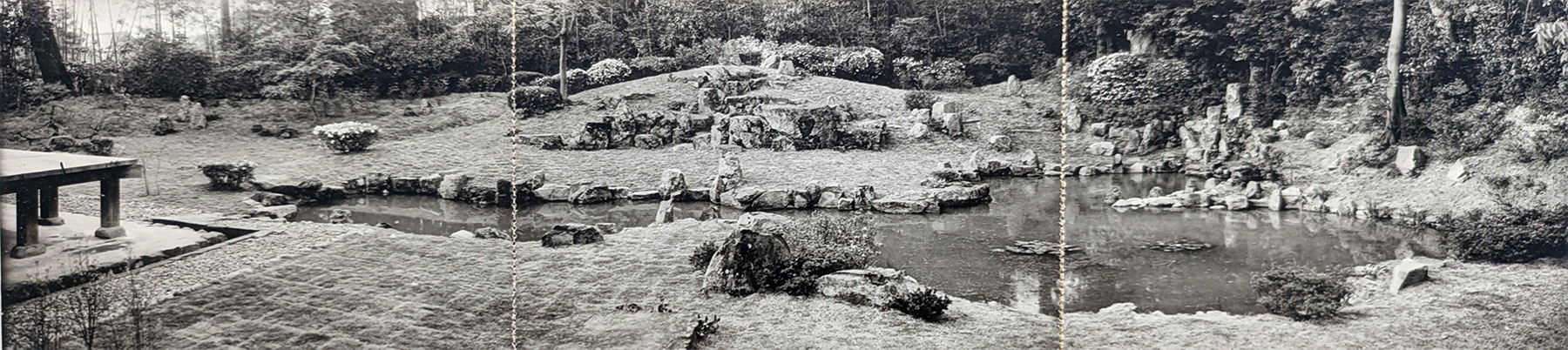 Carte postale et photographie tirée de « Histoire illustrée des jardins japonais, période Muromachi, vol. 1 » de Mirei Shigemori publié le 23 juillet 1937, communiqués par le service de promotion culturelle de Masuda.
