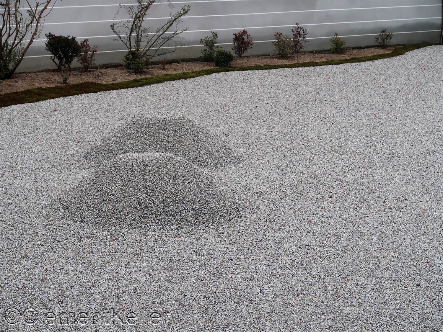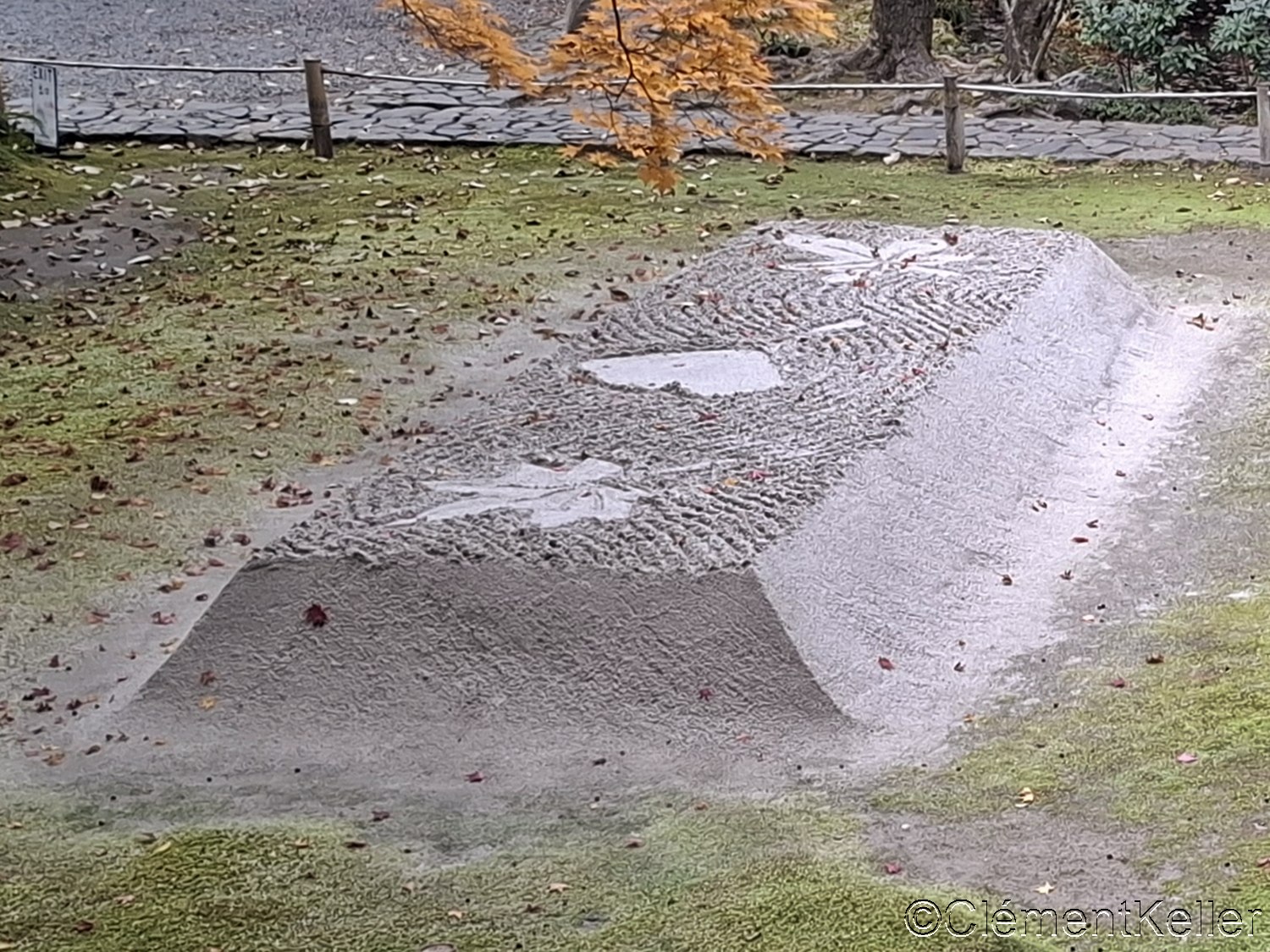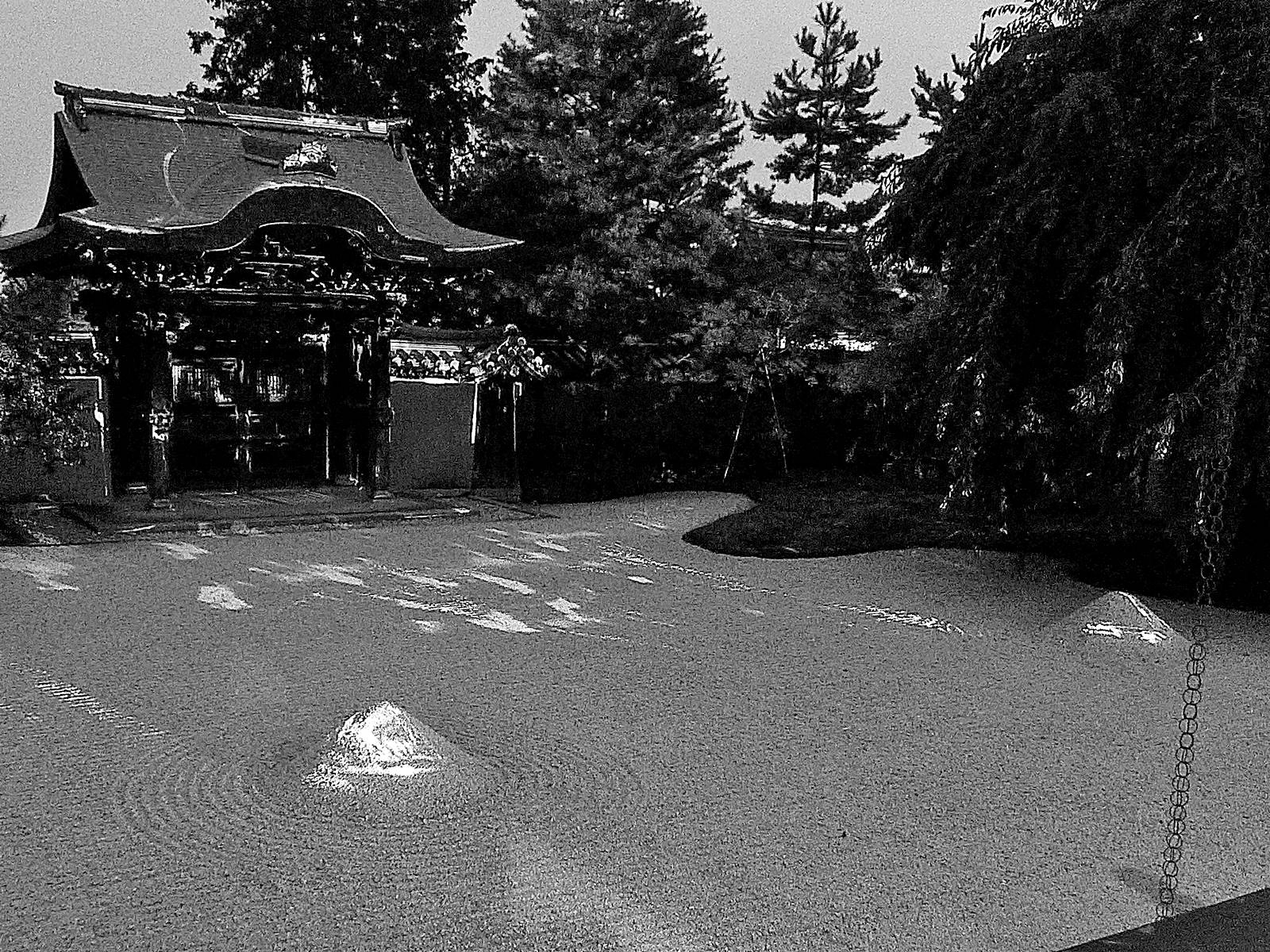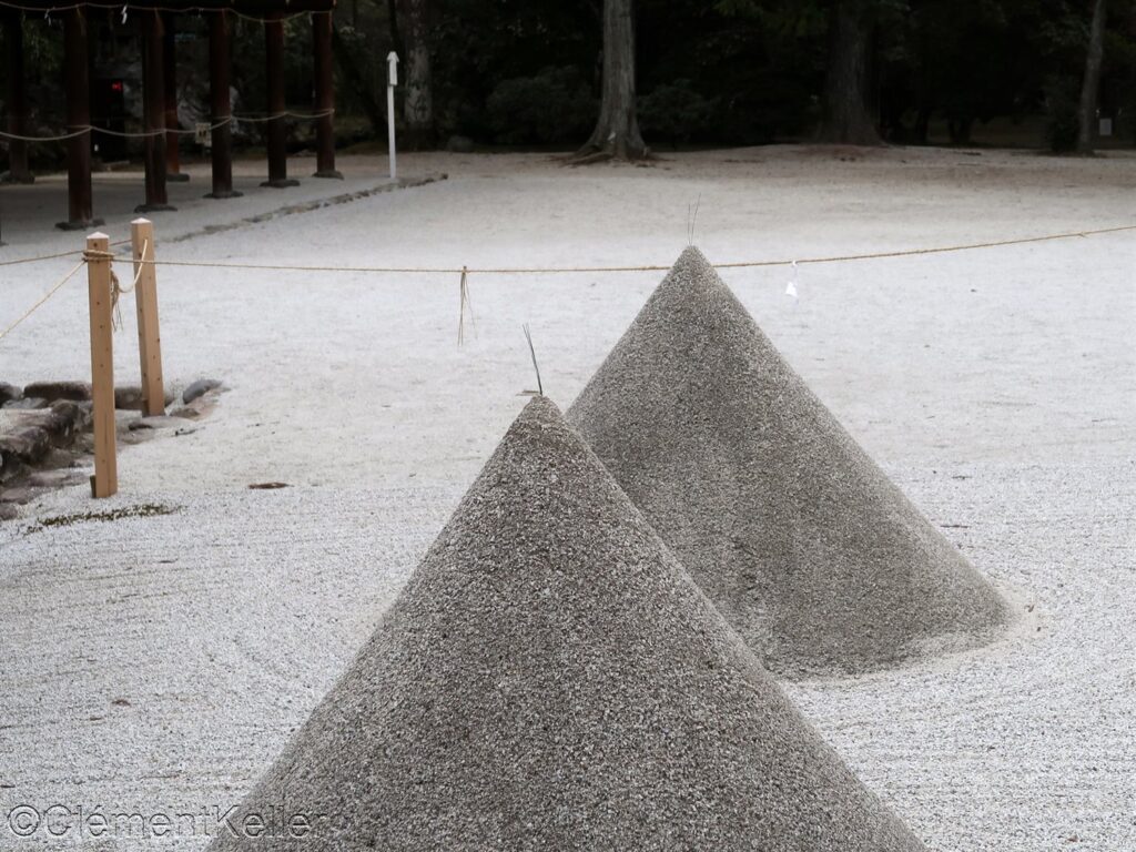 La quatrième photo est celle d’un des deux monticules implantés après avoir passé le portail principal du temple Honen-in à Kyoto. Ces monticules sont appelés Byakusa-dan 白砂壇, ce que l’on peut traduire par « autels de sable blanc ». Ces volumes de sable de base rectangulaire et de forme de cône tronqué sont décorés sur leur surface supérieure de motifs végétaux, telle la feuille d’érable à la saison de « momiji kōyō » 紅葉狩り. Ces deux monticules remplissent une fonction de purification, le sable blanc étant traditionnellement associé à la pureté dans le bouddhisme et le shintōisme.