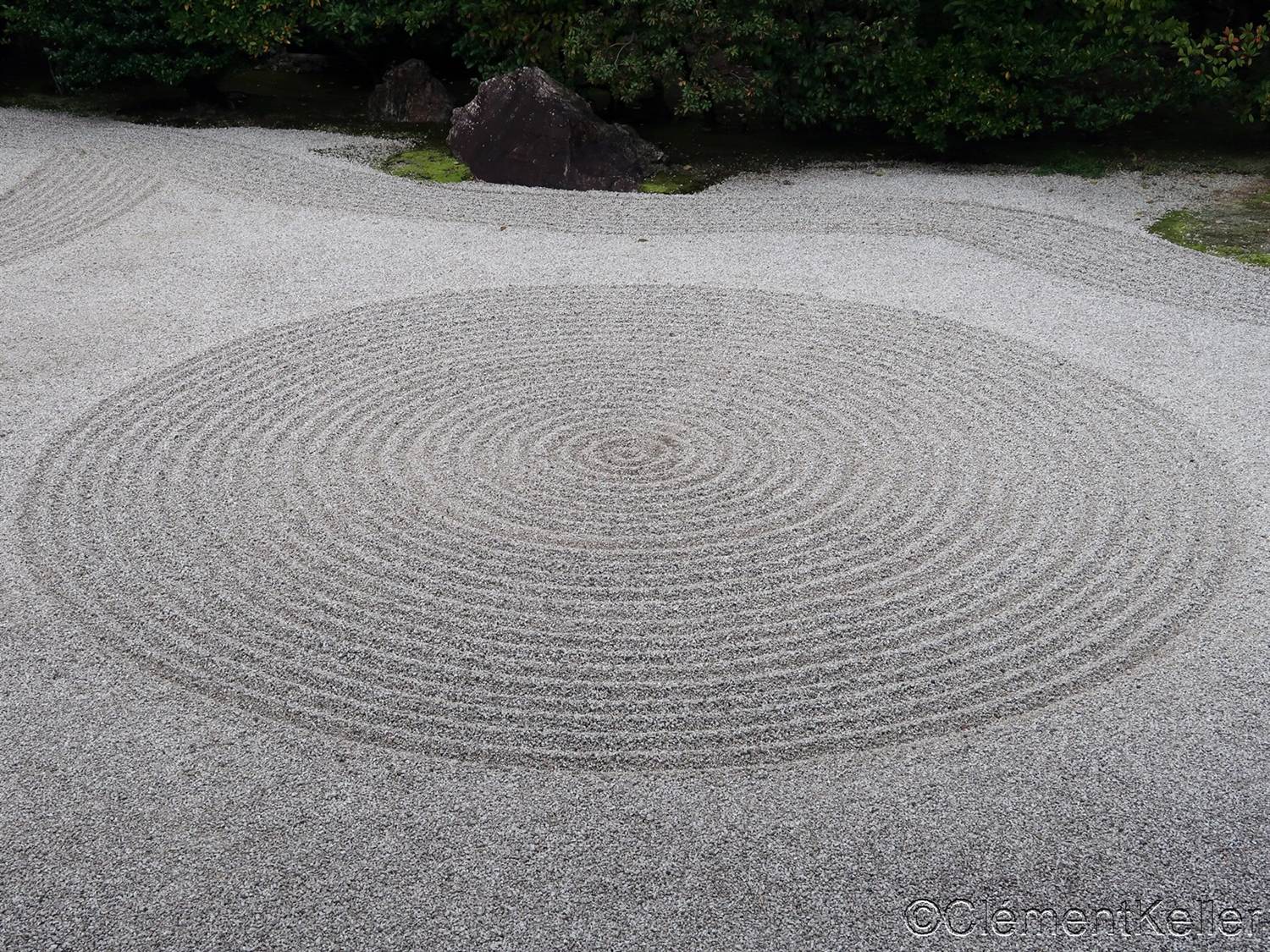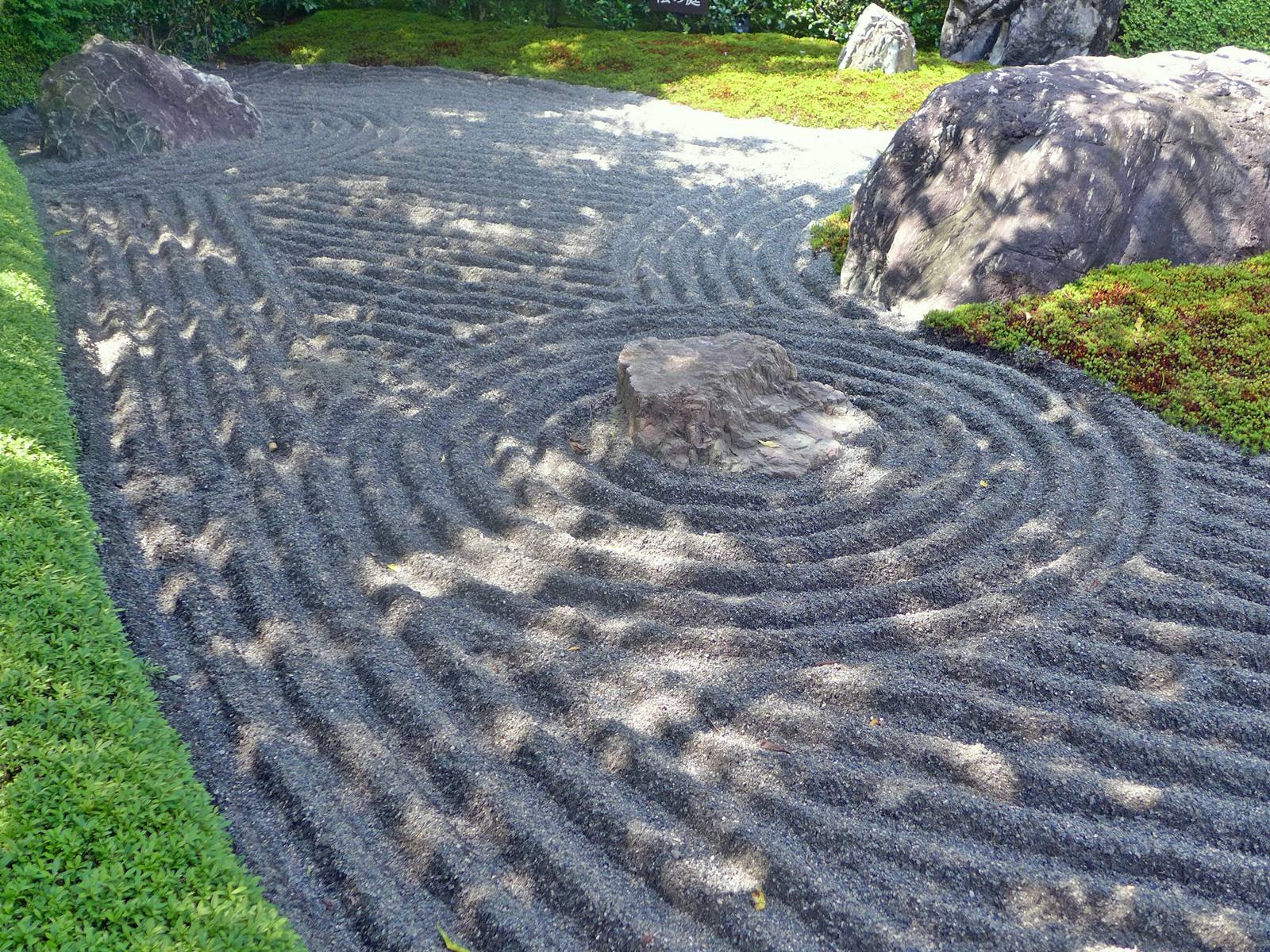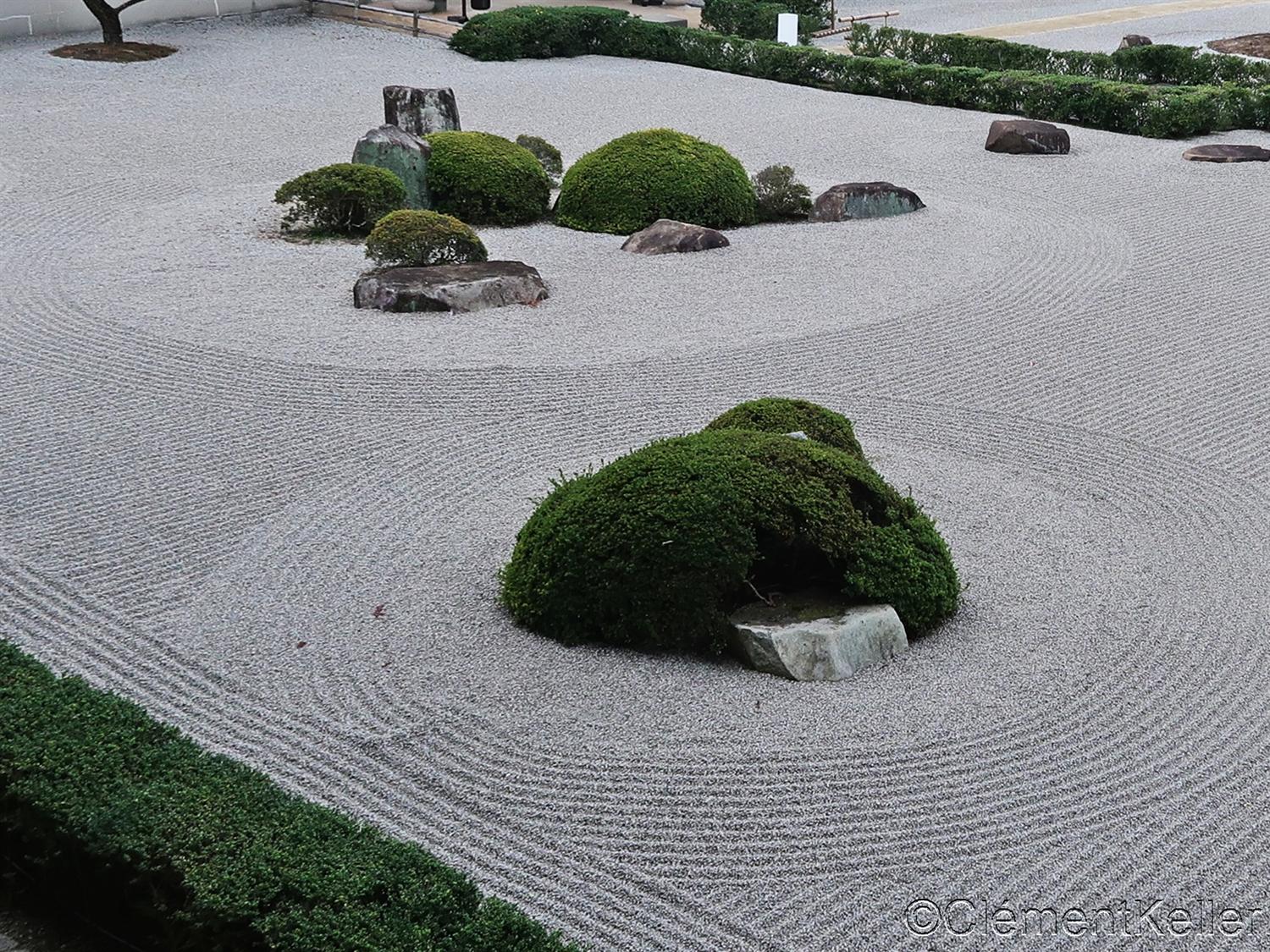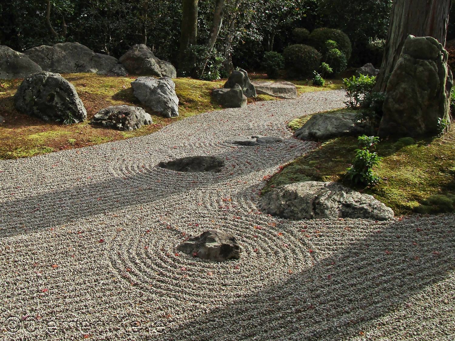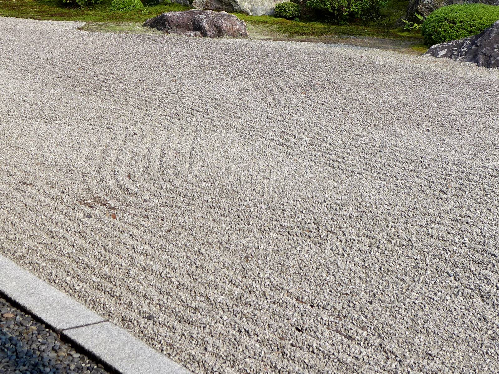 Il existe aussi le ratissage qui prend la forme de cercles concentriques tels ceux formés à la surface de l’eau lorsqu’un caillou tombe dans l’eau. Les deux exemples ci-dessous sont visibles au temple Ryogen-in, dans les deux petits espaces Koda-tei et Tōtekiko créé par Gakushō NABESHIMA en 1960, à Kyōto.