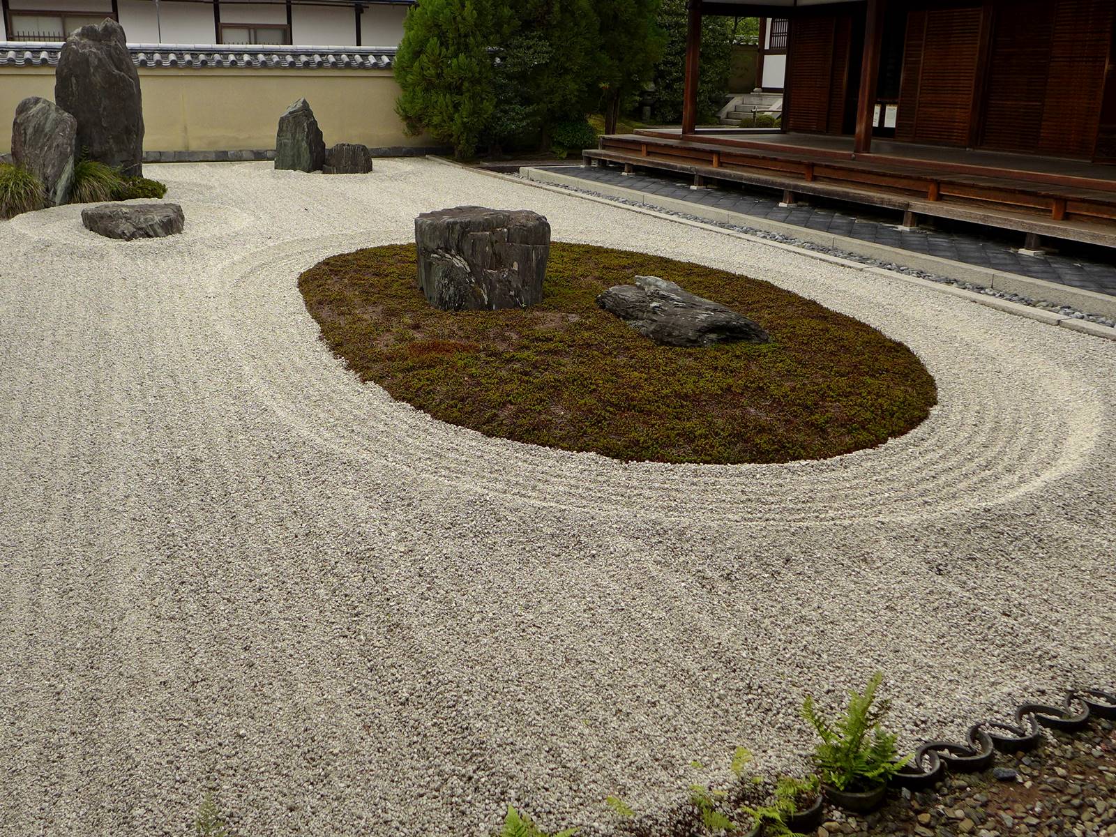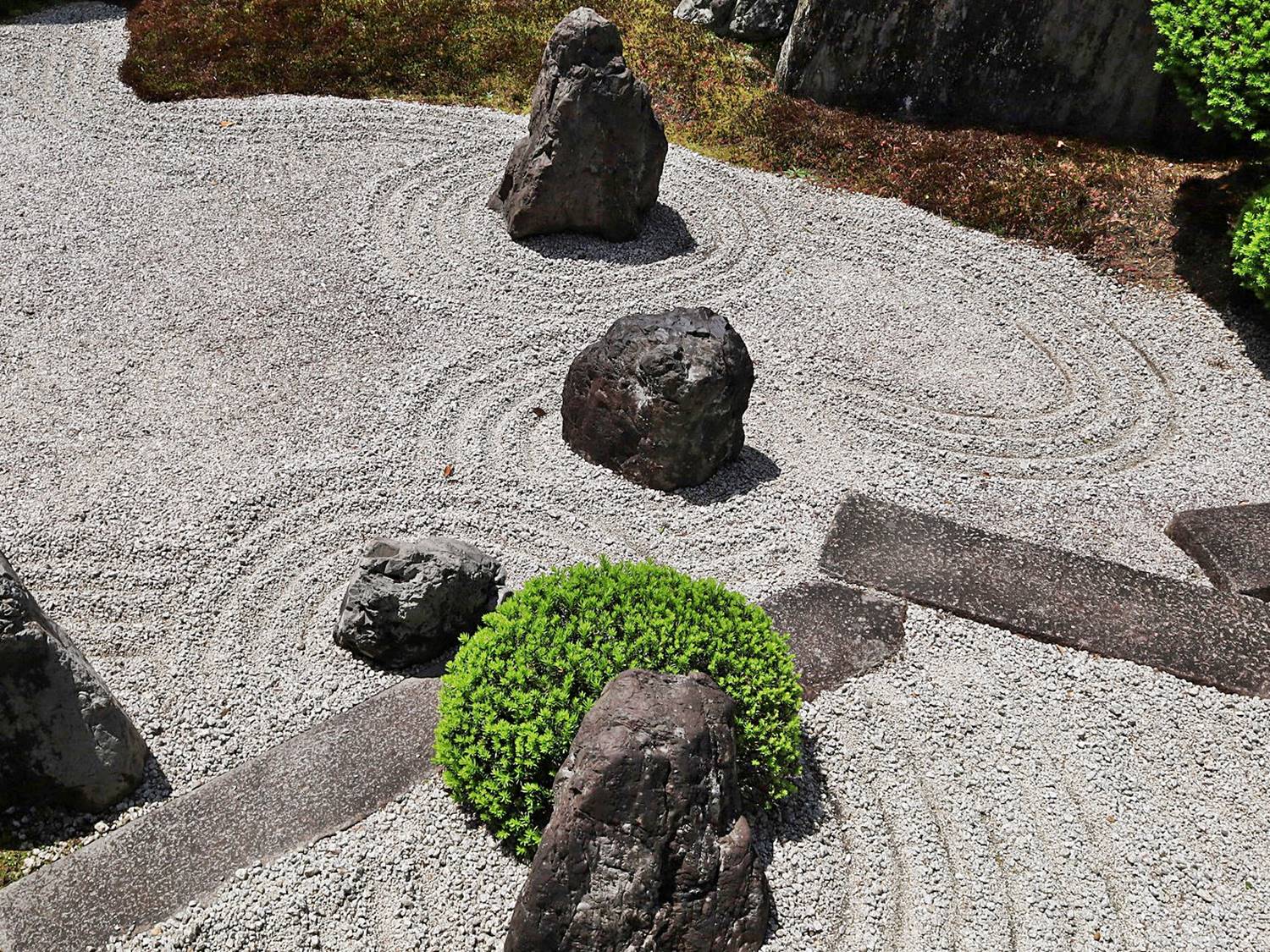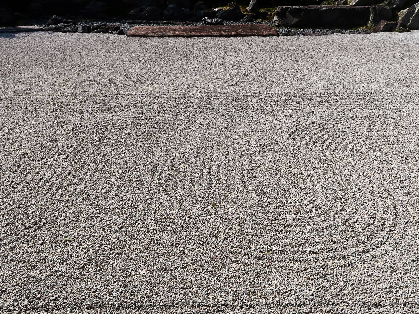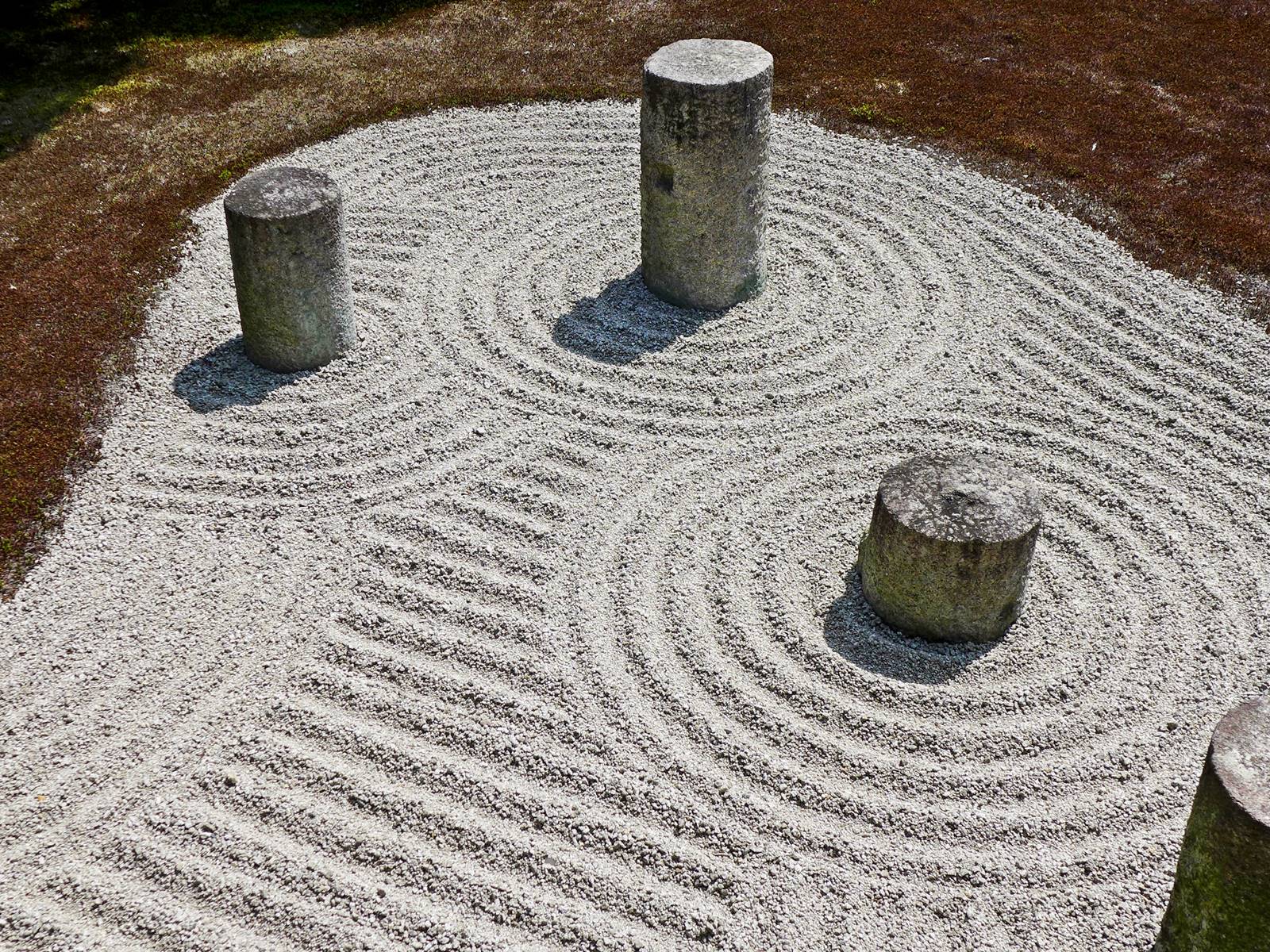 Il existe aussi le ratissage qui prend la forme de cercles concentriques tels ceux formés à la surface de l’eau lorsqu’un caillou tombe dans l’eau. Les deux exemples ci-dessous sont visibles au temple Ryogen-in, dans les deux petits espaces Koda-tei et Tōtekiko créé par Gakushō NABESHIMA en 1960, à Kyōto.
