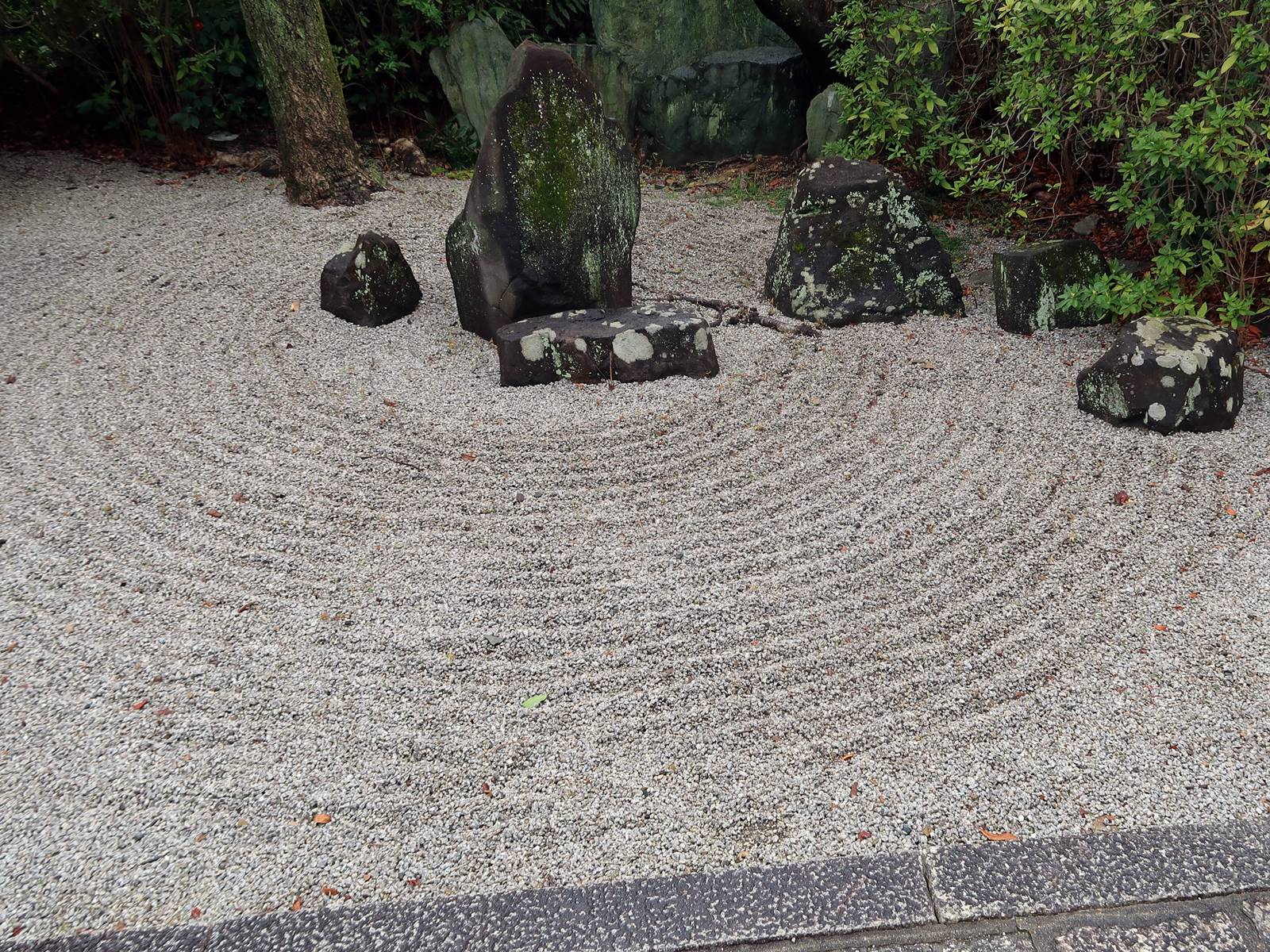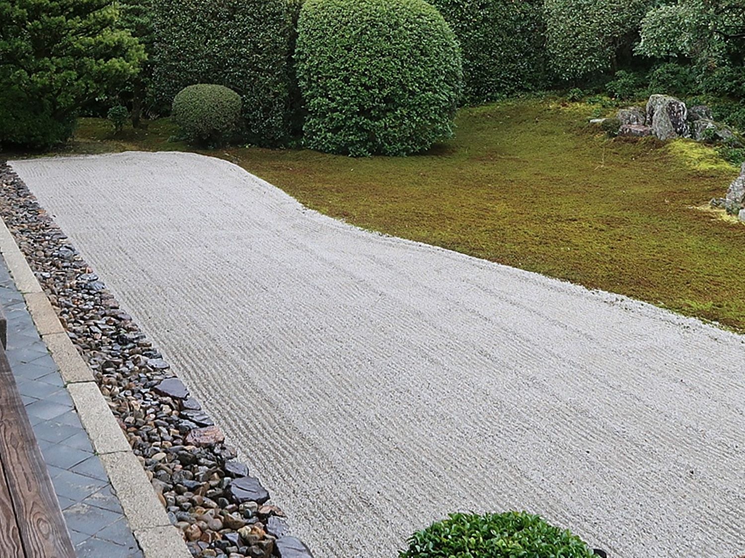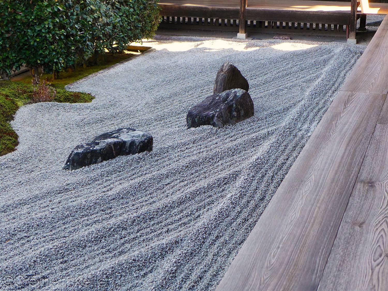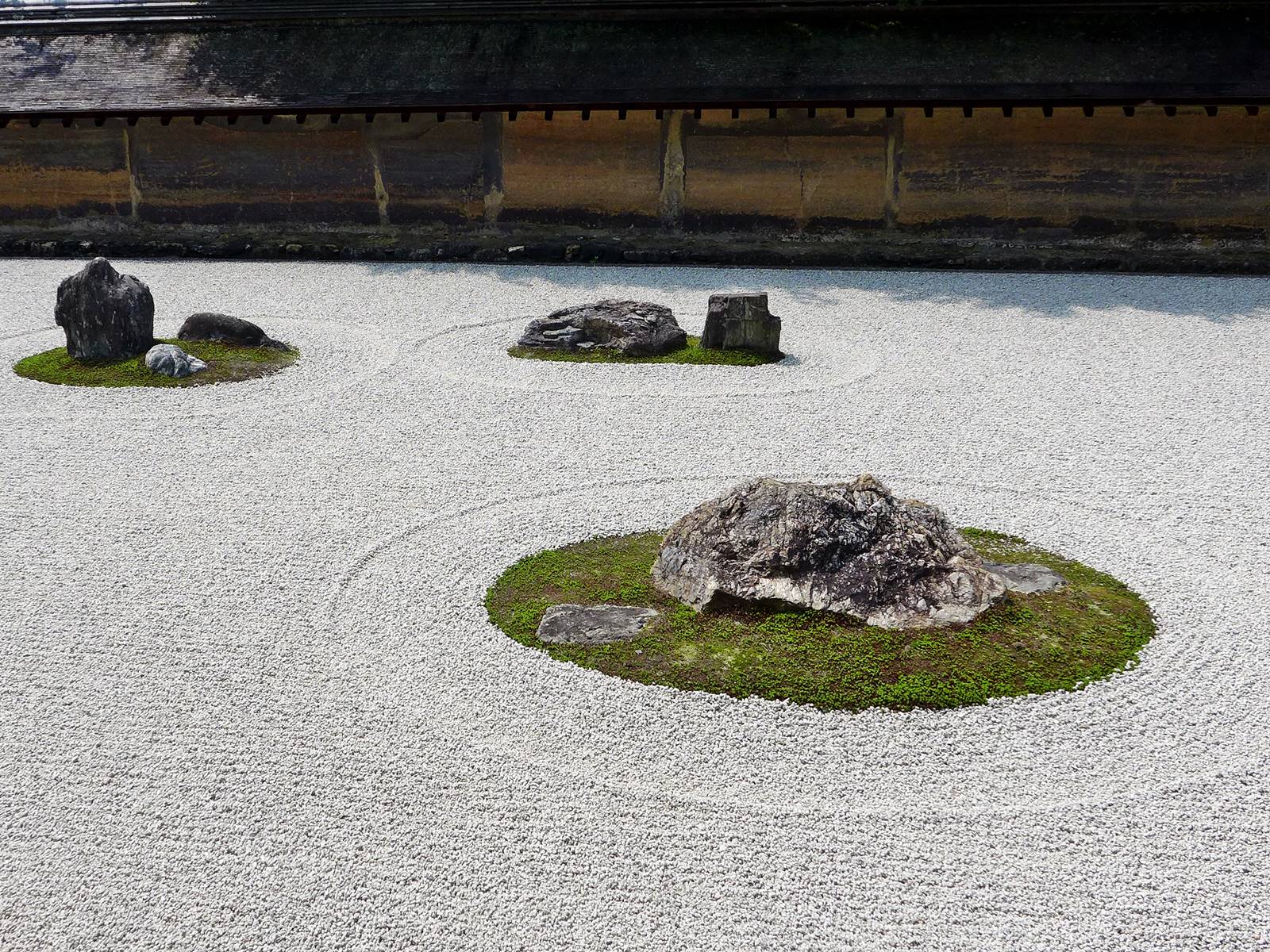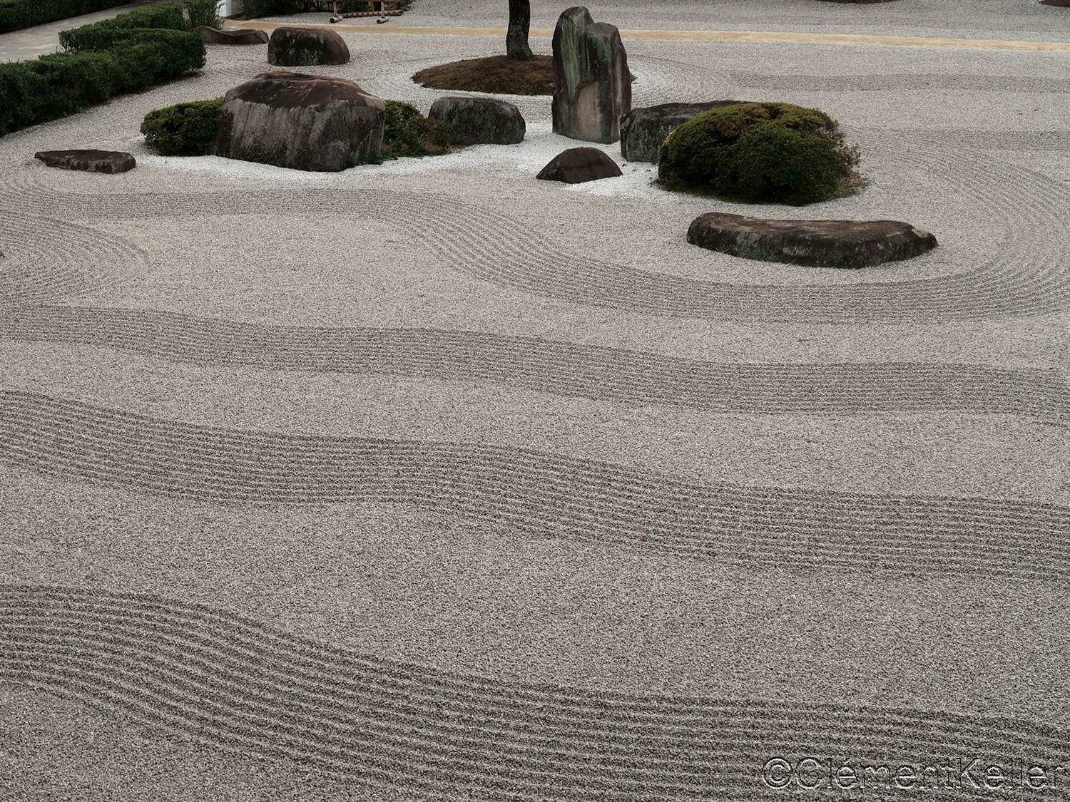 Il existe aussi le ratissage qui prend la forme de cercles concentriques tels ceux formés à la surface de l’eau lorsqu’un caillou tombe dans l’eau. Les deux exemples ci-dessous sont visibles au temple Ryogen-in, dans les deux petits espaces Koda-tei et Tōtekiko créé par Gakushō NABESHIMA en 1960, à Kyōto.