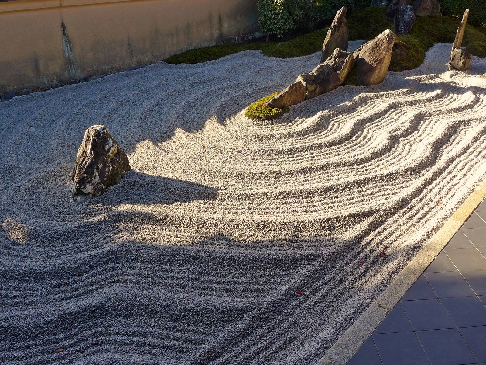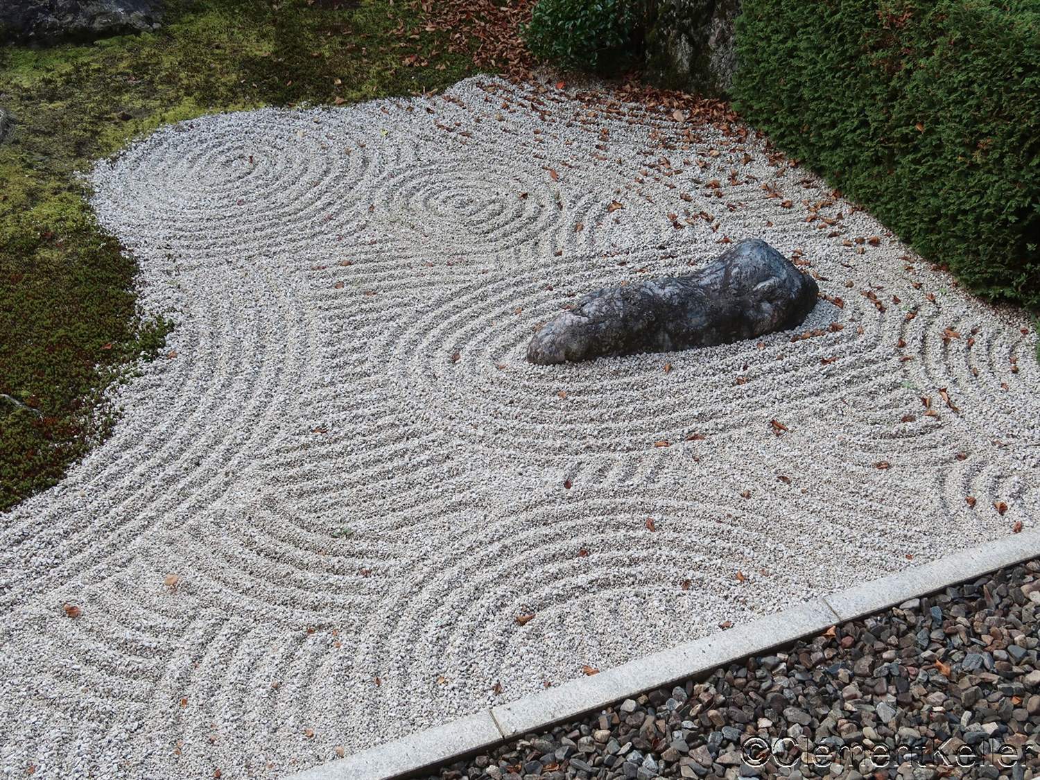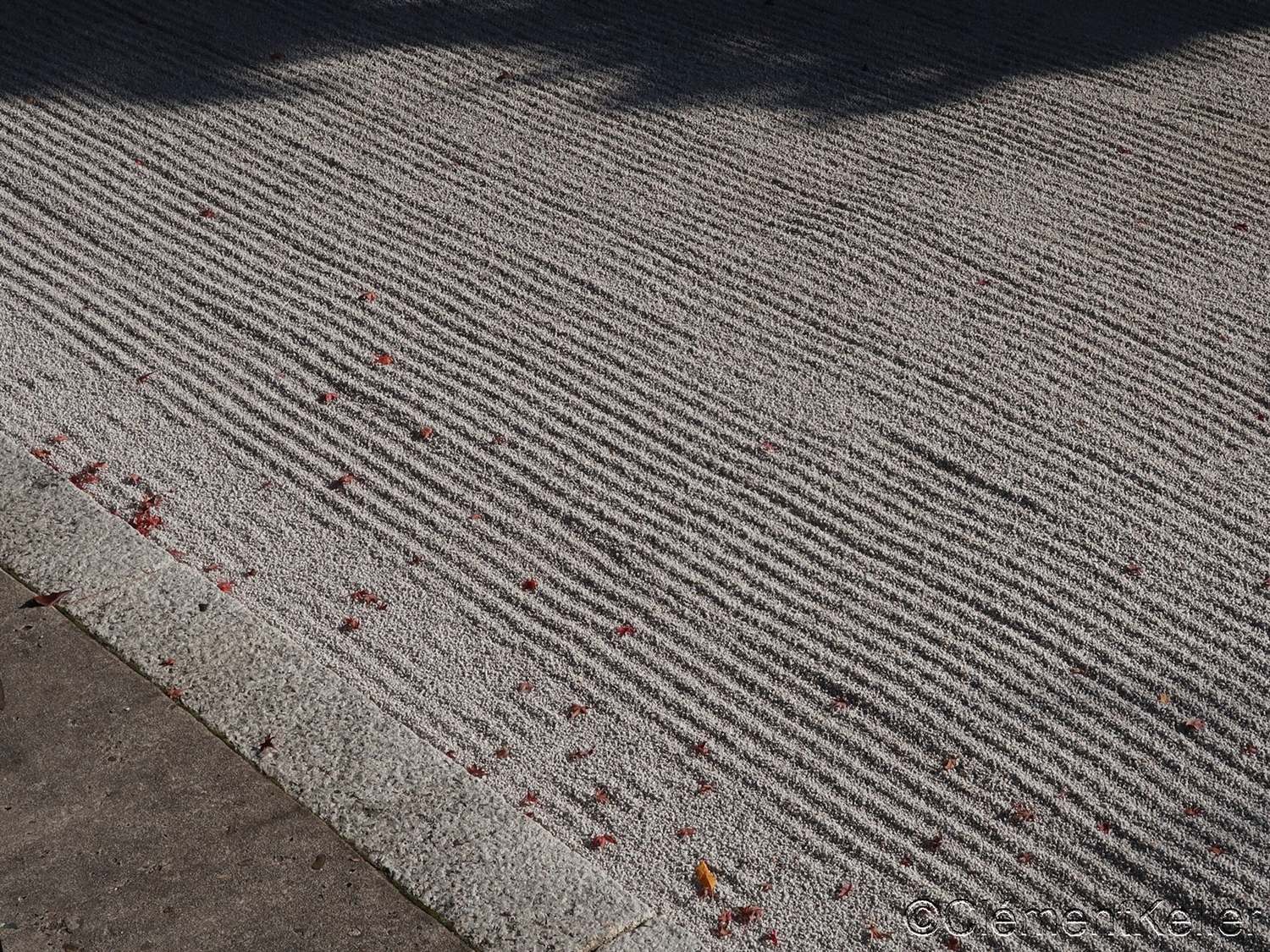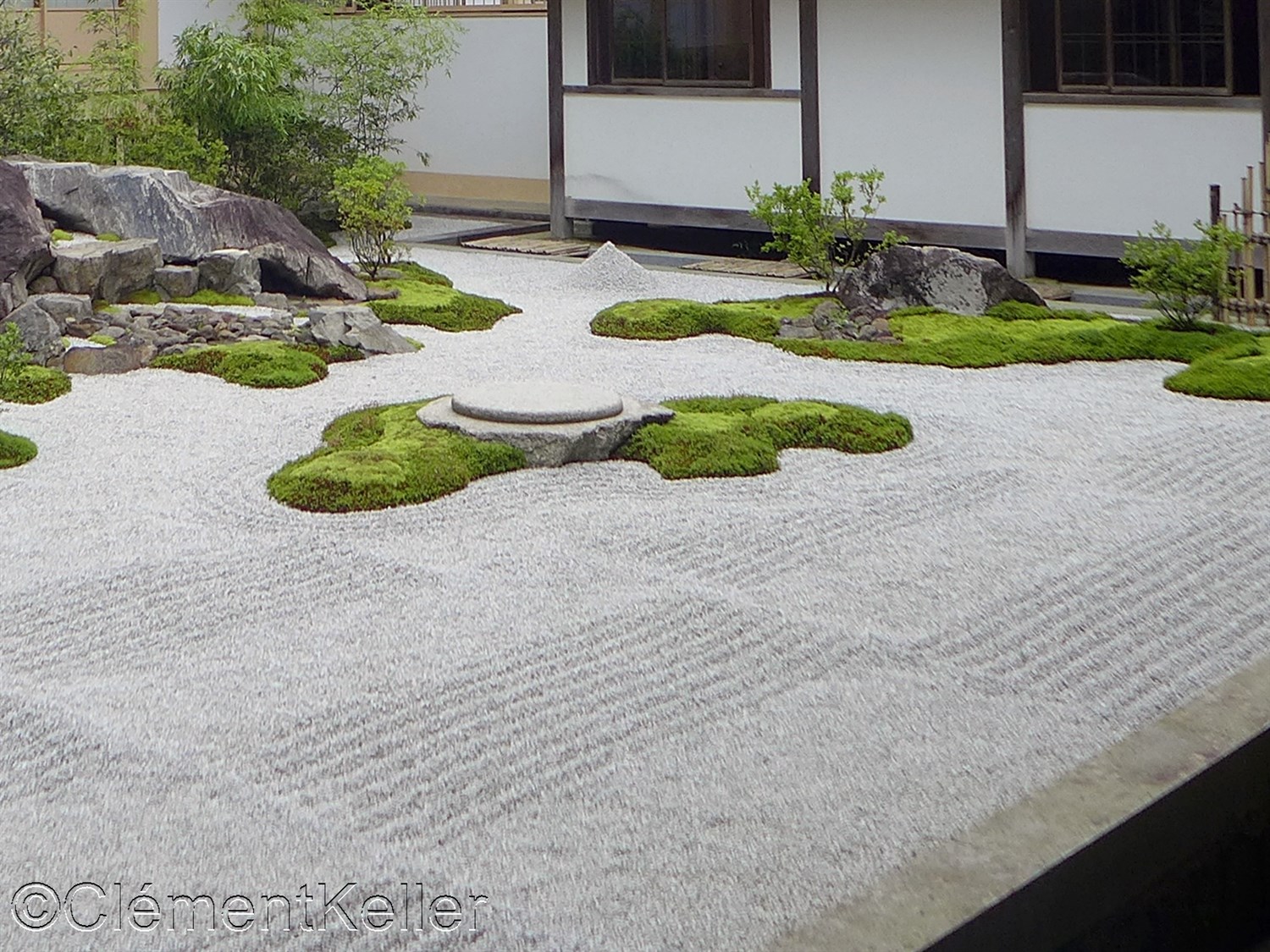 Il existe aussi le ratissage qui prend la forme de cercles concentriques tels ceux formés à la surface de l’eau lorsqu’un caillou tombe dans l’eau. Les deux exemples ci-dessous sont visibles au temple Ryogen-in, dans les deux petits espaces Koda-tei et Tōtekiko créé par Gakushō NABESHIMA en 1960, à Kyōto.