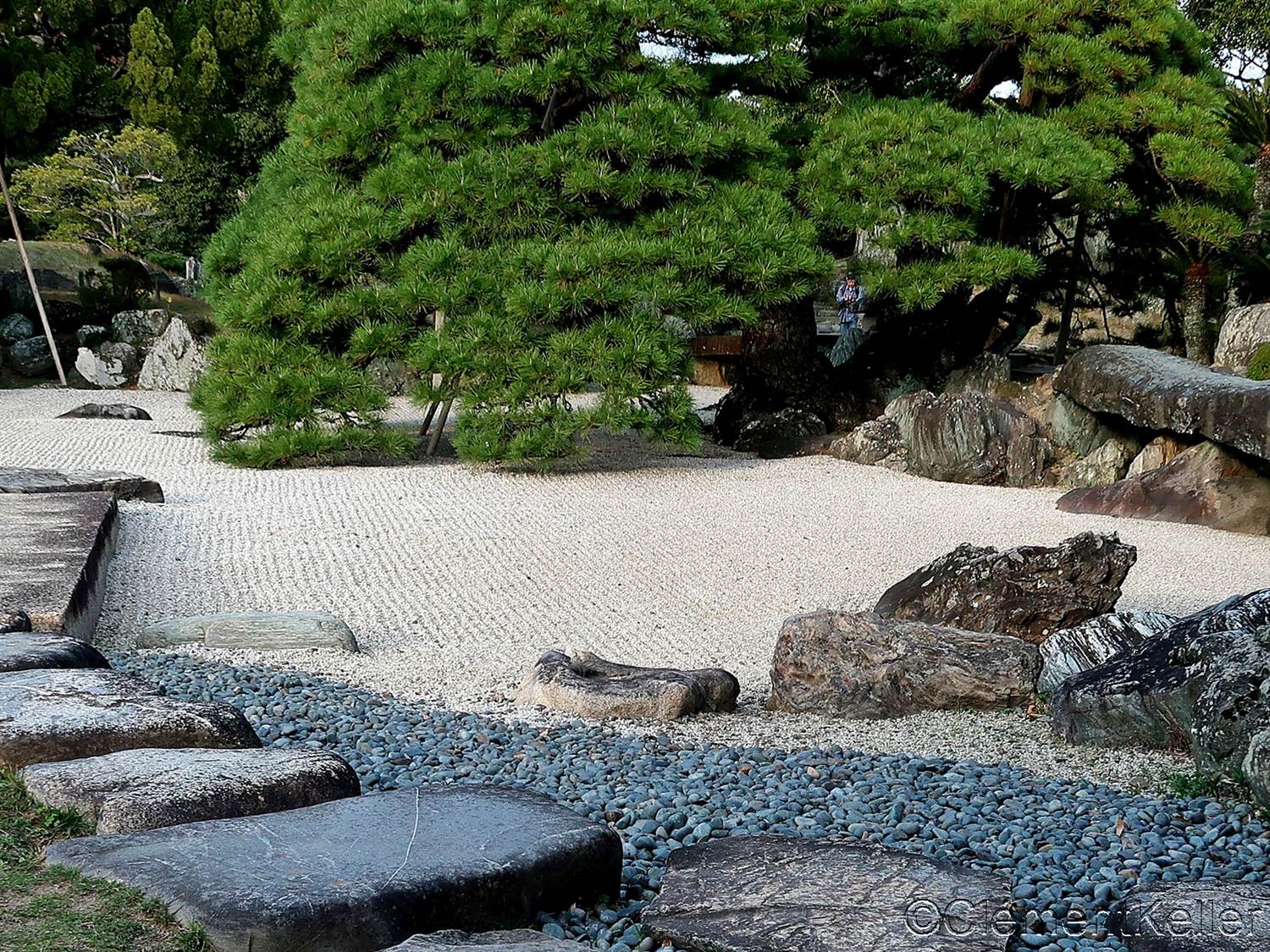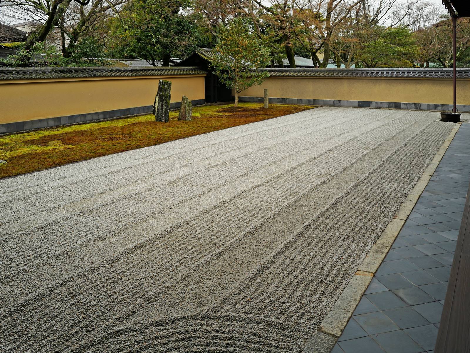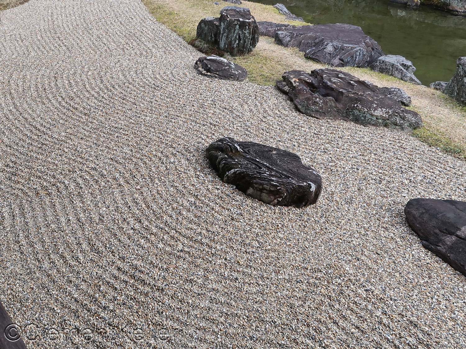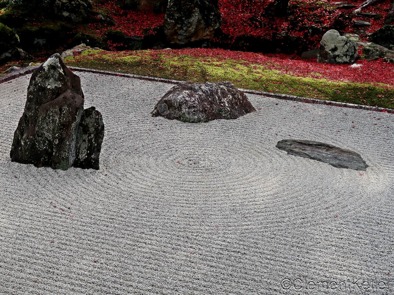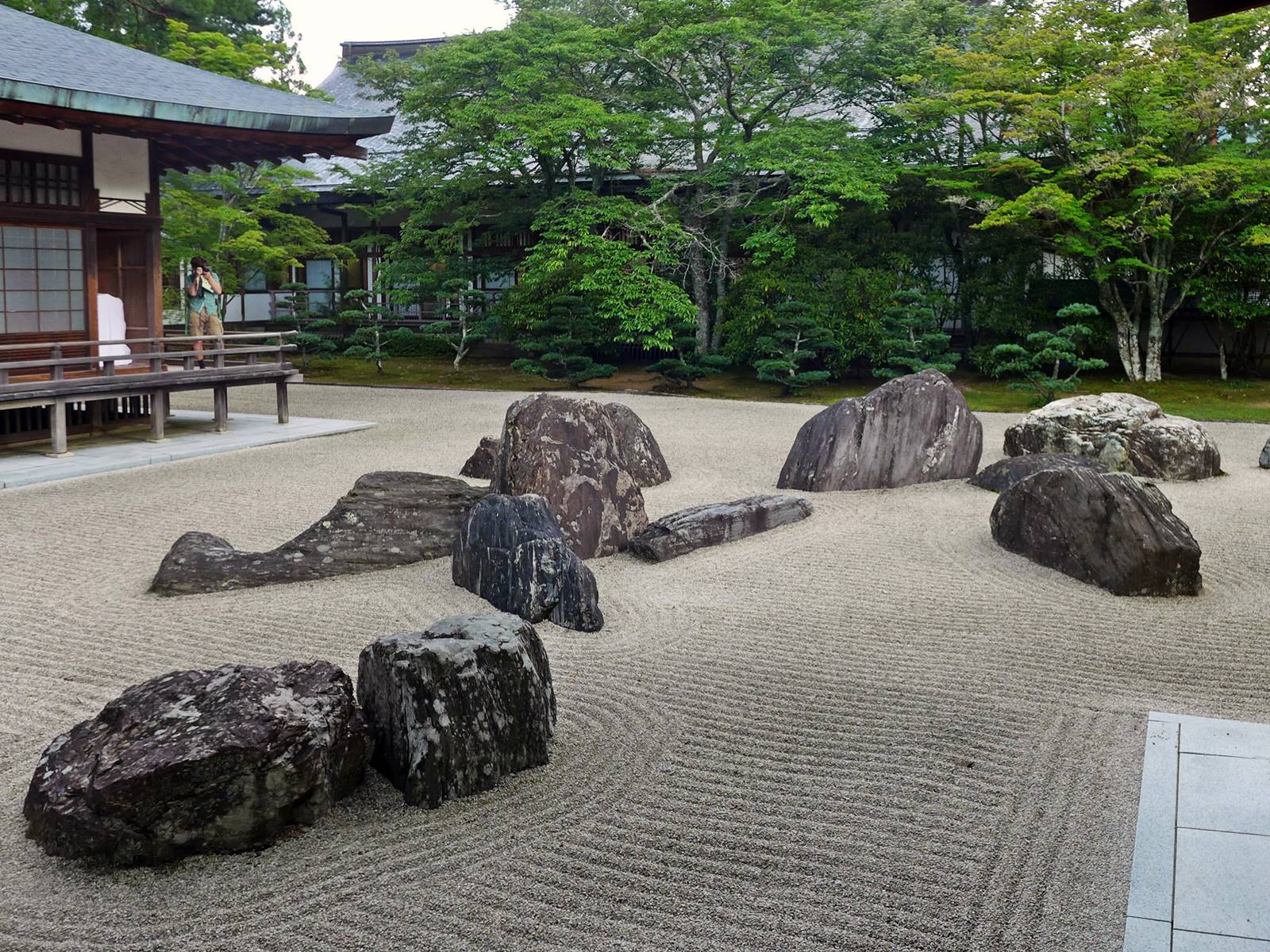 Il existe aussi le ratissage qui prend la forme de cercles concentriques tels ceux formés à la surface de l’eau lorsqu’un caillou tombe dans l’eau. Les deux exemples ci-dessous sont visibles au temple Ryogen-in, dans les deux petits espaces Koda-tei et Tōtekiko créé par Gakushō NABESHIMA en 1960, à Kyōto.