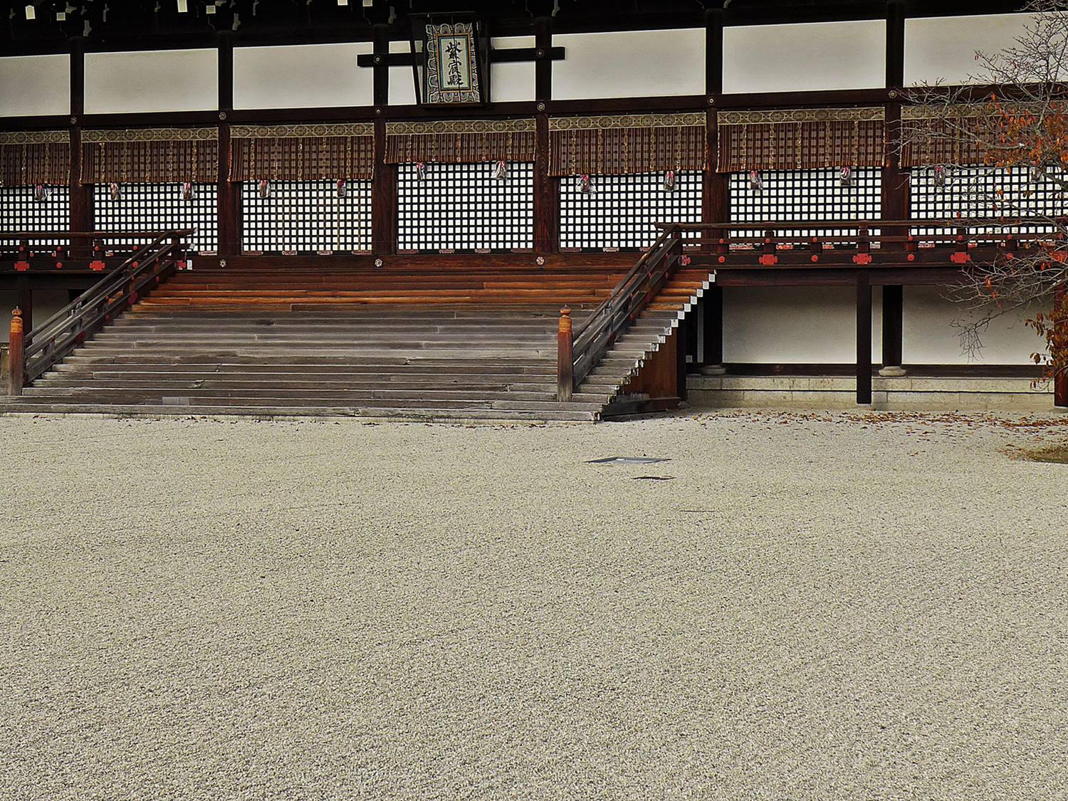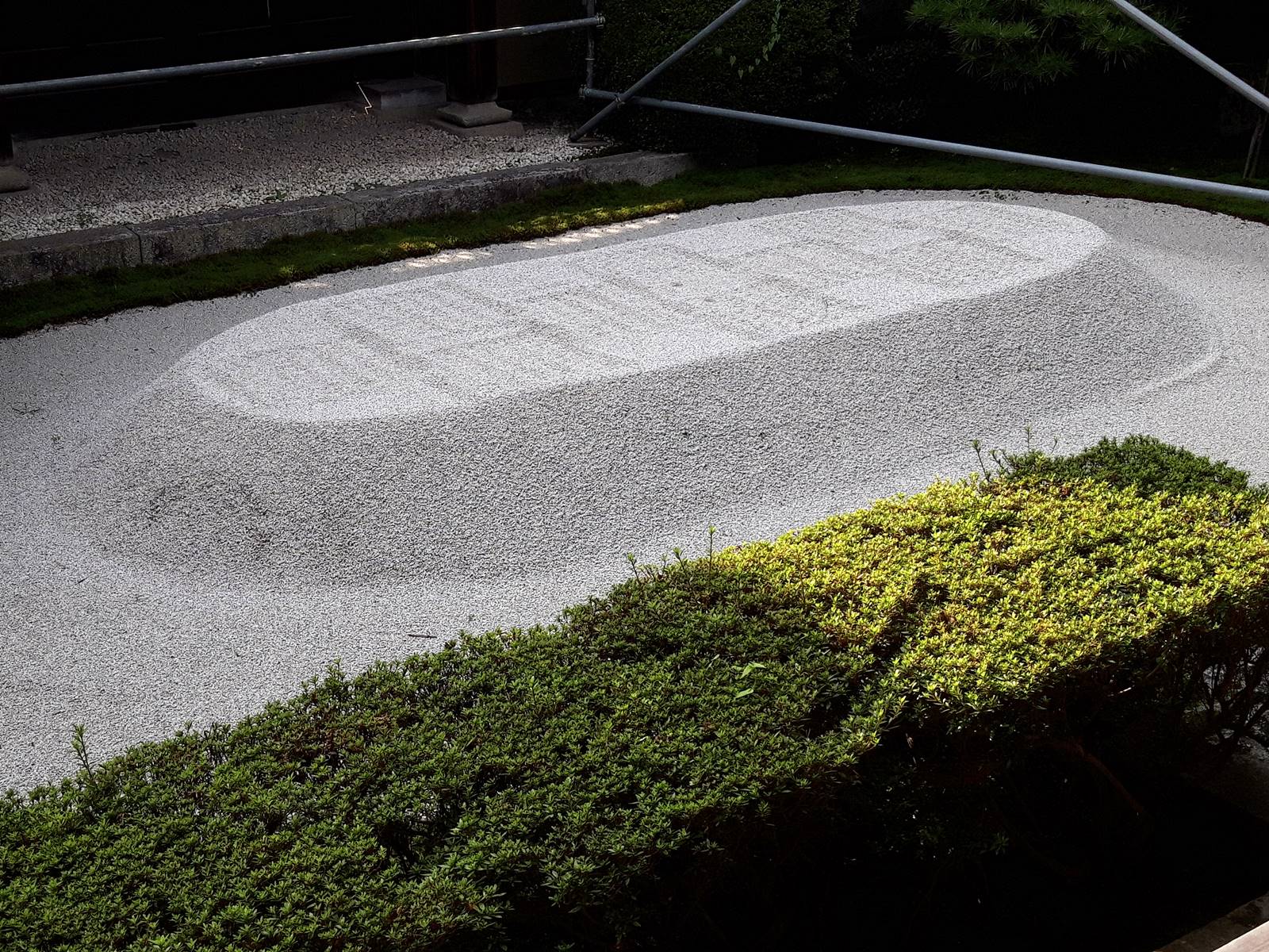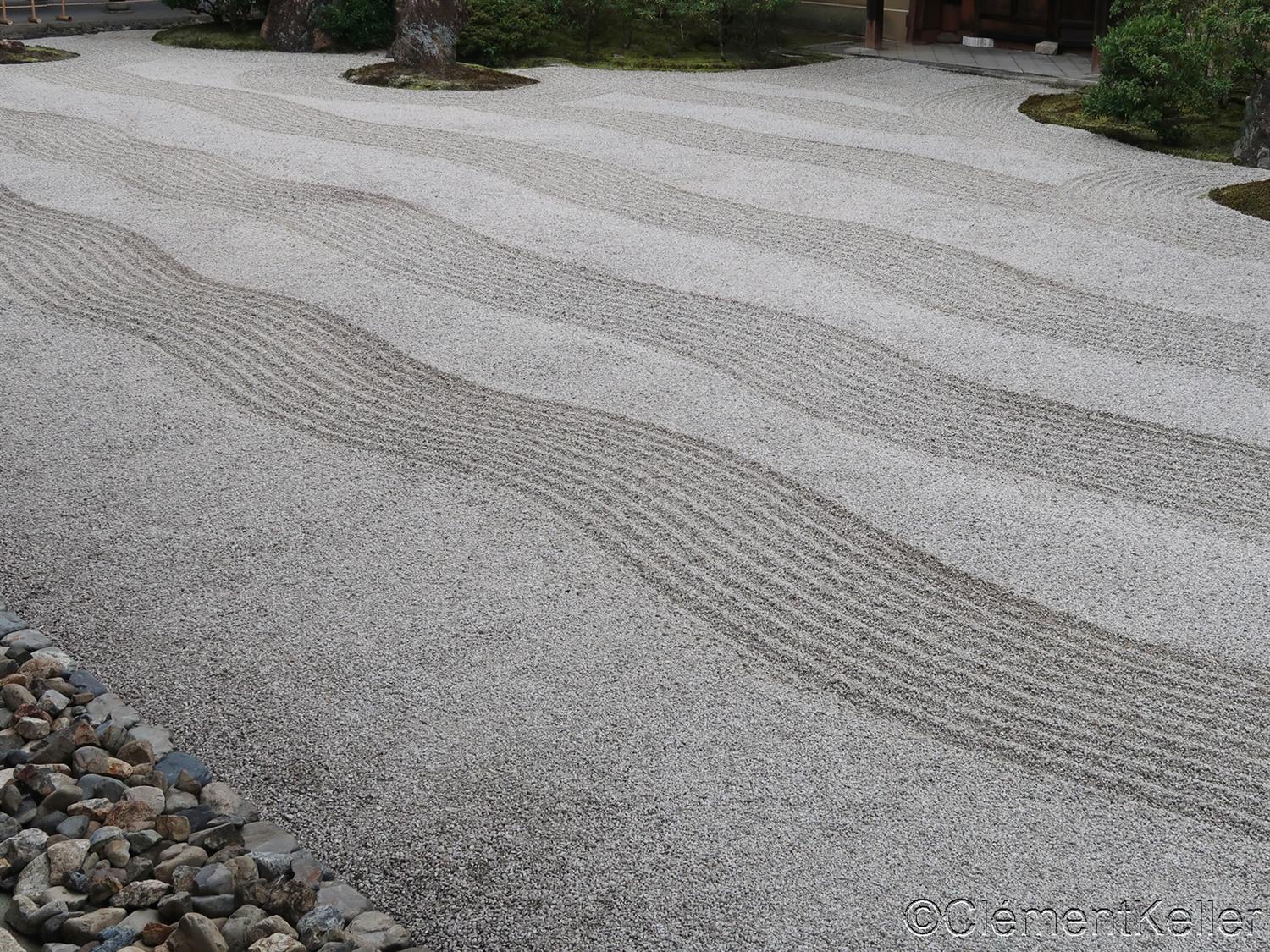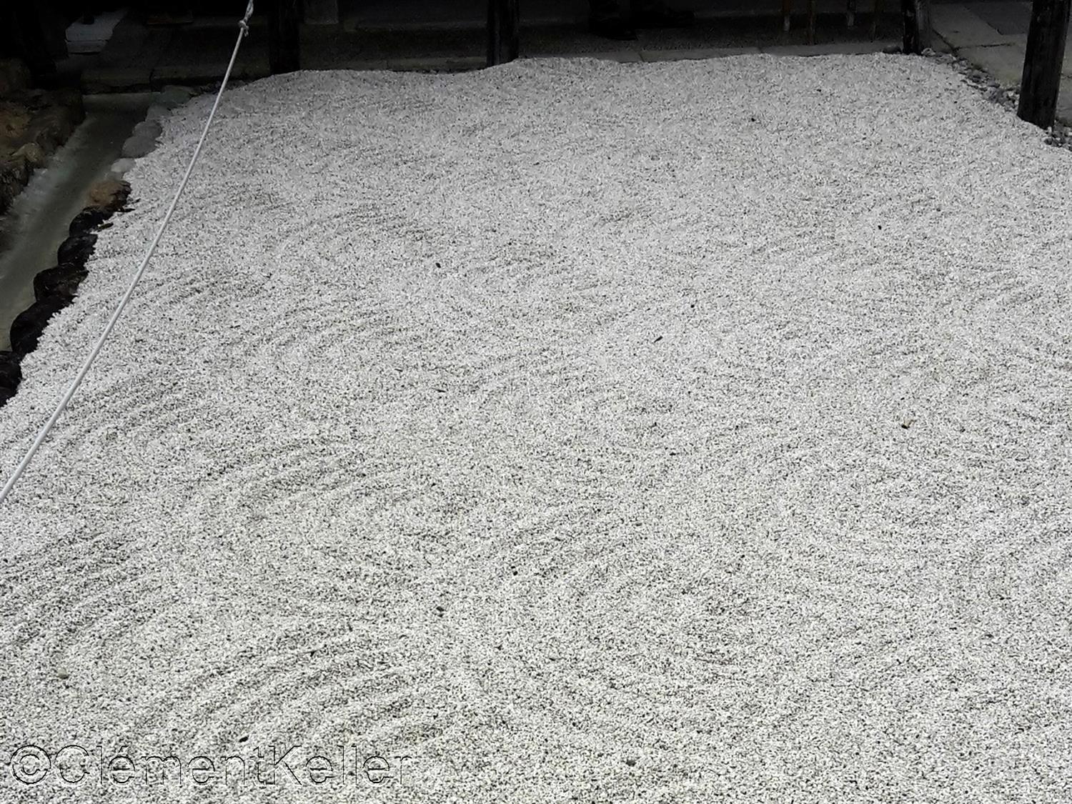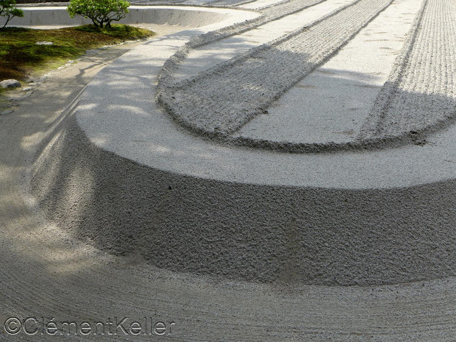 La seconde photo aussi prise au Ginkaku-ji est celle de la grande étendue de sable Ginshadan 銀沙灘, ce qui signifie « mer de sable d’argent ». Elle est constituée d’une large surface horizontale durélevée, soigneusement ratissé en lignes parallèles structurées, et évoque une mer calme.