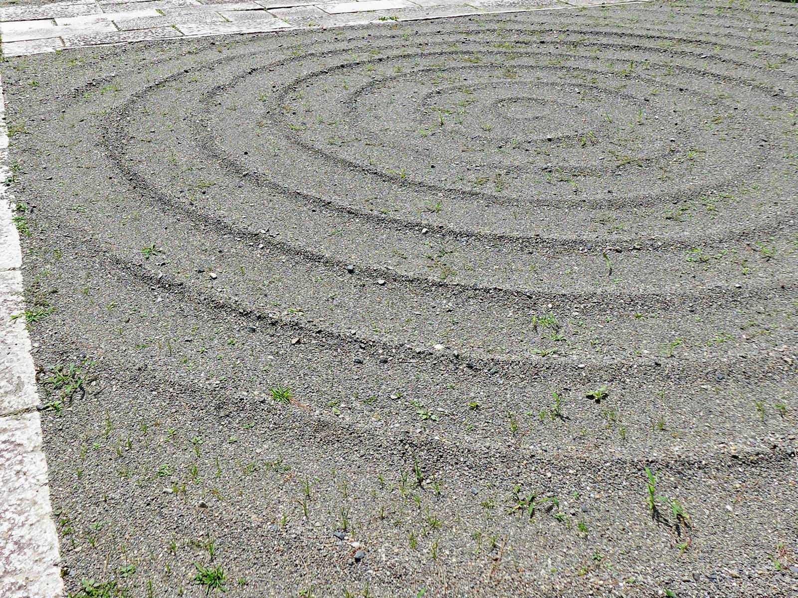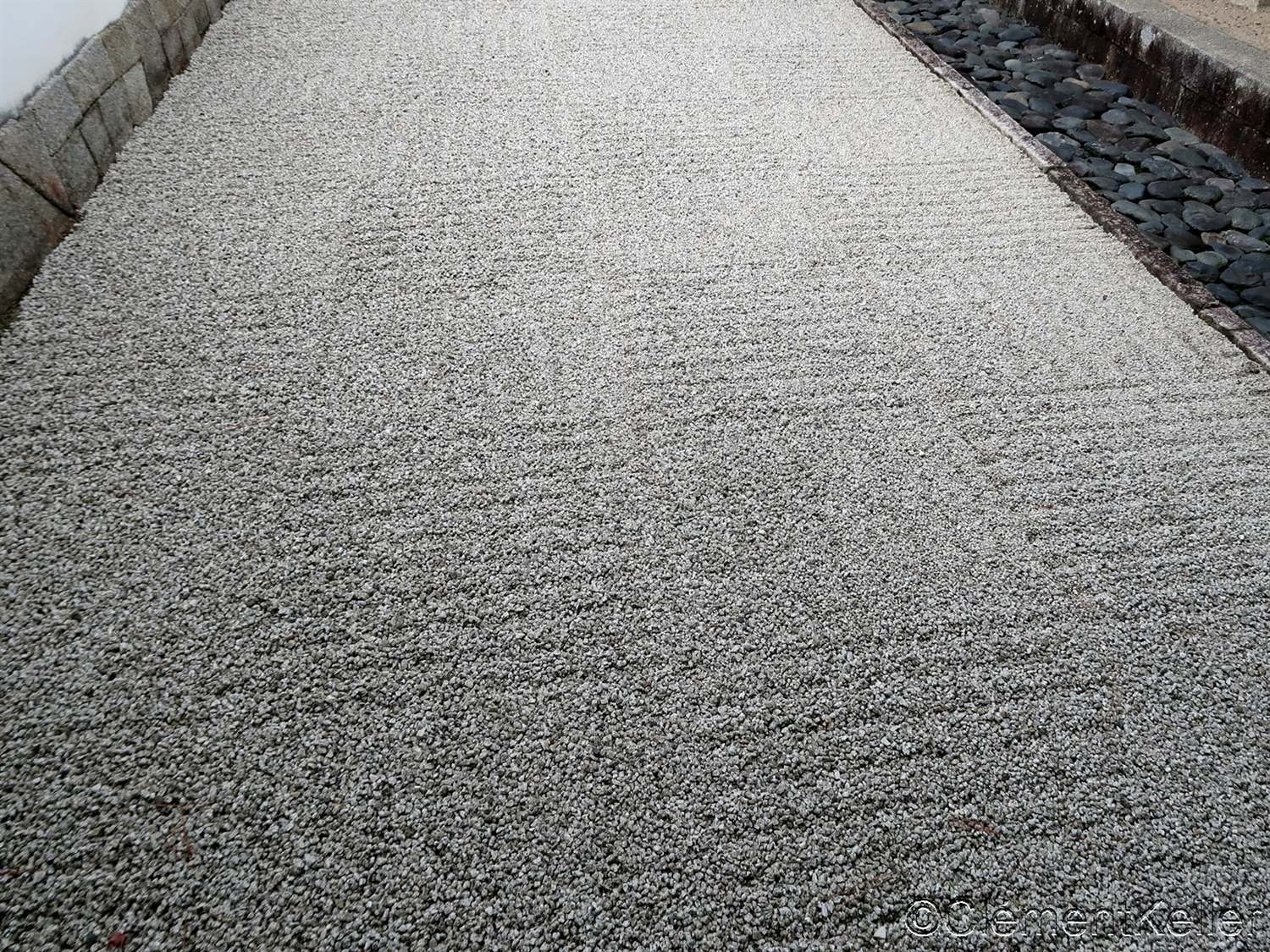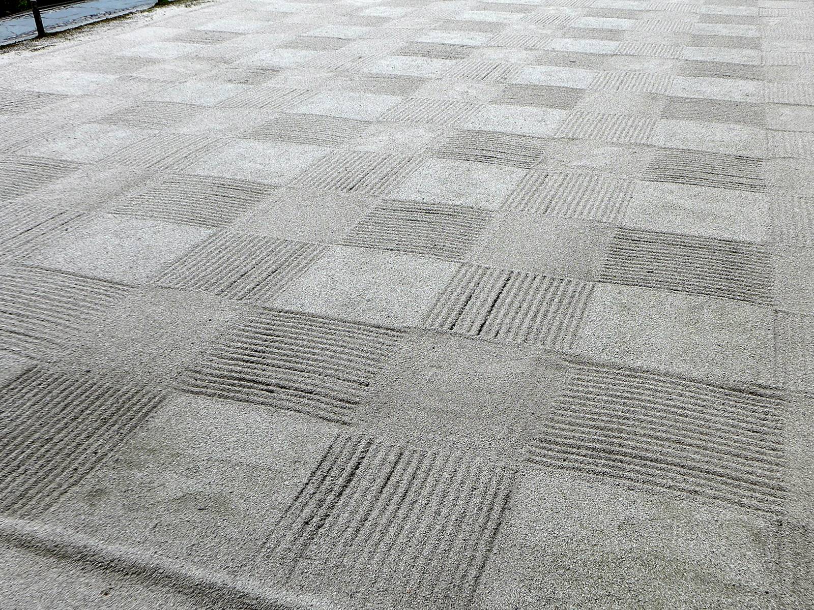 Lorsque la surface de la cour ou du temple n’est pas couverte de sable ou de gravier, mais d’une simple étendue de terre, un balayage régulier est néanmoins nécessaire. Ci-dessous deux exemples de balayage soigné, en lignes parallèles au sanctuaire Udo-jingū au Sud de Miyazaki et en lignes courbes au temple Ishite-ji à Matsuyama.