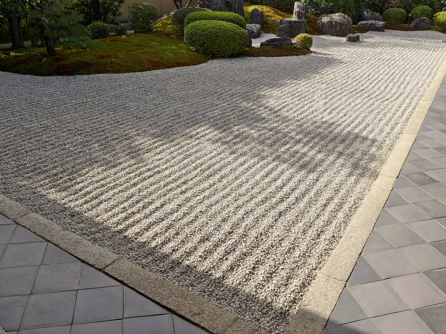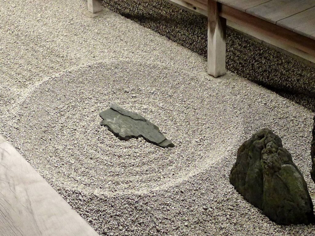 Pour le moine qui a en charge l’entretien du jardin sec de son temple, tracer le motif de ratissage n’est pas seulement un geste de restauration, mais une méditation en mouvement, soit une autre forme de la pratique du “zazen”.