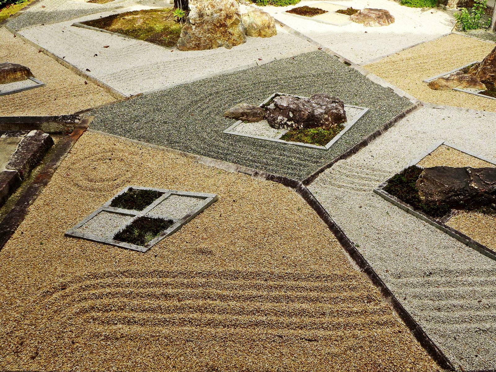 Les motifs particuliers ci-dessous sont présents au temple Ginkaku-ji à Kyōto, à la résidence Takayama Jinya à Takayama, dans deux jardins du temple Zuihō-in, aux temples Tōfuku-ji, Reiun-in, ces deux jardins ayant été dessinés par Mirei SHIGEMORI, Hompō-ji, Enkō-ji et Shinnyo-dō créé par Chisao SHIGEMORI en 2010 à Kyōto.