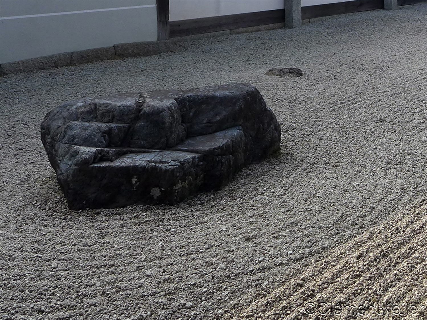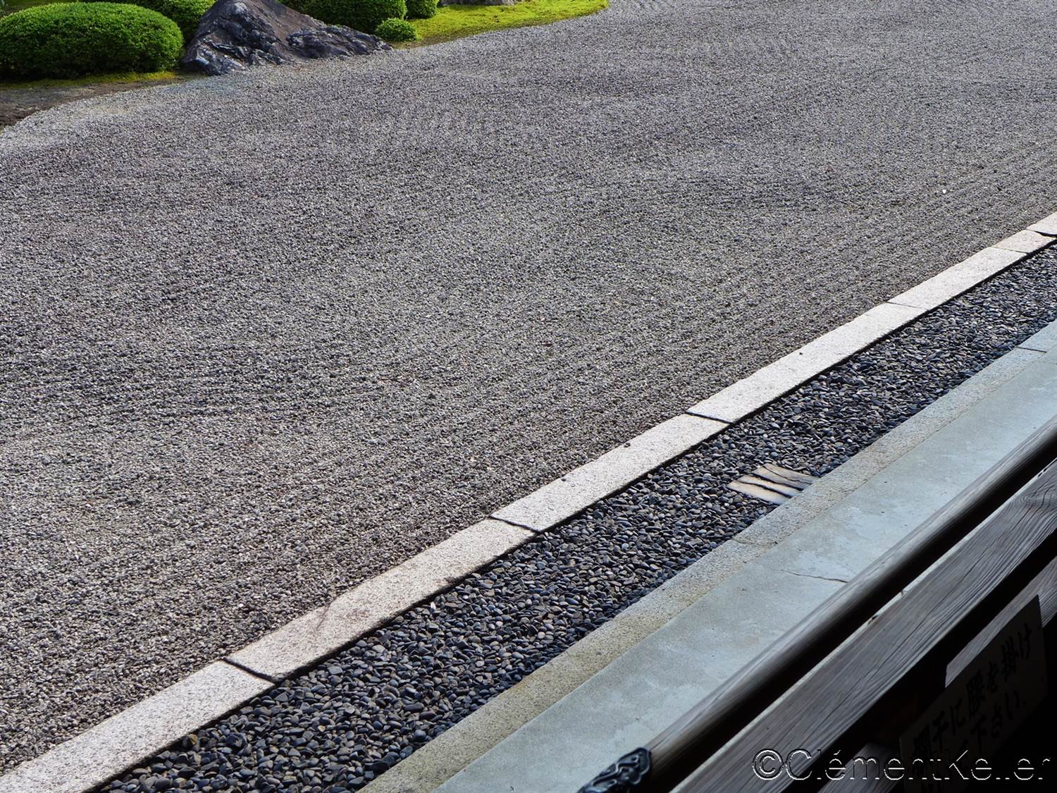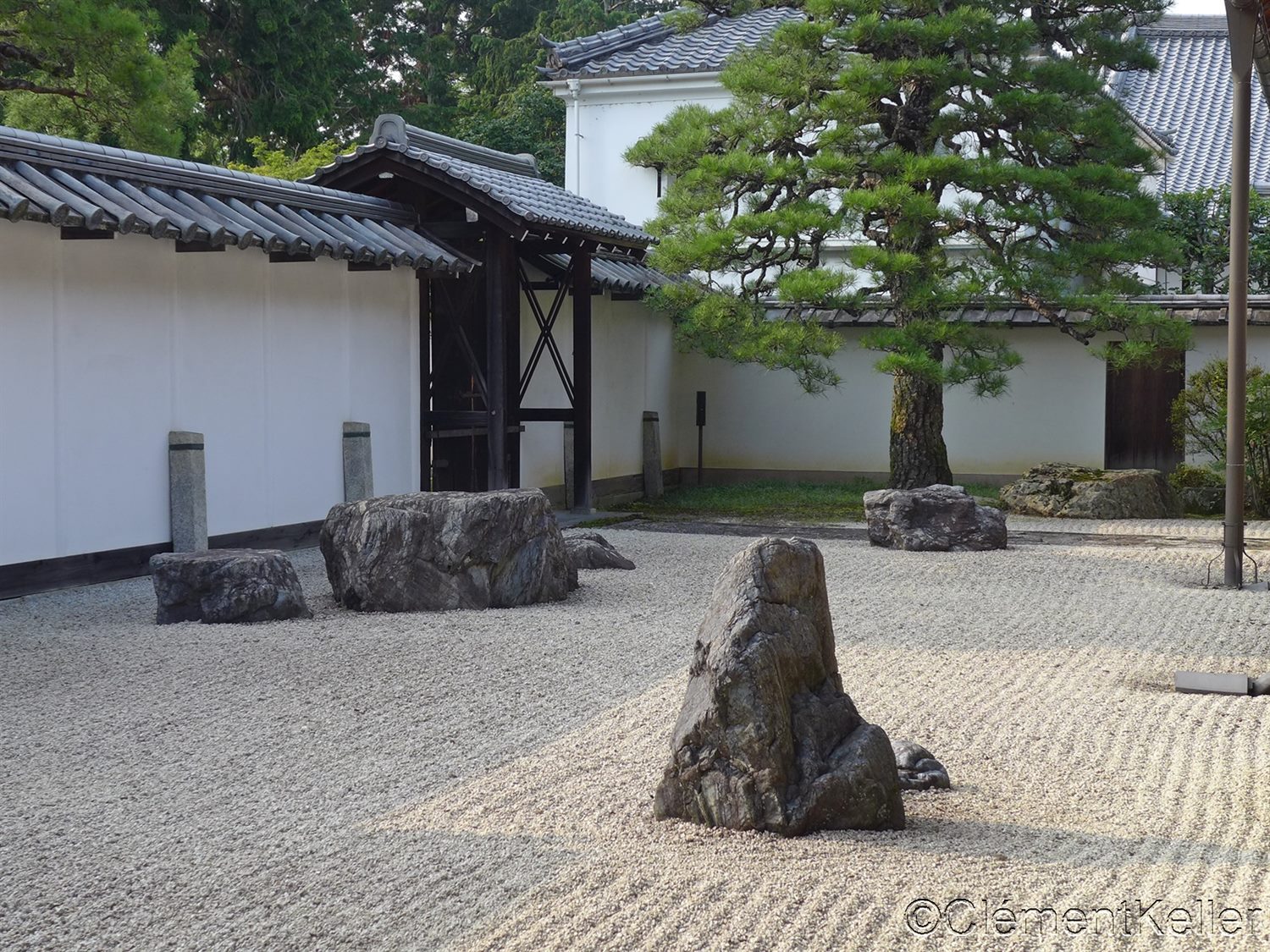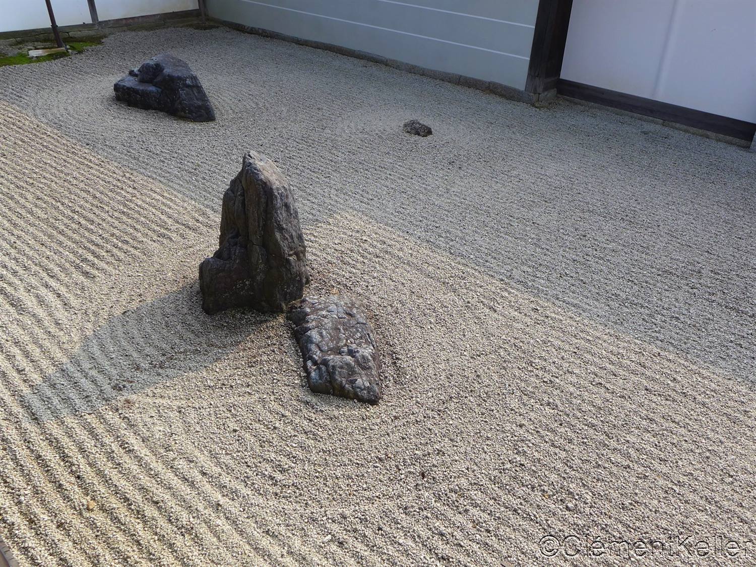 Le petit jardin Hōjō « Jōshintei » 小方丈「承心亭」庭. Dans ce jardin intime, les pierres sont disposées pour suggérer le caractère du coeur « kokoro » 心. Cette évocation souligne l’importance de l’esprit éveillé dans la méditation zen. L’agencement minimaliste, renforcé par le contraste entre les pierres foncées et le sable clair, incite le visiteur à se tourner vers sa propre intériorité.