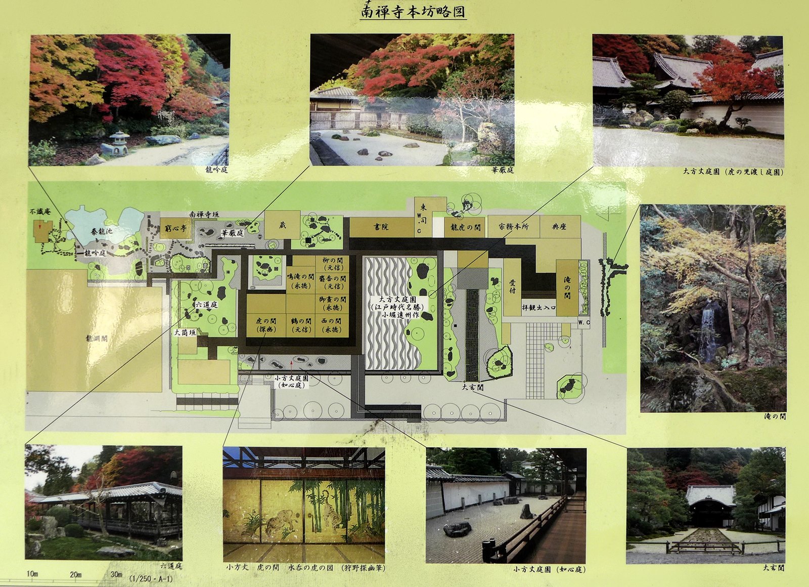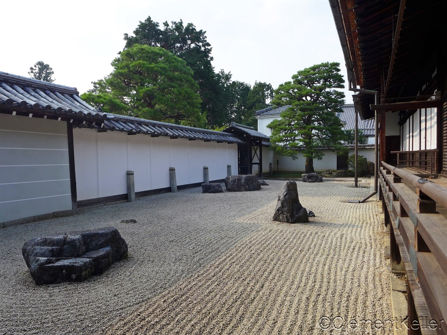 Le jardin Daihojō « Tora-no-ko watashi niwa » 大方丈「虎の子渡し」庭, ce qui peut se traduire par « Le jardin du passage du tigre et de ses petits », est le plus célèbre. Créé par Kobori Enshū 小堀遠州 (1579-1647), ce jardin sec « karesansui », connu sous le nom de « Jardin du Tigre bondissant », représente une tigresse traversant une rivière avec ses petits. Dans le bouddhisme, la tigresse symbolise la protection maternelle et la transmission de la sagesse. Esthétiquement, la sobriété des énormes pierres allongées sur un sable blanc soigneusement ratissé en ondulations, crée un équilibre subtil entre force et délicatesse. Ce jardin a été désigné « site pittoresque national » en 1951.