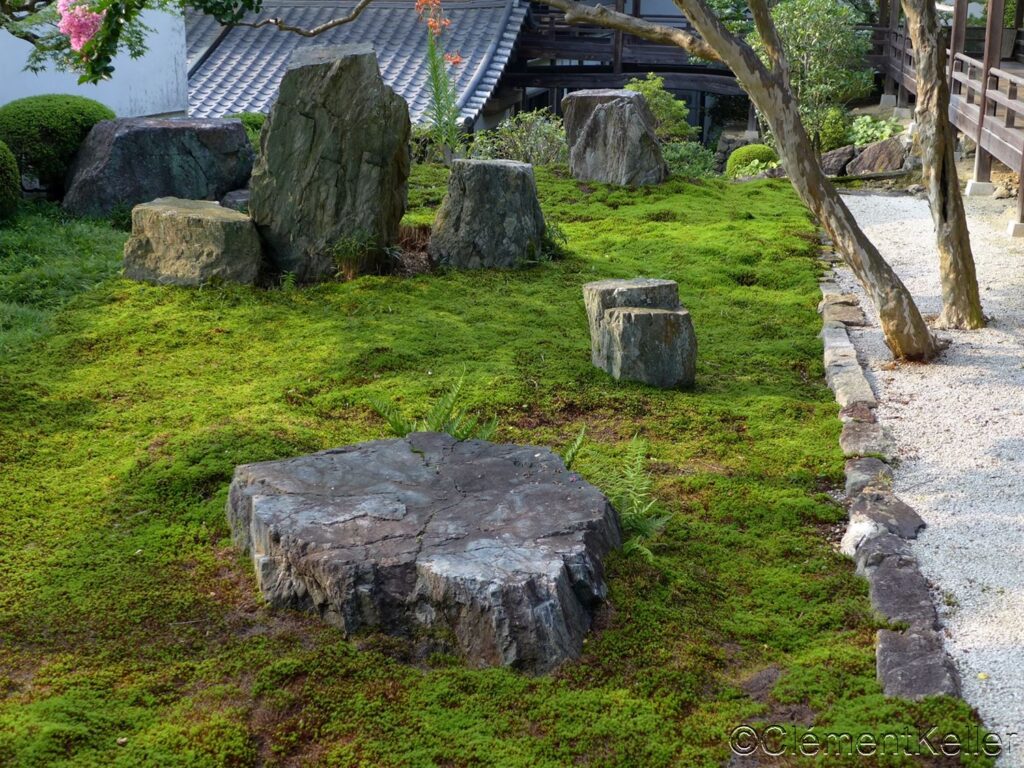 Le Jardin des six allées « Rokudō-niwa » 六道庭 a été réalisé en 1967 par Ueyakato Landscaping. Il fait référence aux six voies de l’existence (dieux, demi-dieux ou titans, esprits affamés, êtres des enfers, animaux et humains). Les pierres et la mousse, qui a presque progressivement et totalement recouvert la surface du jardin, expriment à la fois les cycles de la réincarnation et la possibilité de s’élever vers l’éveil. Sur le plan esthétique, la douceur veloutée des monticules de mousse contraste avec la rigueur des rochers. Ce jardin est entouré sur deux côtés d’une palissade en bambous.