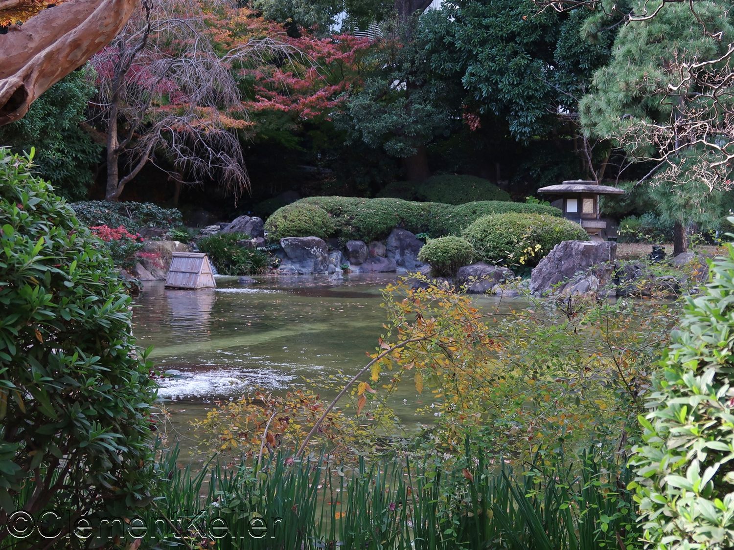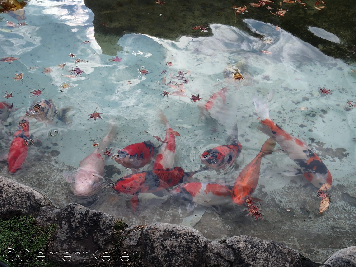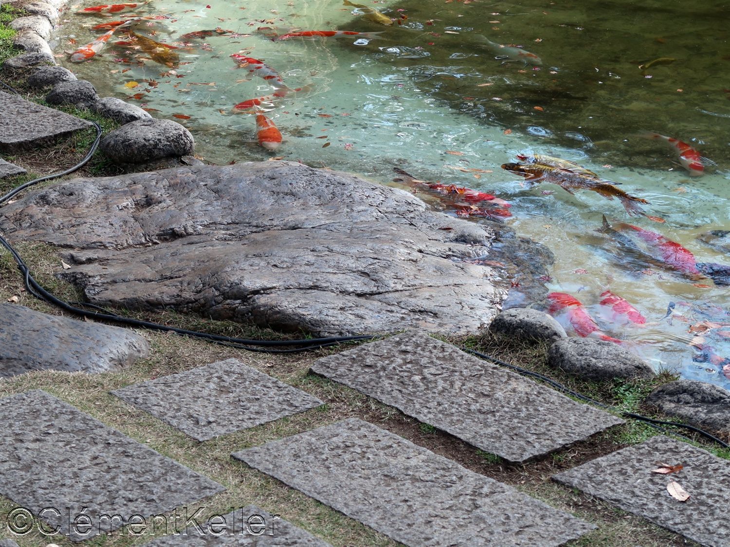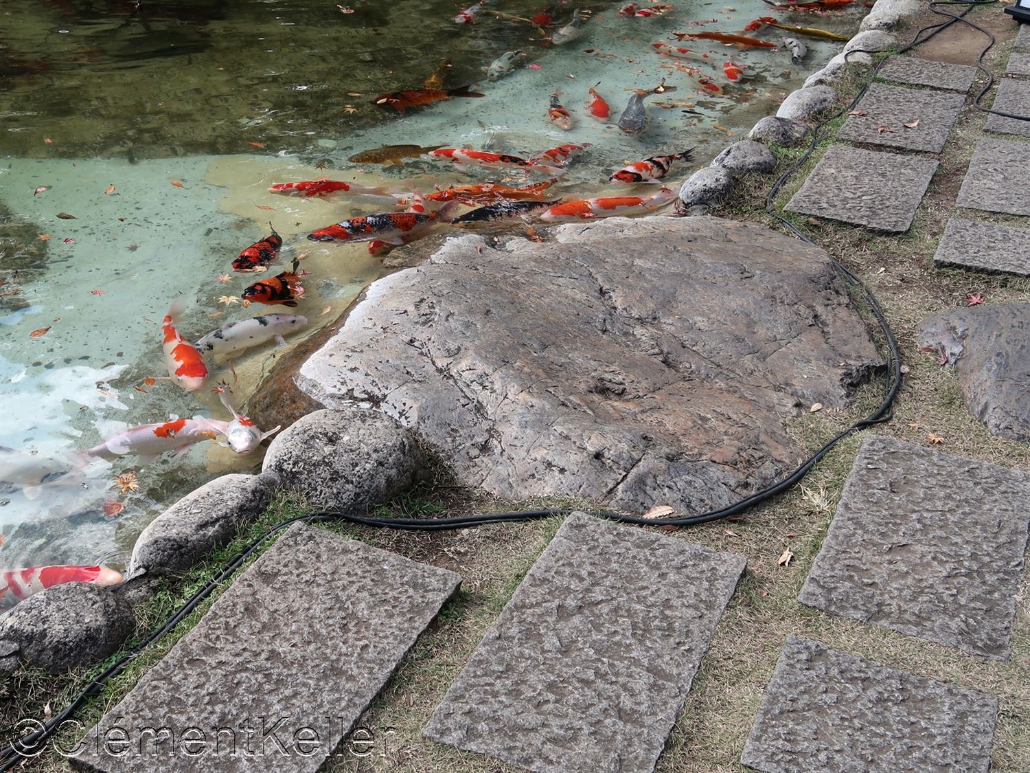 La composition du jardin repose sur un étang central « chi-sen » 池 autour duquel s’organise la promenade. Dans ce bassin a lieu deux fois par jour le nourrissage des carpes.