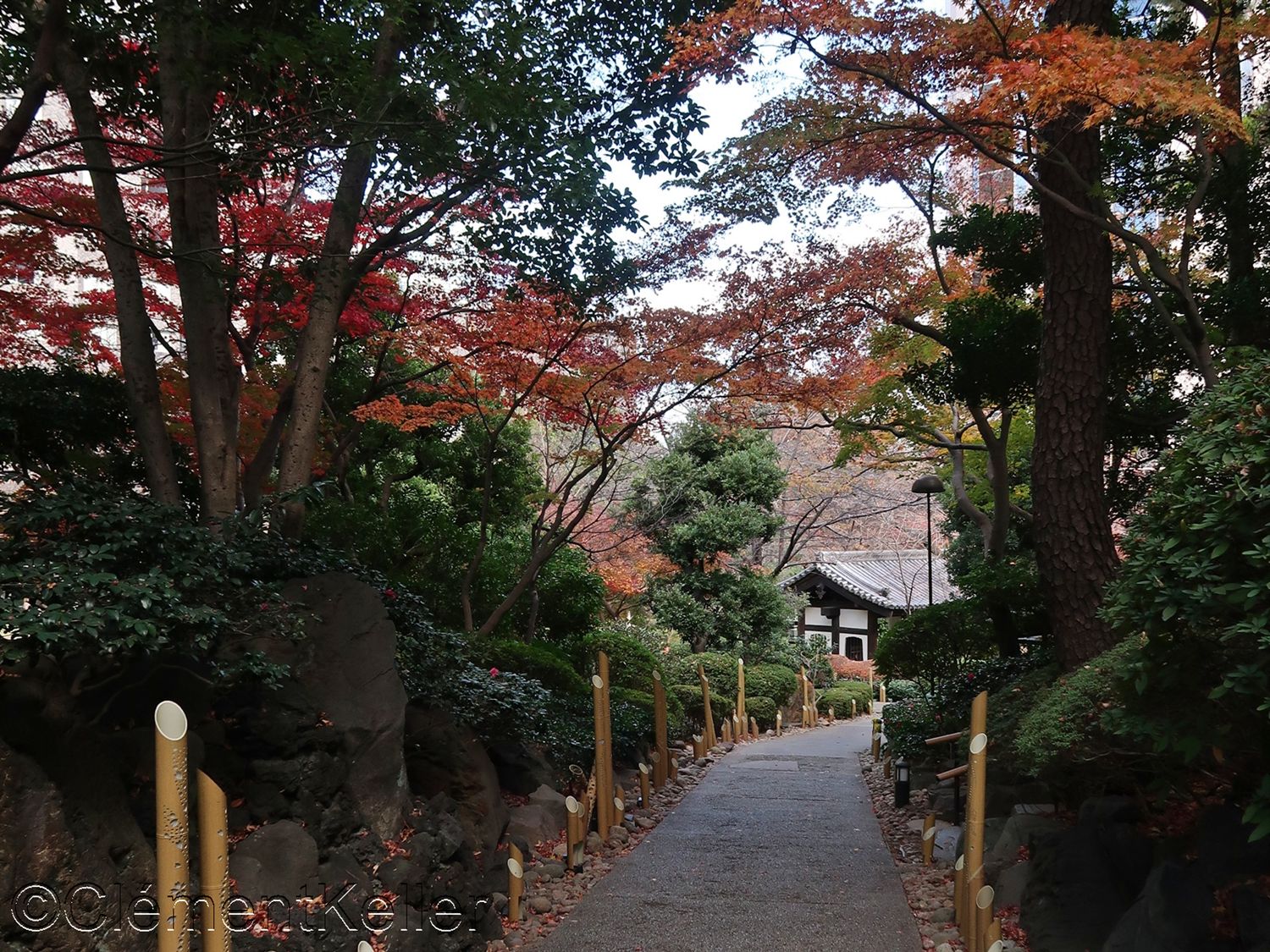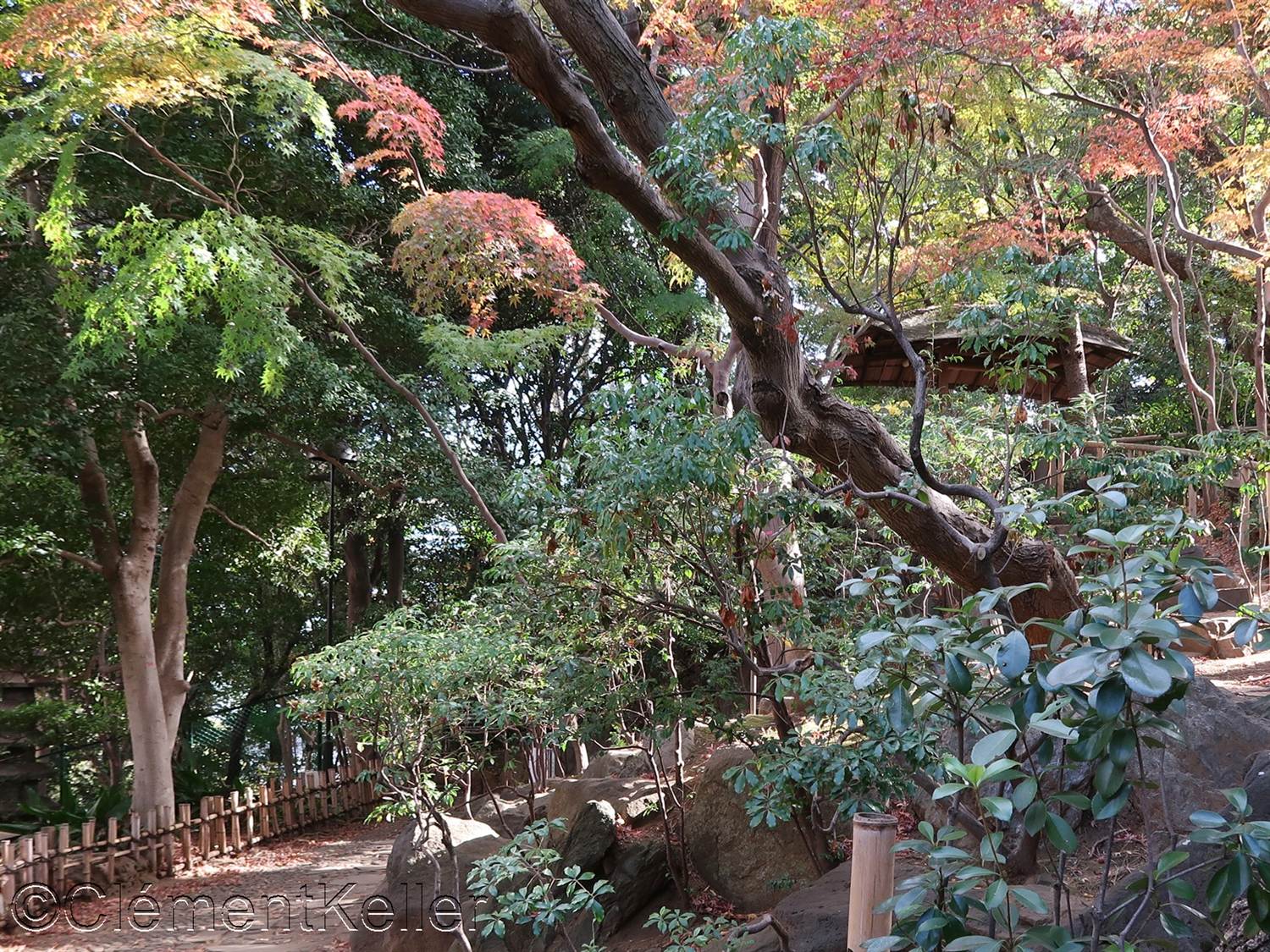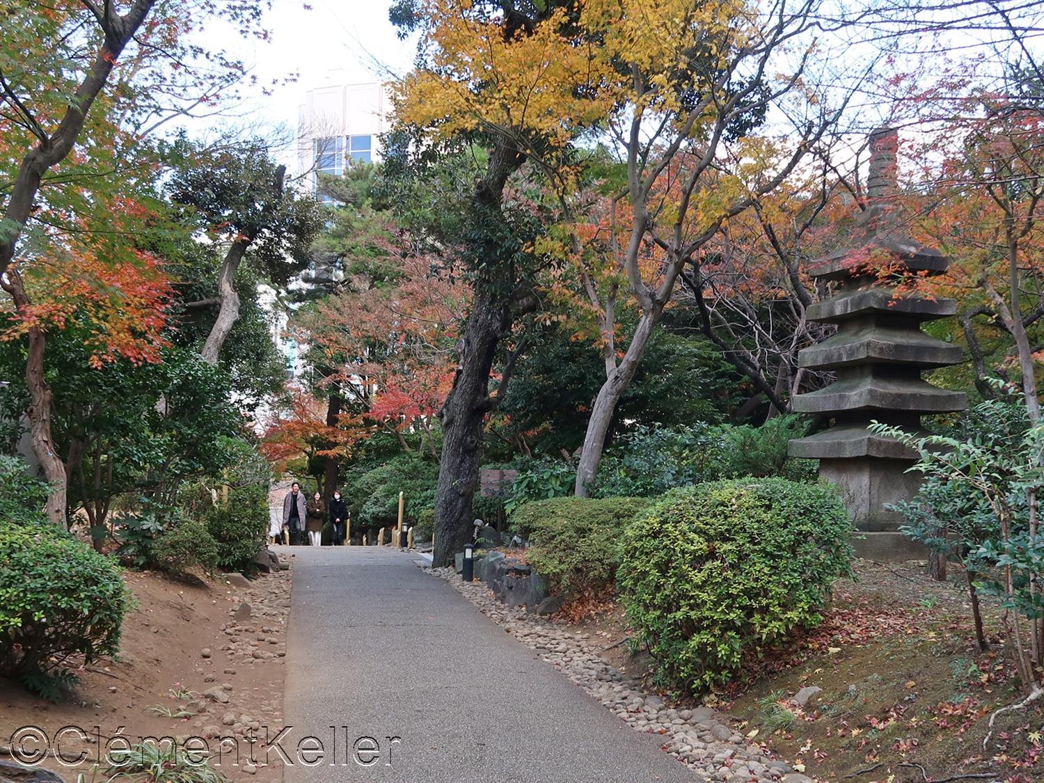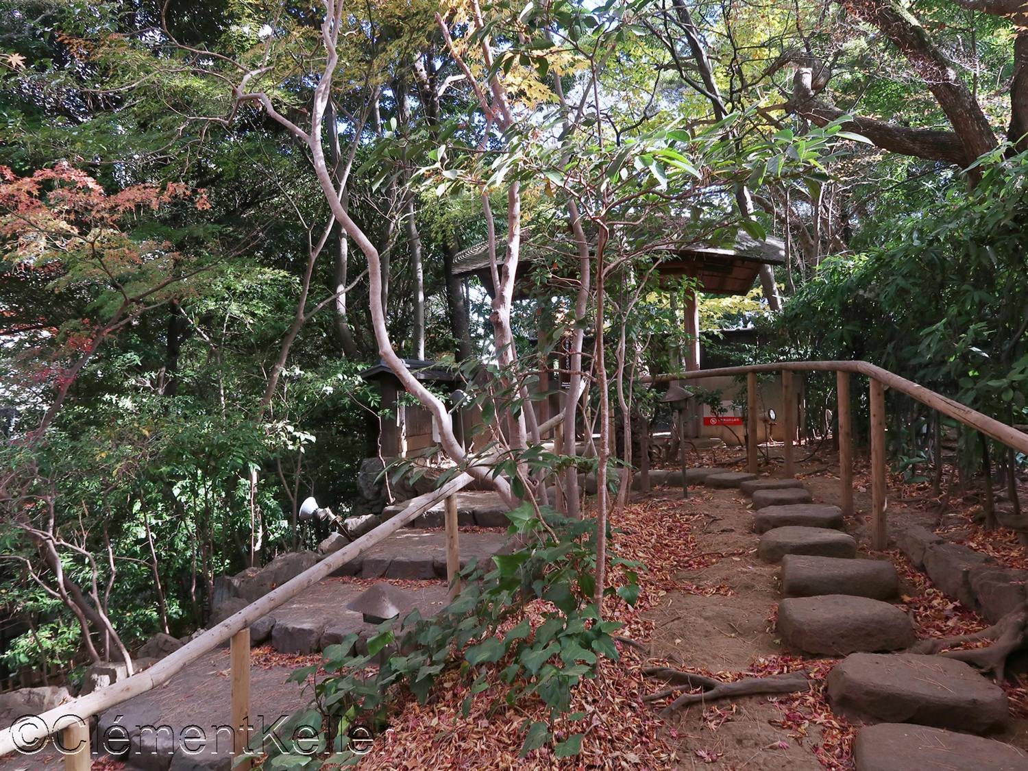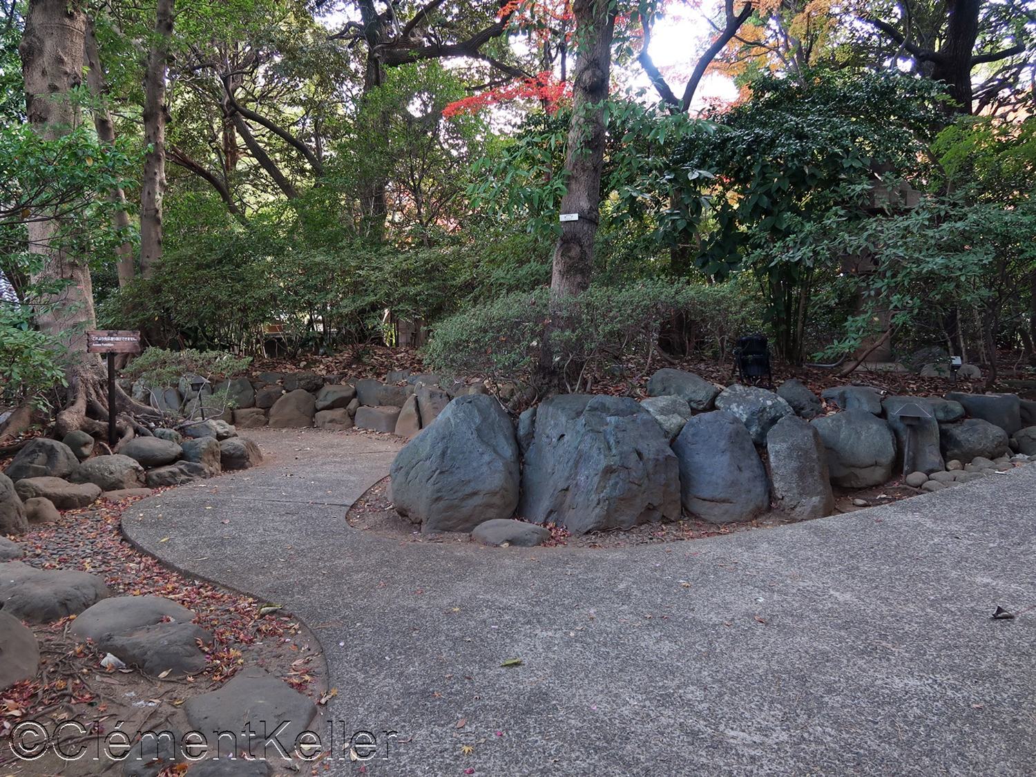 Des chemins sinueux et partiellement en pente traversent des zones boisées. La végétation est composée d’environ 210 cerisiers « sakura » 桜 de 17 variétés, d’érables, d’azalées et d’autres essences assurent une transformation continue du paysage au fil de l’année, renforcée par des illuminations nocturnes appelées « nijurokuya » revisitant la tradition datant de l’époque d’Edo de prier en attendant l’apparition de la lune sur les collines de Takanawa.