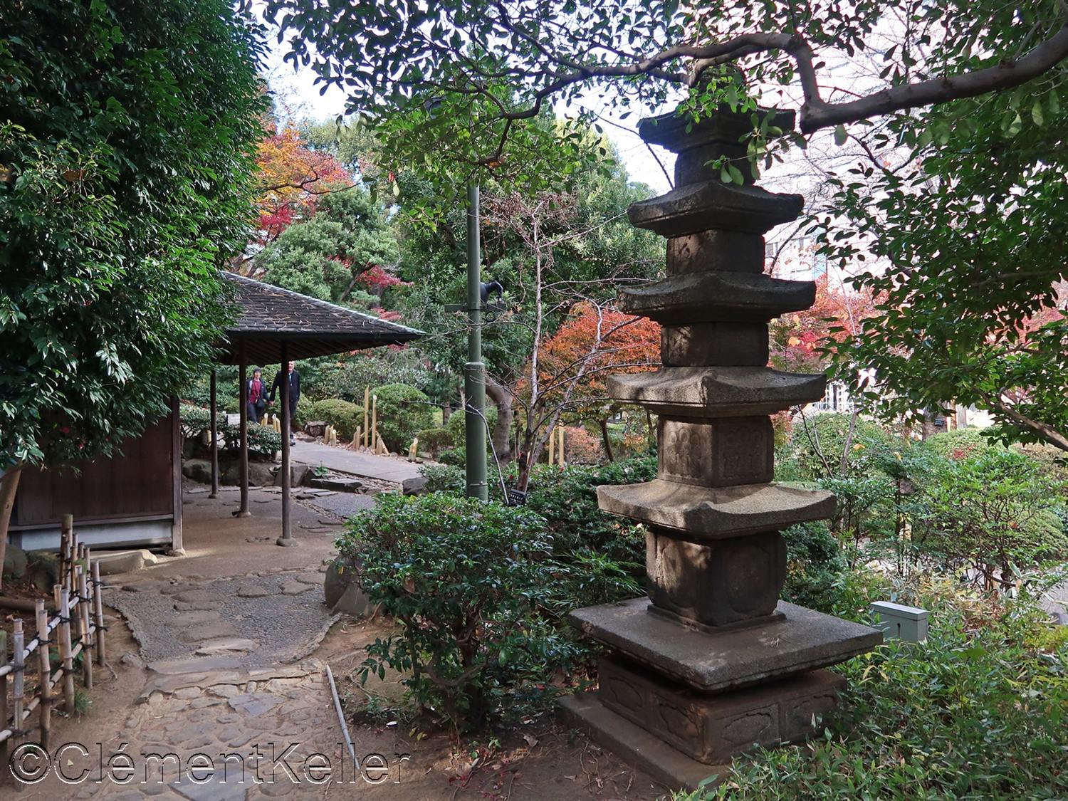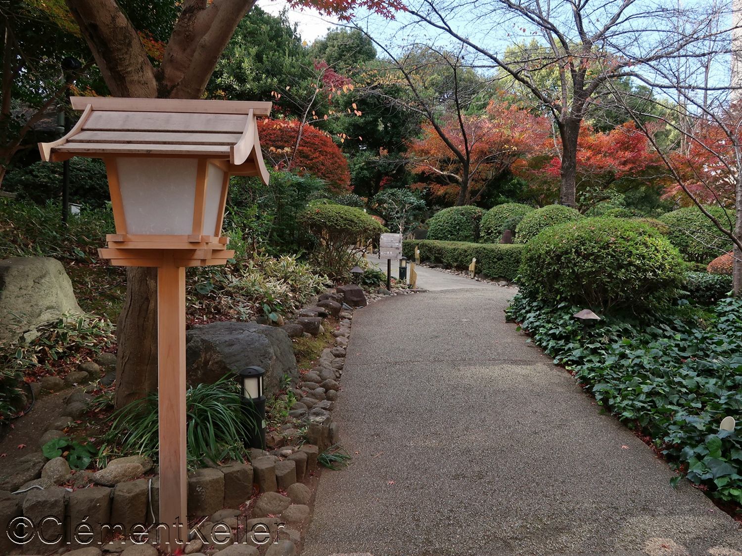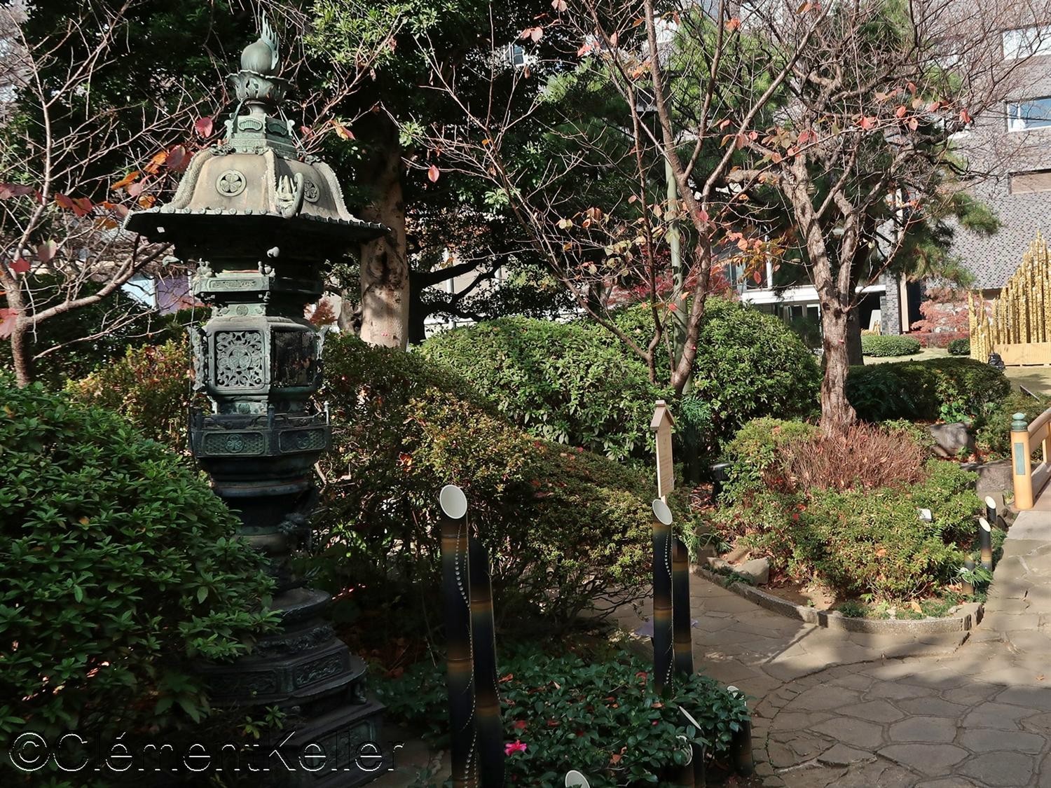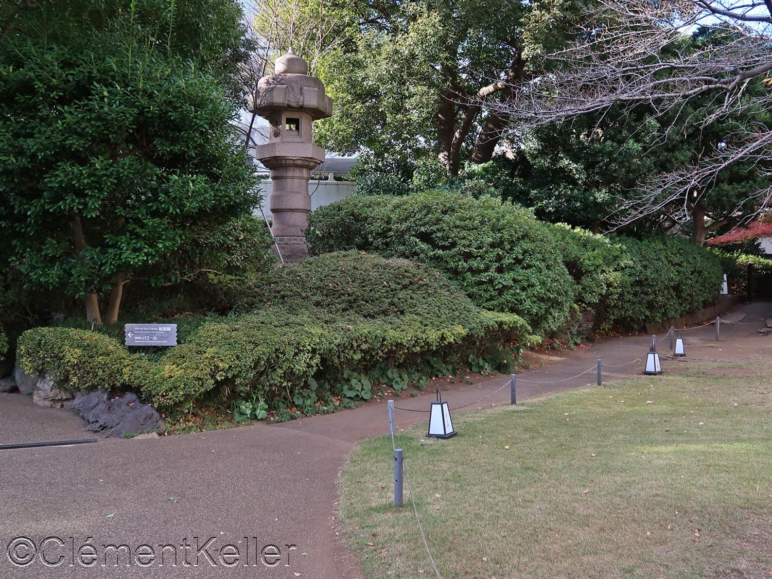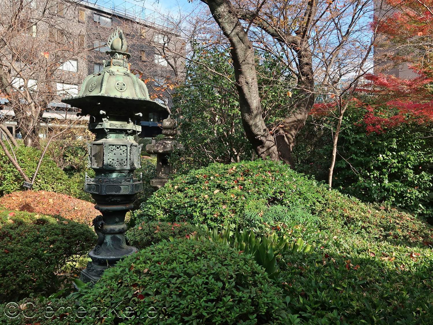 Plusieurs lanternes sont implantées le long des allées. Certaines sont en bronze et l’une d’entre elles provient du mausolée de Tokugawa. Ces lanternes métalliques, parfois ornées de motifs floraux ou géométriques, fonctionnent comme repères visuels, éléments votifs et supports d’illumination nocturne, renforçant une ambiance similaire à un jardins religieux. À ces lanternes s’ajoutent encore d’autres éléments anciens, telles des pagodes en pierre.