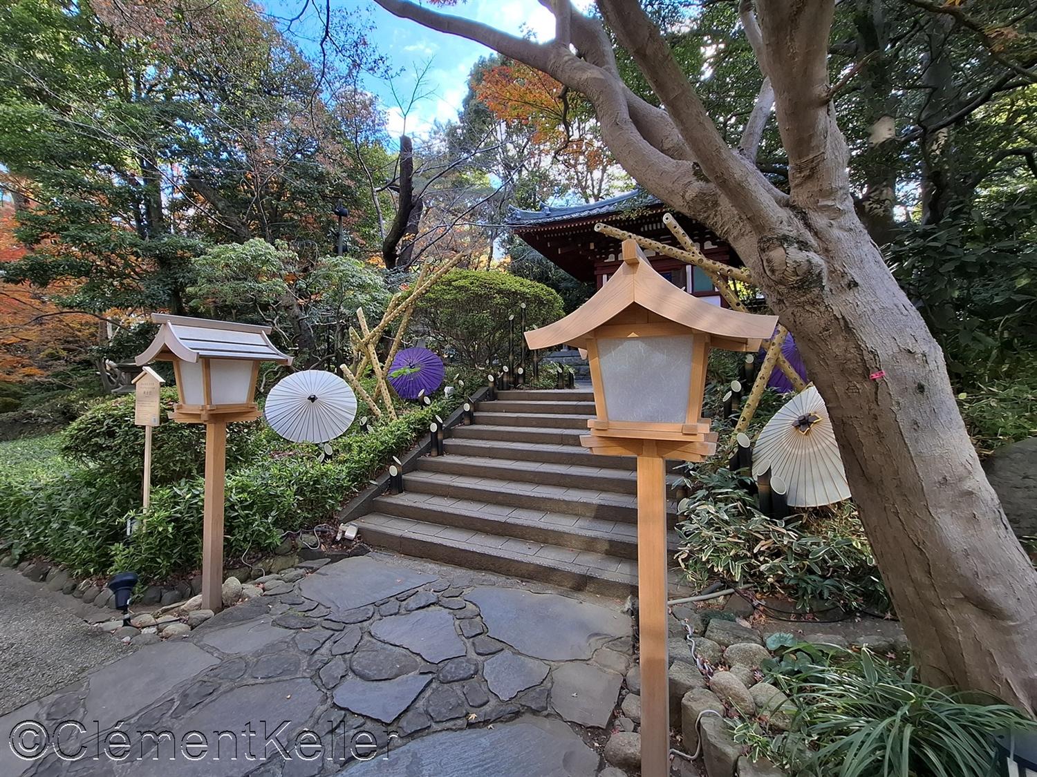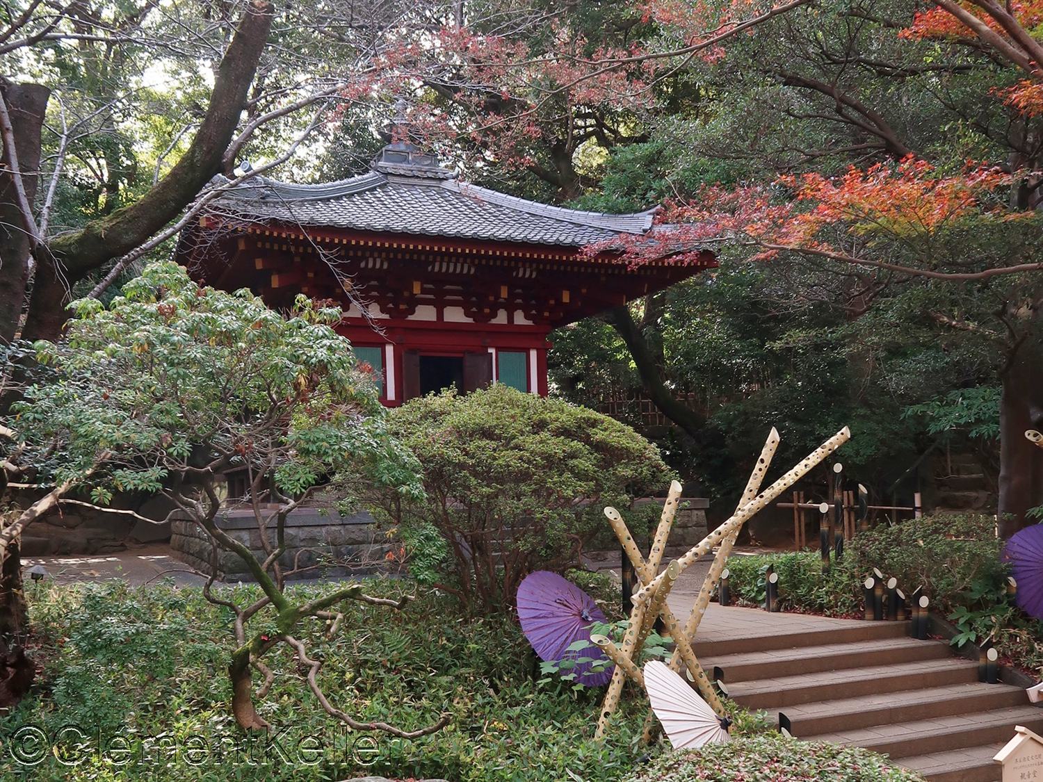 Plusieurs lanternes sont implantées le long des allées. Certaines sont en bronze et l’une d’entre elles provient du mausolée de Tokugawa. Ces lanternes métalliques, parfois ornées de motifs floraux ou géométriques, fonctionnent comme repères visuels, éléments votifs et supports d’illumination nocturne, renforçant une ambiance similaire à un jardins religieux. À ces lanternes s’ajoutent encore d’autres éléments anciens, telles des pagodes en pierre.
