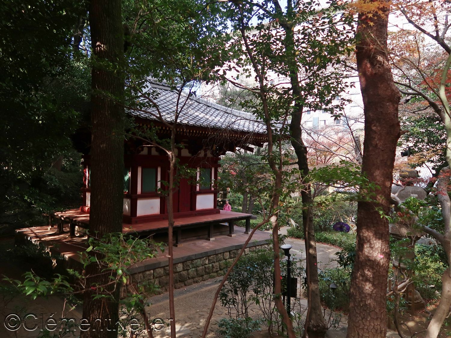 Le jardin intègre plusieurs édifices historiques déplacées, qui lui confèrent une valeur patrimoniale exceptionnelle. Le plus important est la salle Kannon-dō 観音堂 provient d’une pagode du temple Chōkyū-ji 長久寺 d’Ikoma dans la préfecture de Nara. Les deux étages supérieurs de cette pagode ont disparu. L’édifice généralement daté du XIVème siècle avait été déplacé en 1936 à Kamakura plus remonté en 1954 à sa place actuelle. Il abrite une statue de Kannon 観. Le second édifice, implanté dans l’axe de Kannon-do, est un portail de temple dont on ne connait pas la provenance. Le troisième élément placé à proximité du portail est un beffroi datant de 1656 provenant du temple Nenbutsu-ji 念佛寺 de Nara et reconstruit en 1959 sur l’emplacement actuel.