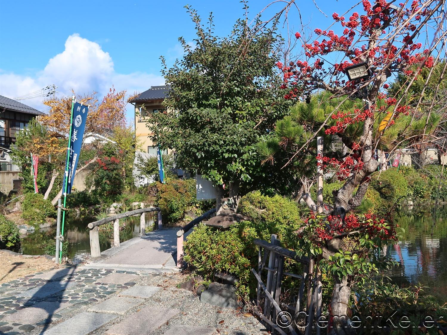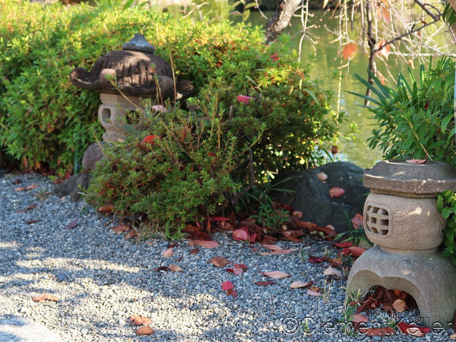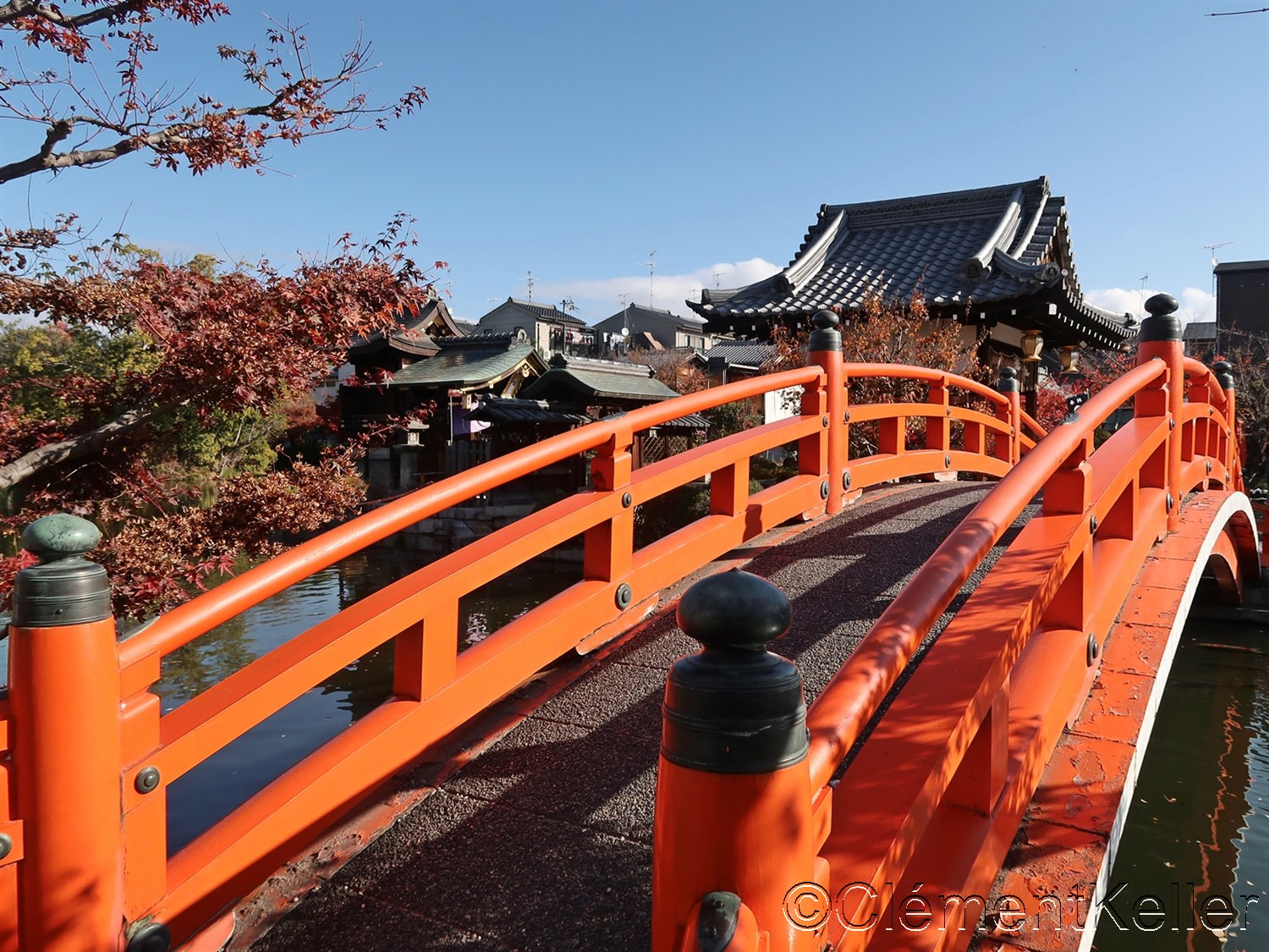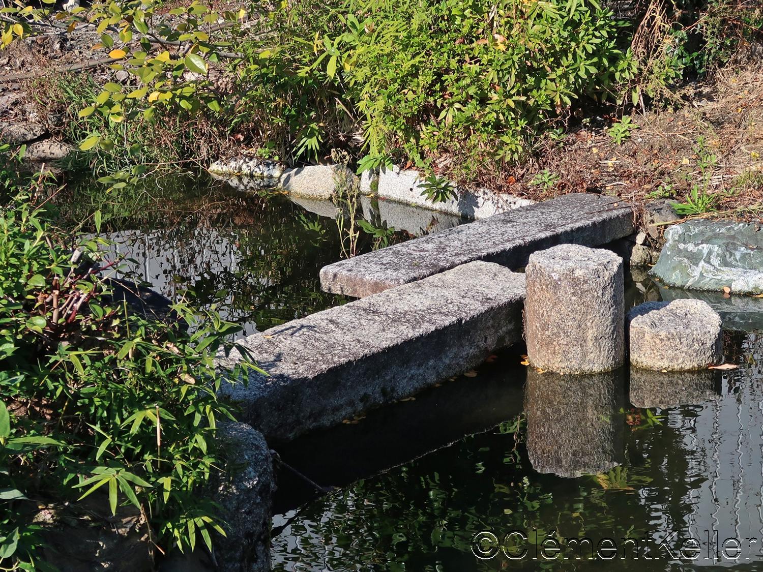 Le pont rouge vermillon Hōjō-bashi 法成橋 traverse l’étang et relie la rive à un petit îlot central. Ce pont légèrement arqué constitue l’axe visuel majeur du jardin. Sa couleur rouge, typique des sanctuaires shinto, se détache fortement de la surface sombre de l’eau et de la végétation environnante.