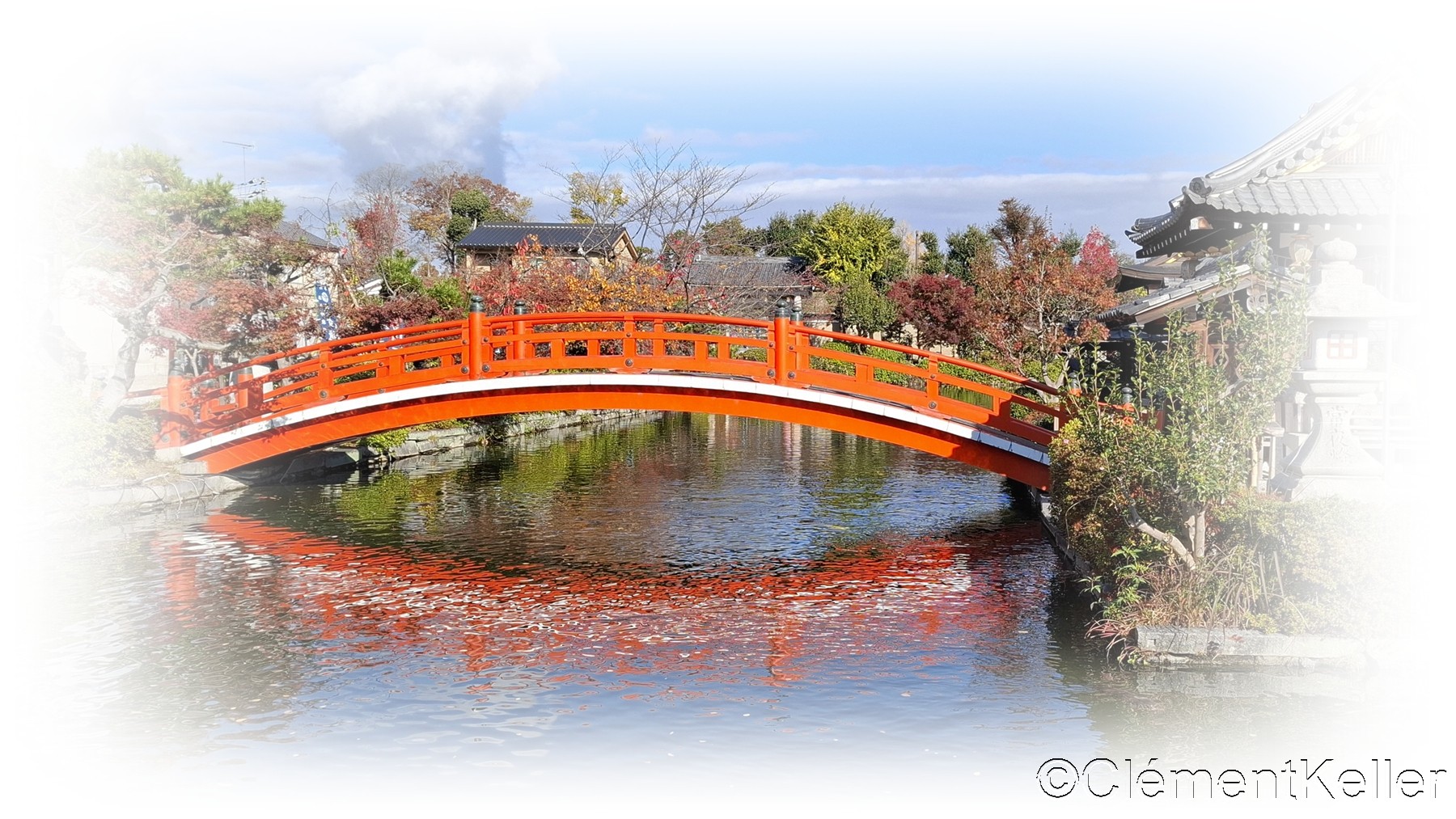 Vues du pont vermillon Hōjō-bashi et du bateau-dragon décoré du même rouge vermillon.